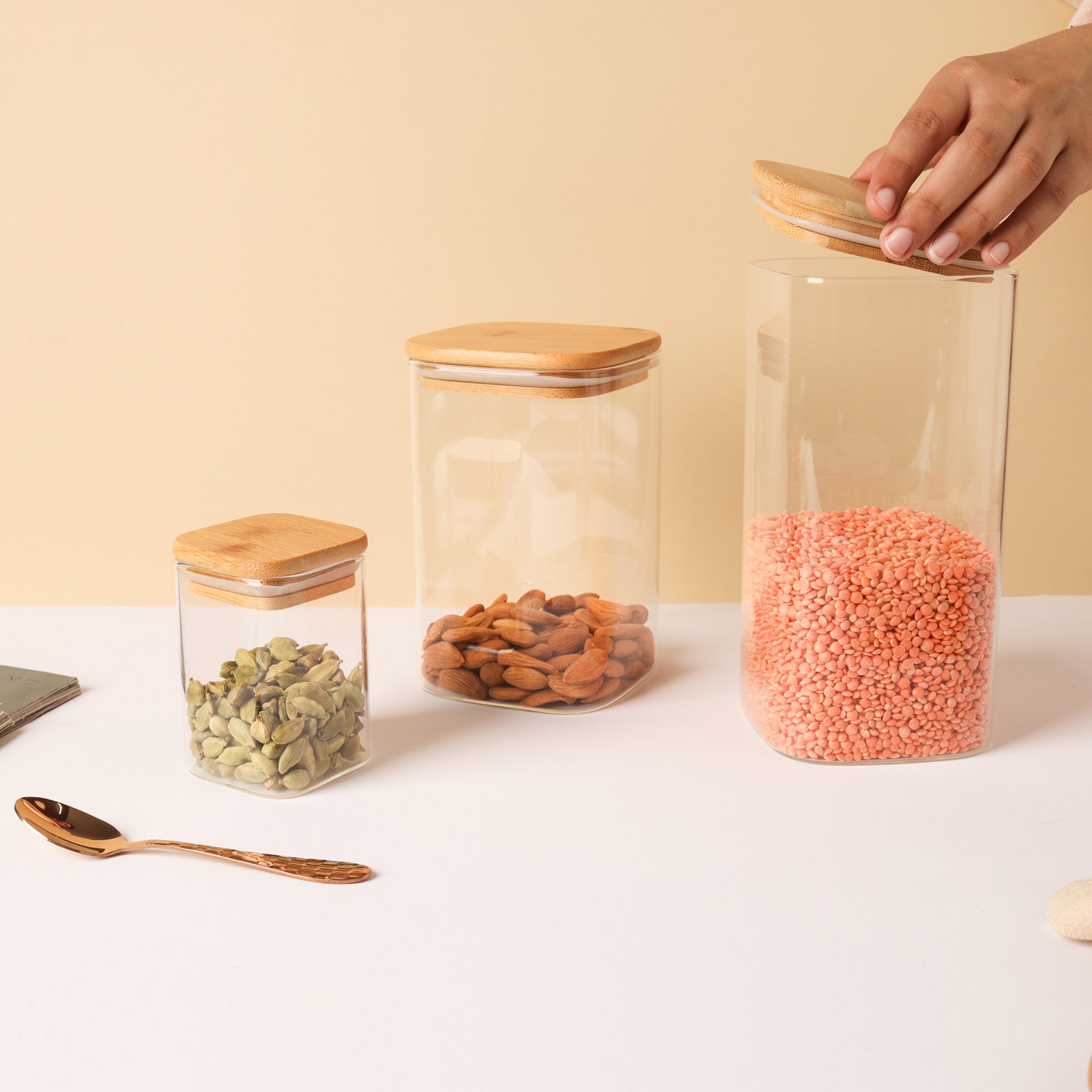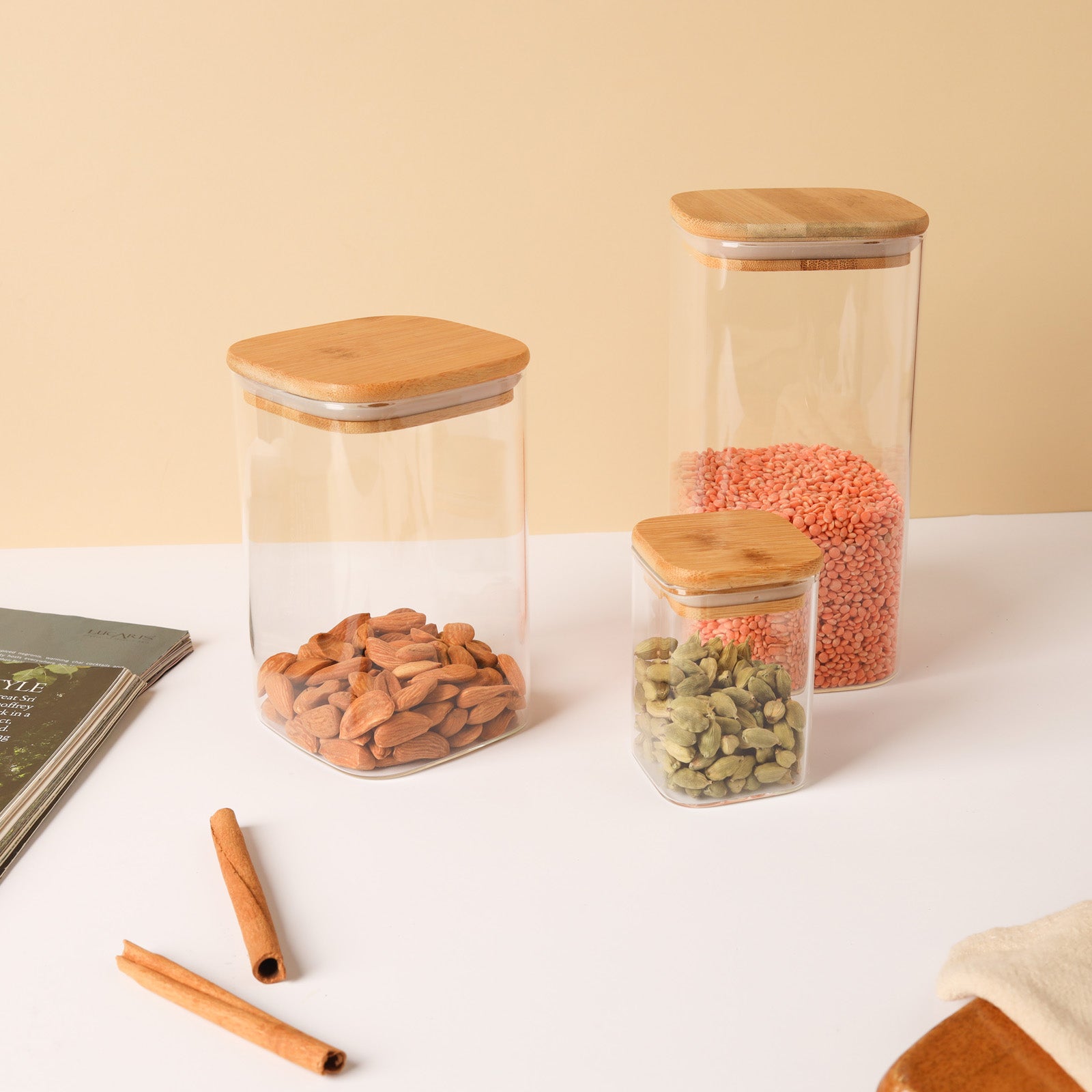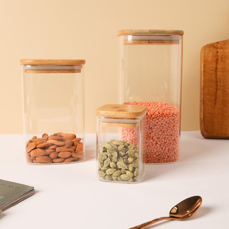 A set of three glass seal boxes is the one-stop answer for all kitchen storage problems. The glass set includes three transparent glass jars of various sizes, each with an airtight cover that seals in the freshness. Glass seal jars can be used to store both snacks and dry staple food like rice grain and pulses and dry fruits as well. The sealed jars keep the food fresh and crisp by preventing it from becoming stale or damp.