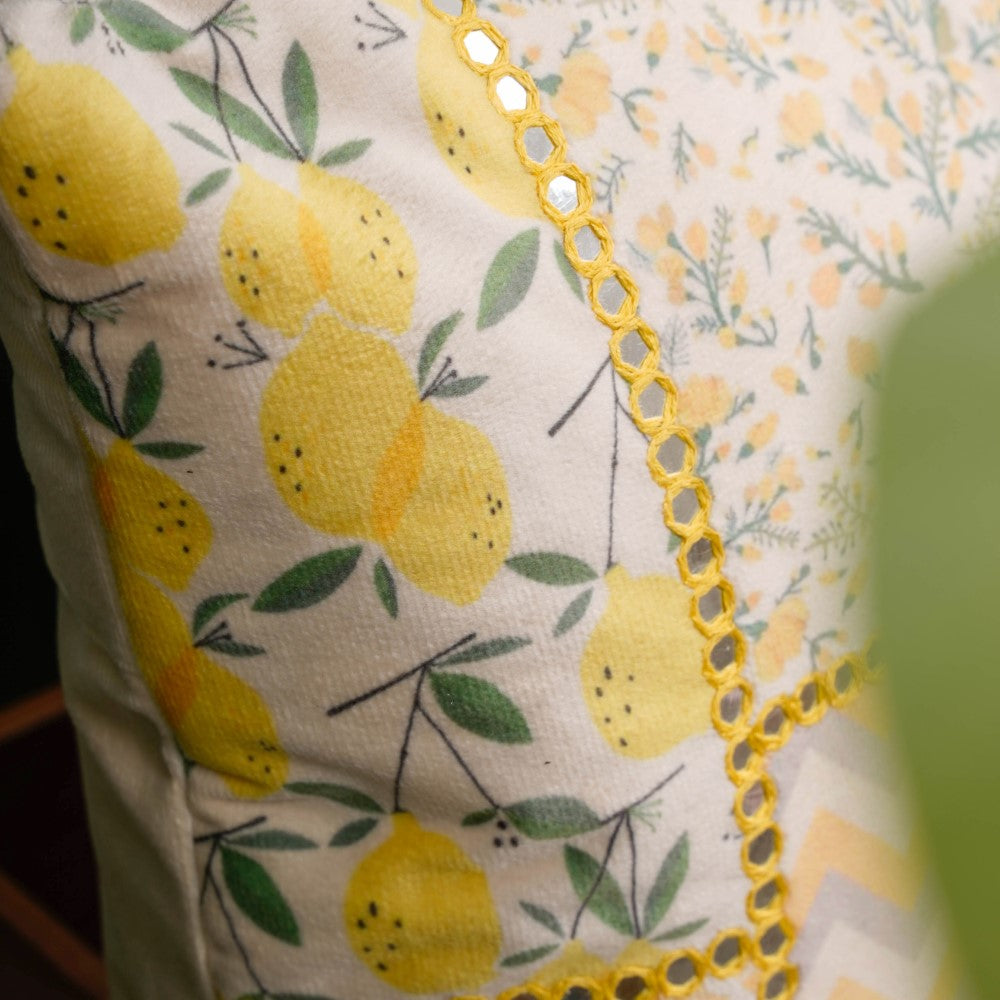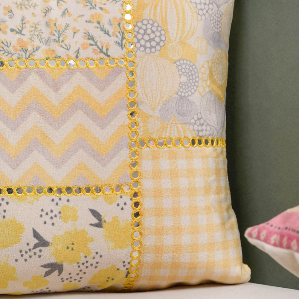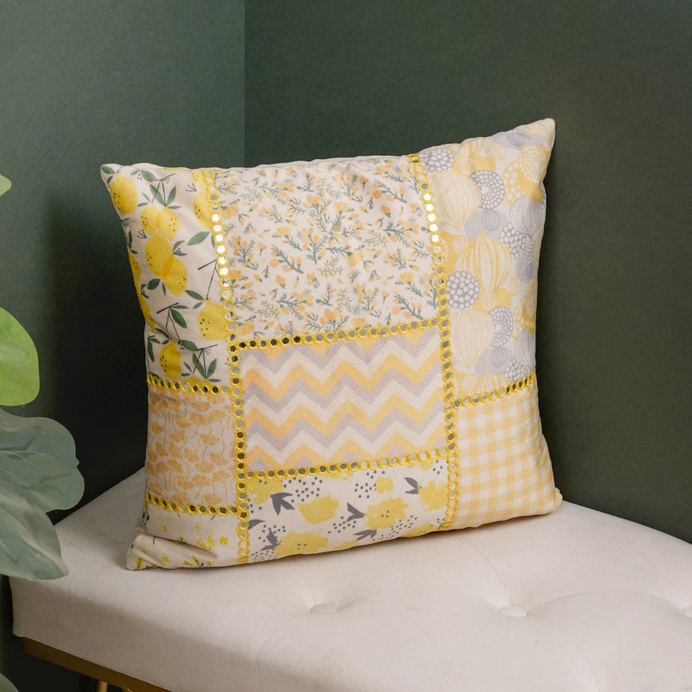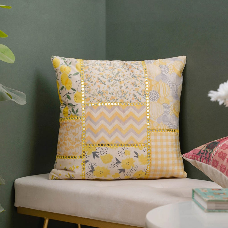 The yellow velvet cushion cover is made of premium quality material, embellished with detailed mirror work. The abstract, fruity and flowery patchwork patterns on the cushion cover create a yellow mood board by taking a square fragment of a painted yellow visual. The eclectic cushion cover will bring in a touch of glam on special occasions when used as a cover for sofa cushions and chair cushions. The yellow velvet cushion cover can be gifted as a housewarming treasure.