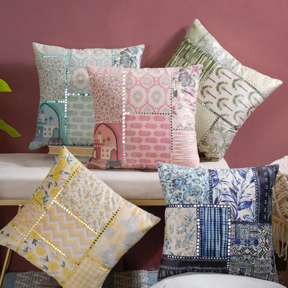 Features: -Sustainable and artisanal -Quilted cushion -Suitable for machine wash -Premium quality velvet fabric -Printed patchwork -Mirror work -Elegant and luxurious