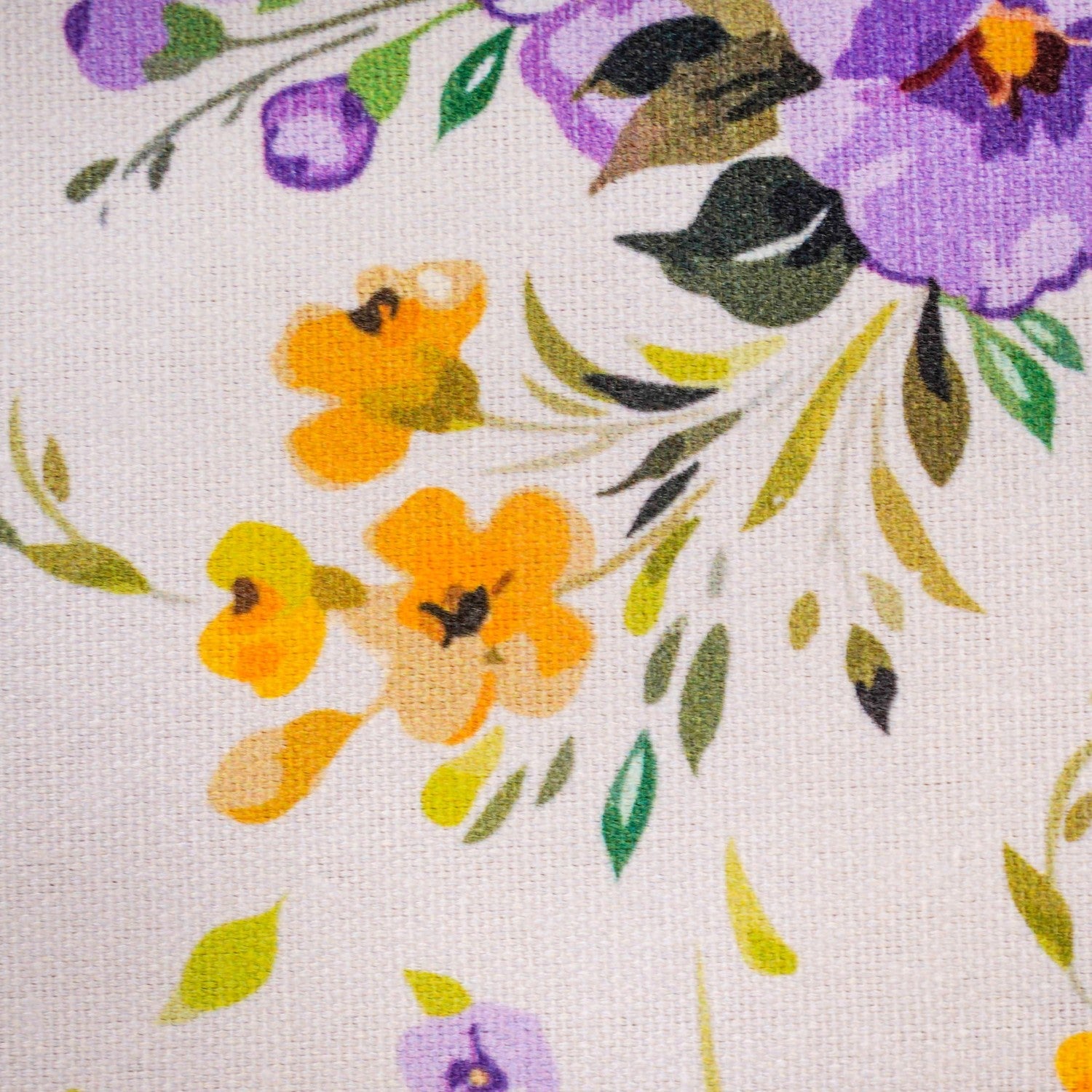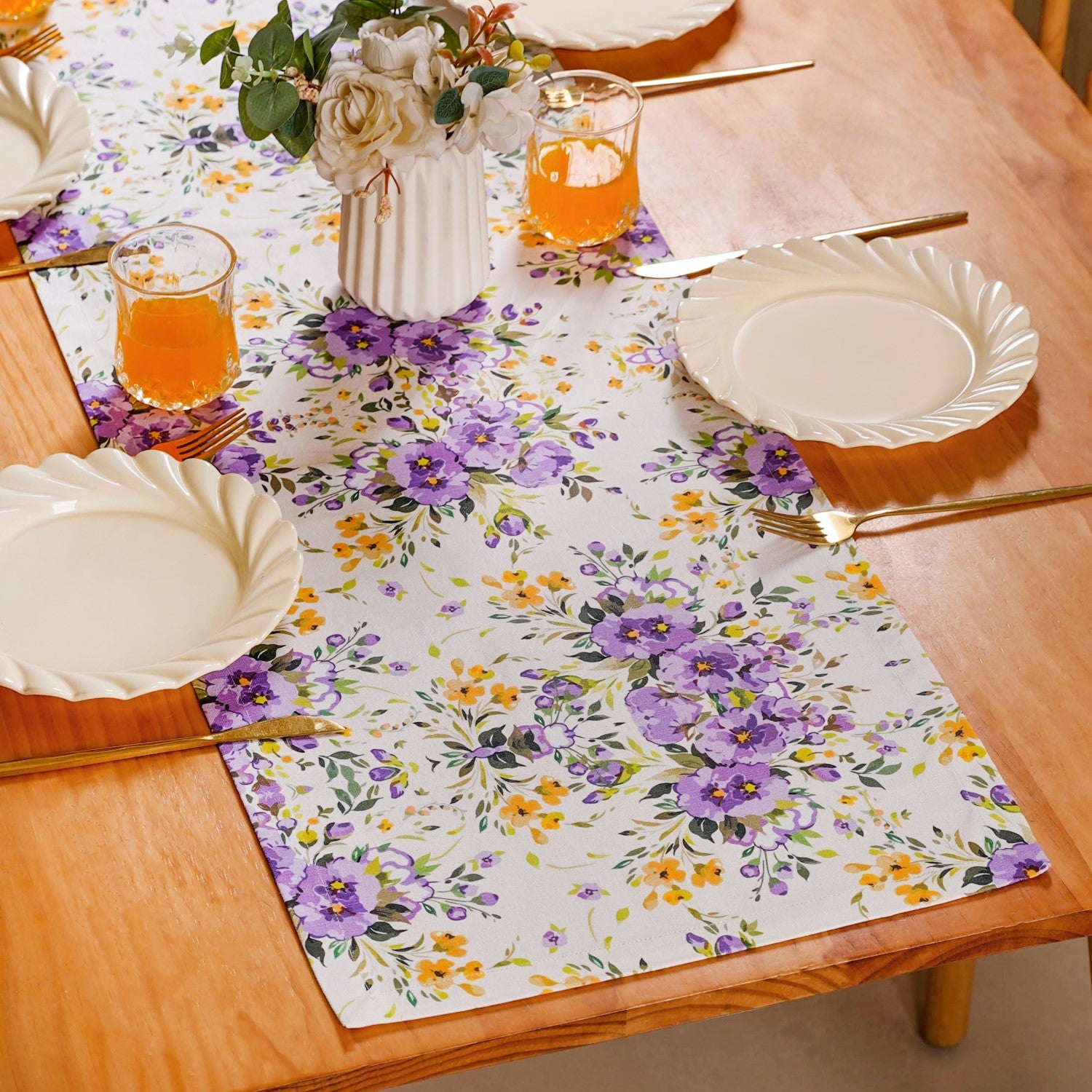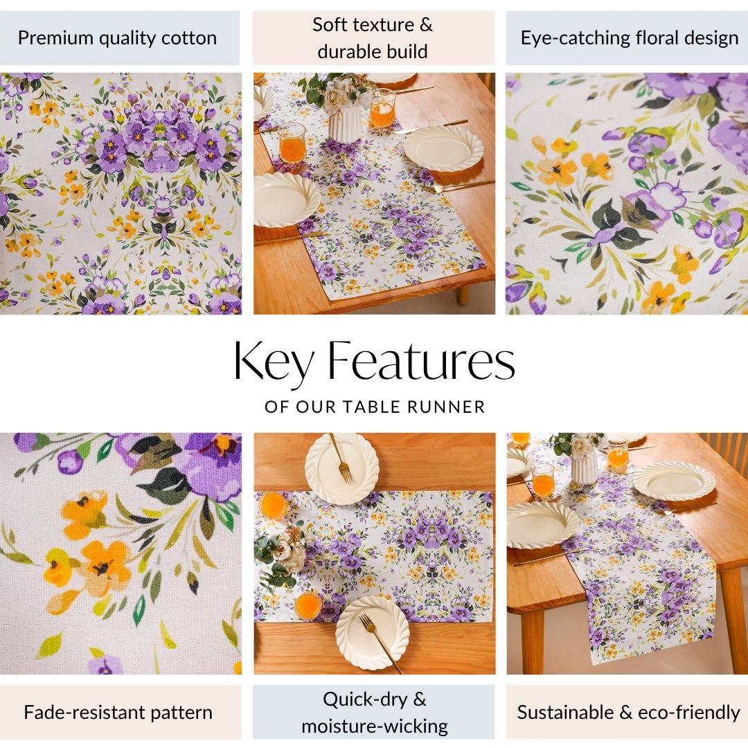 Design: This dining table runner showcases a lively floral pattern, intricately detailed with beautiful purple and lavender blooms, cheerful yellow flowers, and graceful green leaves, all set against a light background. This eye-catching arrangement brings the charm of a wild garden to your home. Woven from pure cotton, the fabric may have a slight natural shrinkage of about 5 to 6 percent after washing, but a gentle press with a warm iron will restore its beautiful shape and drape.