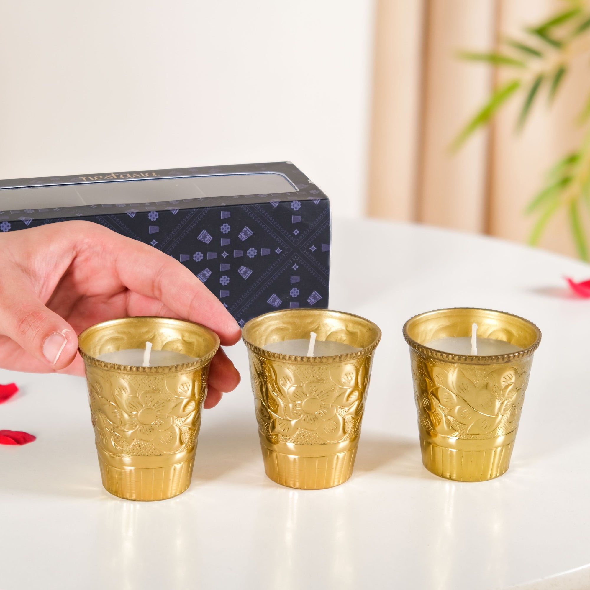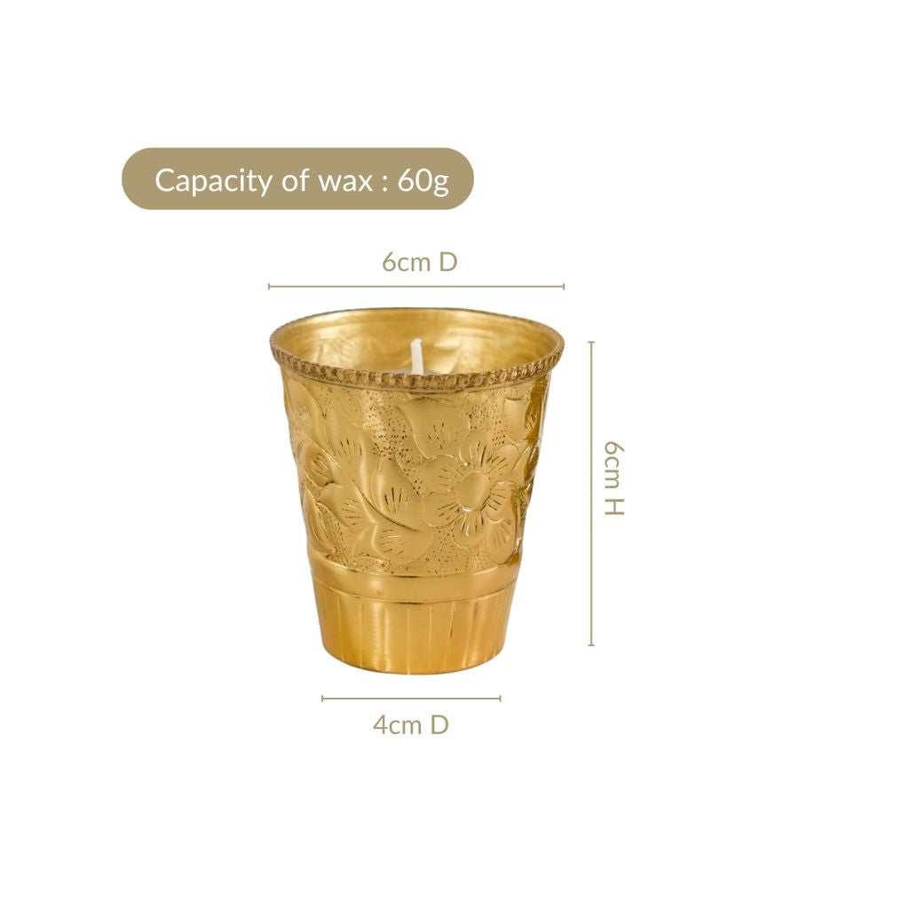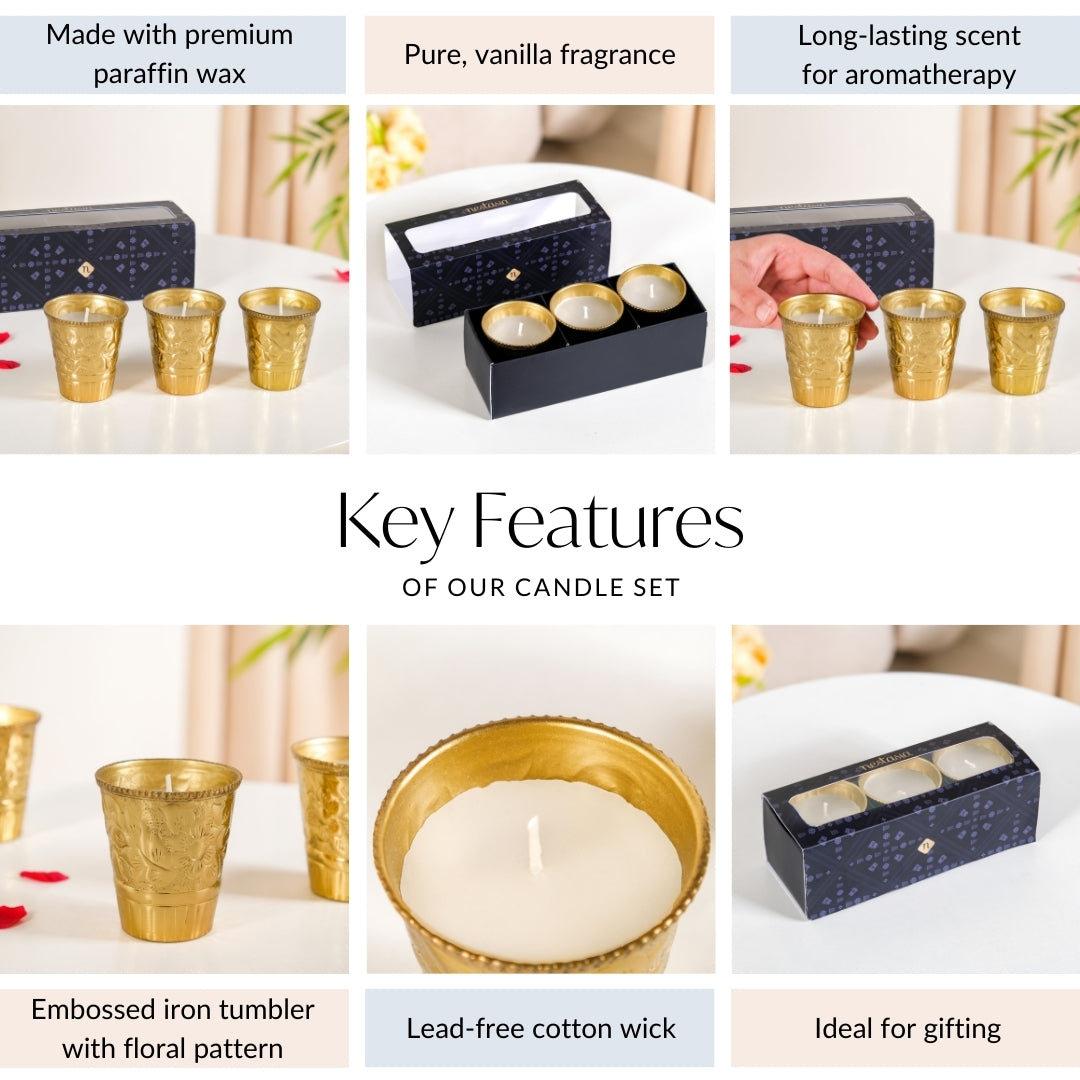 Design: More than a simple candle, each piece in this vanilla-scented candle set is a work of art. Encased in an elegant iron tumbler with a delicate, embossed floral pattern, these candles are designed to be as visually stunning as they are fragrant. The intricate detail and lustrous metallic finish make them a captivating centrepiece, creating a truly luxurious ambience that continues long after the candle has been lit. This candle set comes in beautiful packaging, making it ideal for gifting.
