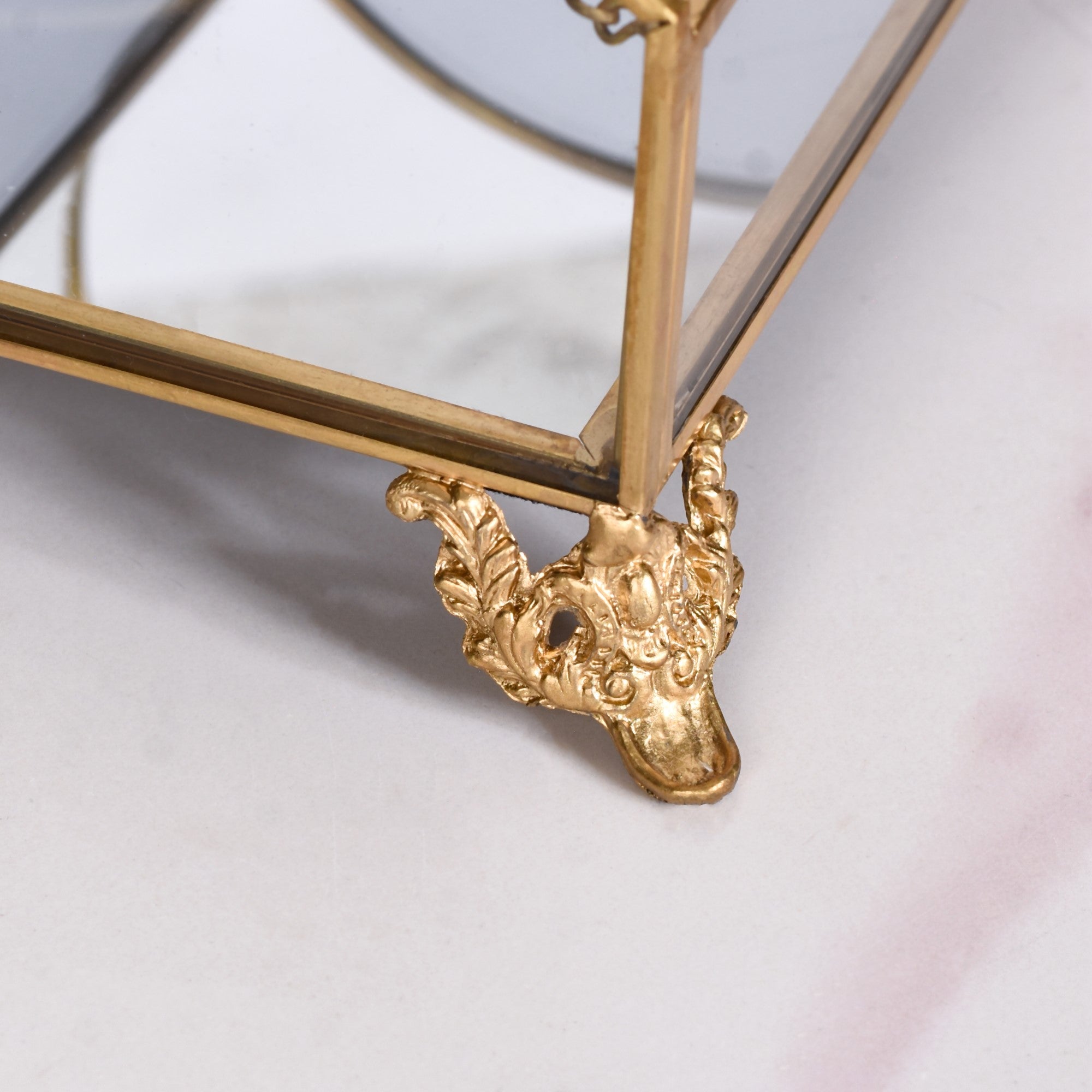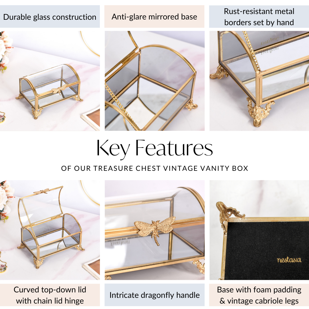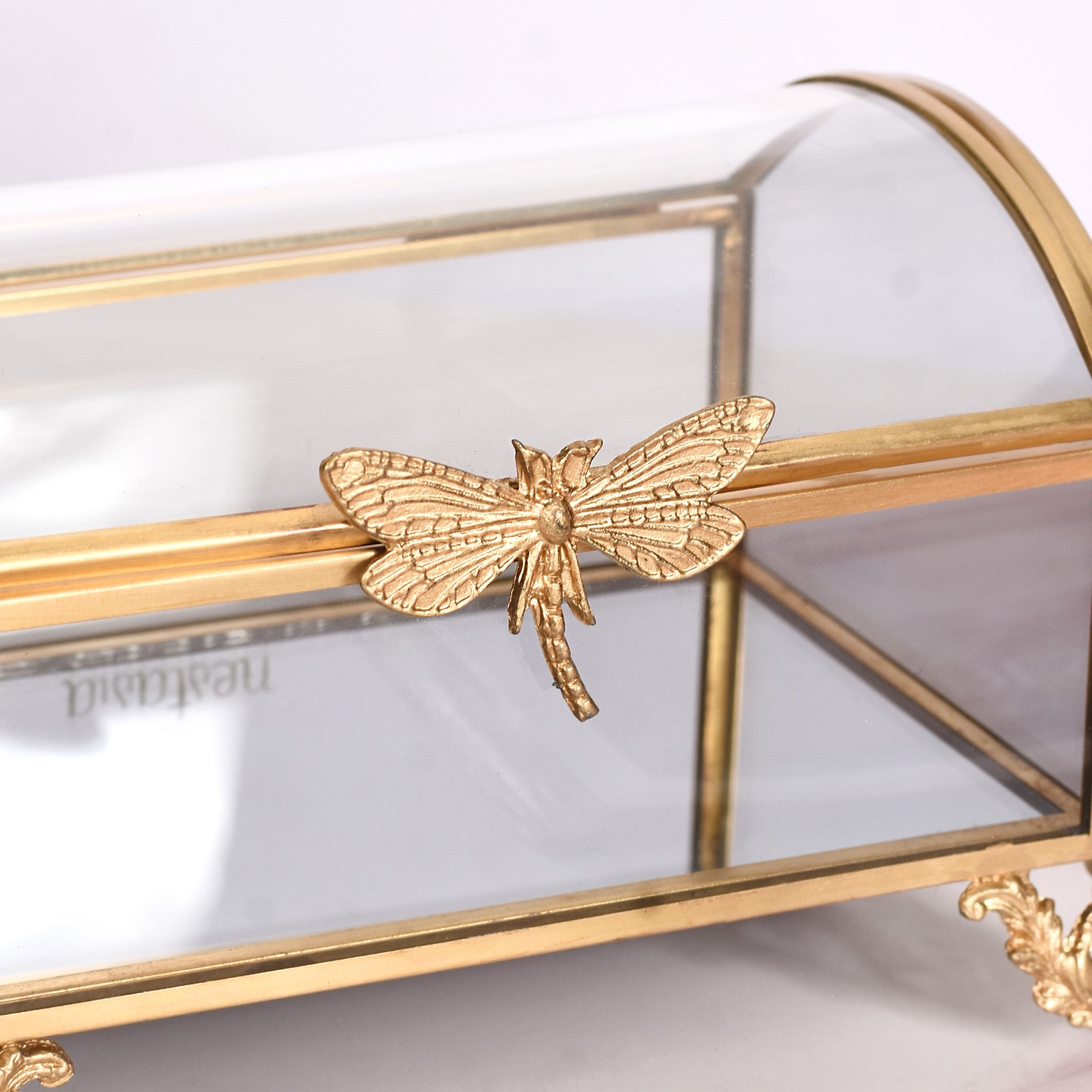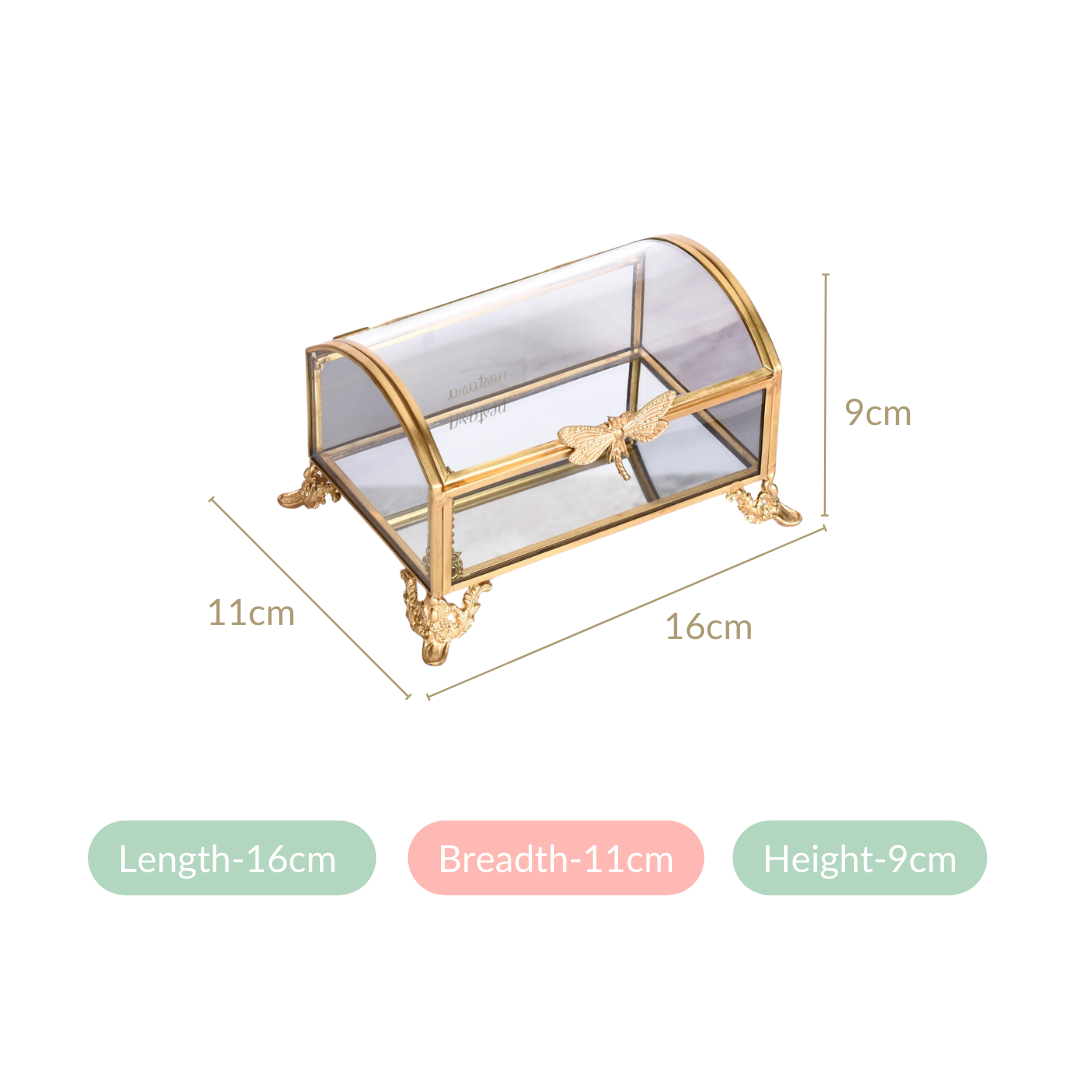Design: Crafted from premium-quality tempered glass and enclosed by golden rust-resistant borders that are set by hand, the transparent jewellery box features a treasure chest shape with a gently curved top-down lid supported by a gold link chain lid hinge. Enhancing the beauty of the vanity box are some breathtaking vintage elements - an intricate dragonfly handle and cabriole legs. Equipped with an anti-glare mirrored base and a foam padded base, this jewellery organizer is a thing of beauty.