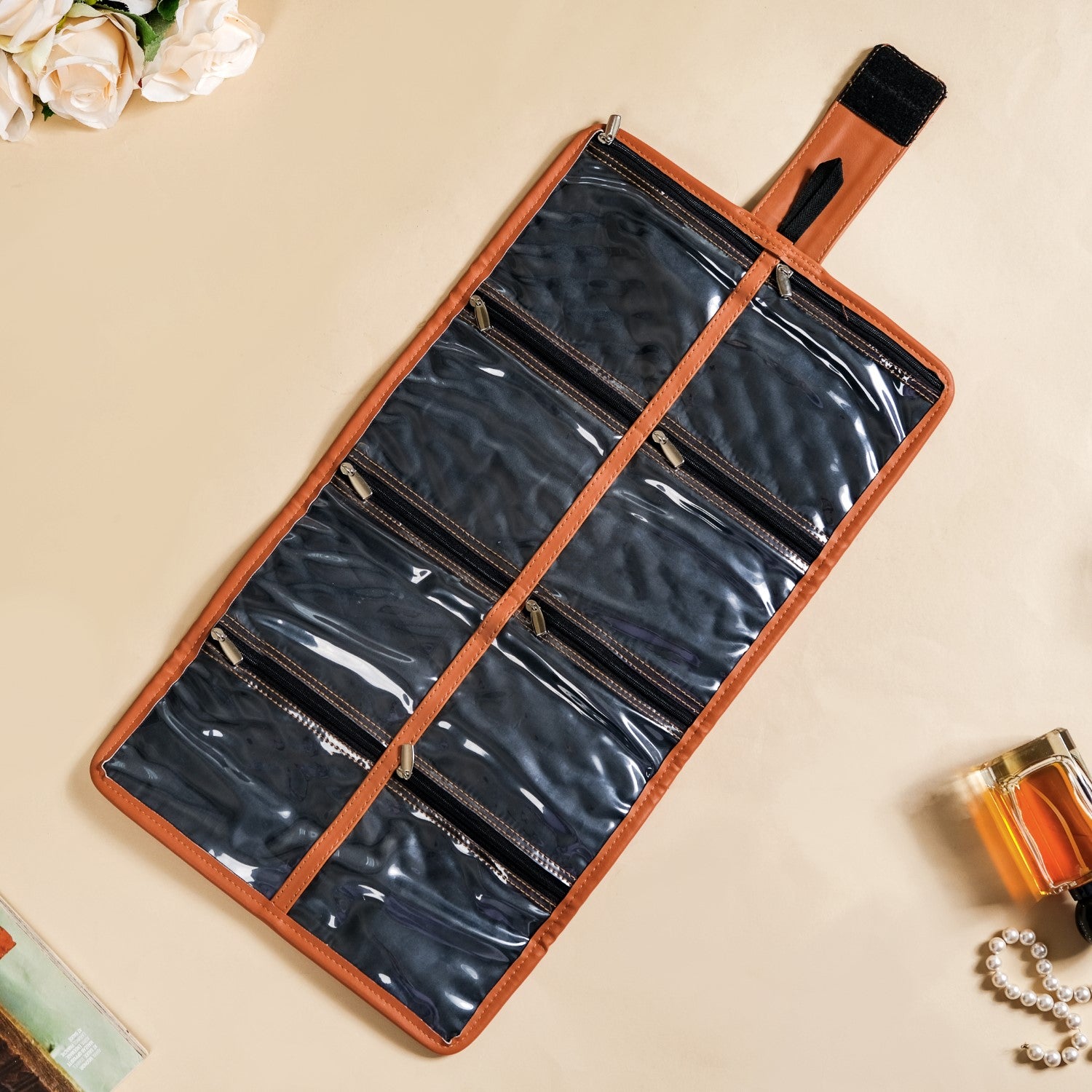 Introducing our exquisite jewellery roll organizer, meticulously crafted from premium quality vegan leather to keep your precious accessories safe and organized wherever you go. Its portable and foldable design makes it perfect for travel or everyday use, while the elegant quilted exterior adds a touch of sophistication to your accessory collection. With eight zipped compartments and a Velcro strap enclosure, you can store and secure your rings, earrings, bracelets, and necklaces with ease. Plus, its water-resistant construction ensures added protection for your valuables, while its durable and long-lasting design ensures years of reliable use. This multipurpose organizer is not only perfect for storing jewellery but is also ideal for keeping small accessories, cosmetics, or toiletries organized. Easy to clean and maintain, it's the perfect gift for yourself or a loved one who appreciates both style and functionality in their accessories. Elevate your storage solutions with our premium jewellery roll organizer today.