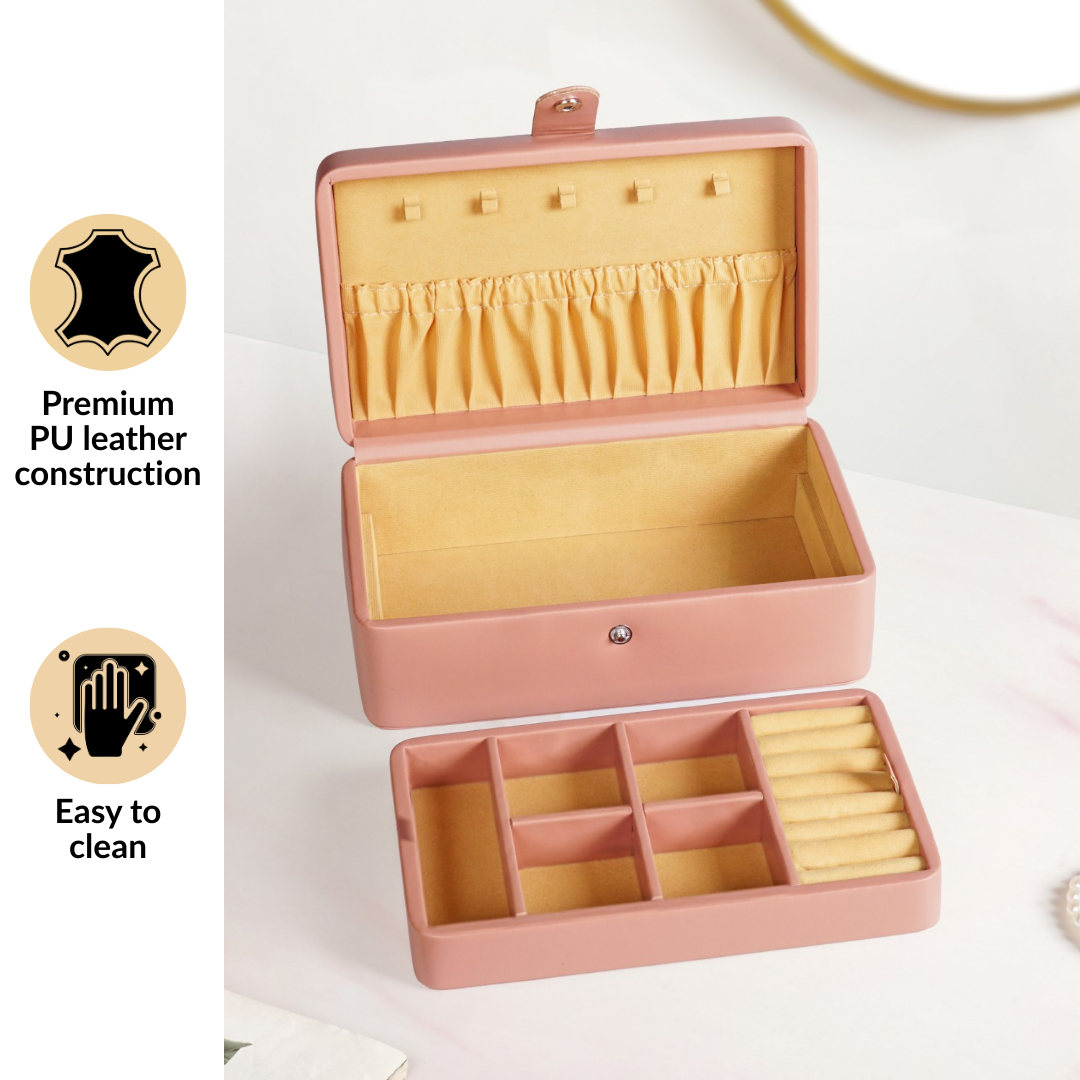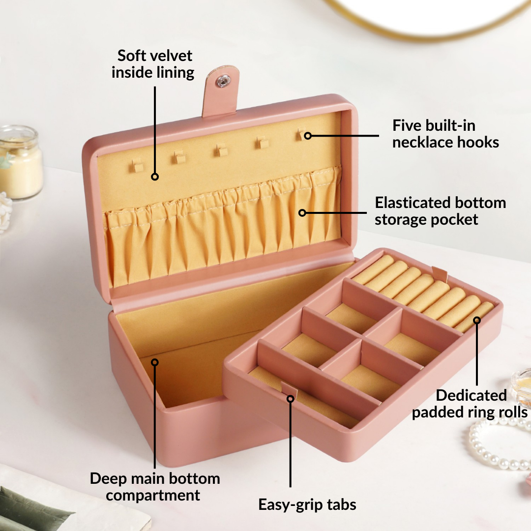 Design: This box features a sturdy MDF frame wrapped in an elegant dusty rose vegan leather finish. The interior is lined with soft velvet and includes a removable top tray with padded ring rolls. It also offers five necklace hooks, an elasticated pocket, and a deep bottom compartment for larger items.