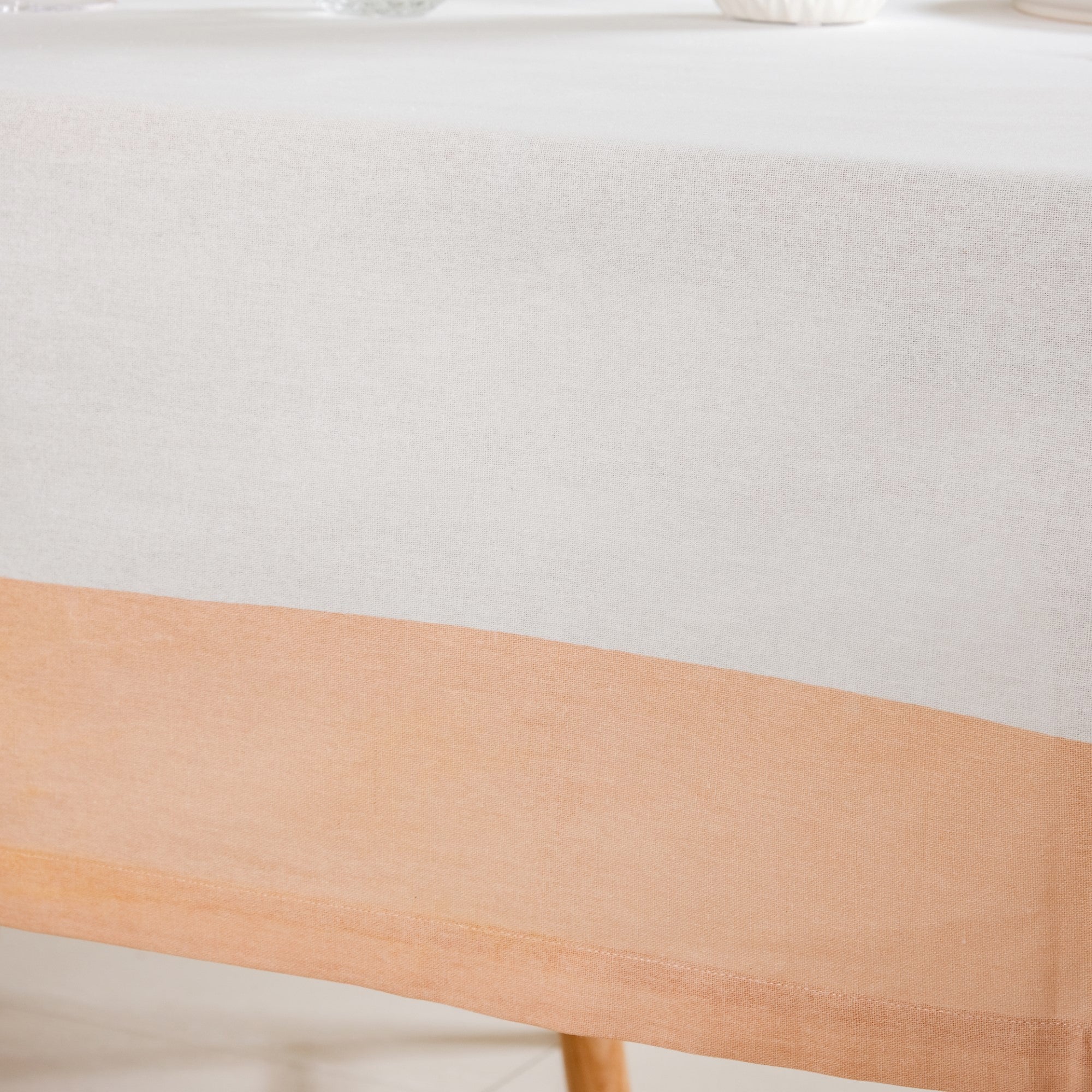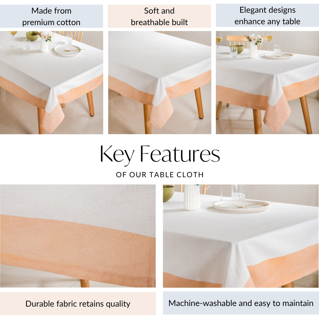 Infuse your dinner space with warmth using this white cotton tablecloth with soft peach borders. It can turn your daily meals into celebrations.