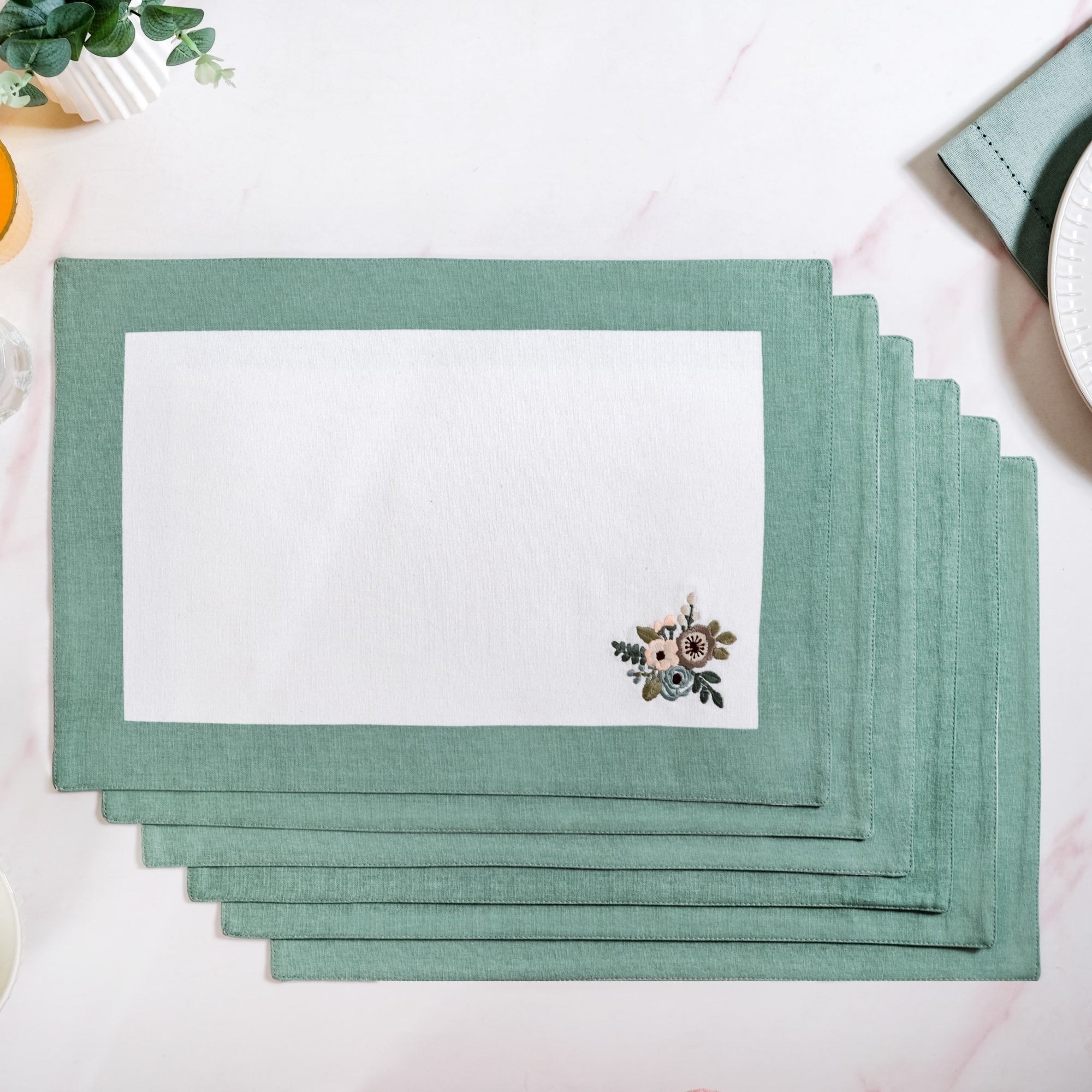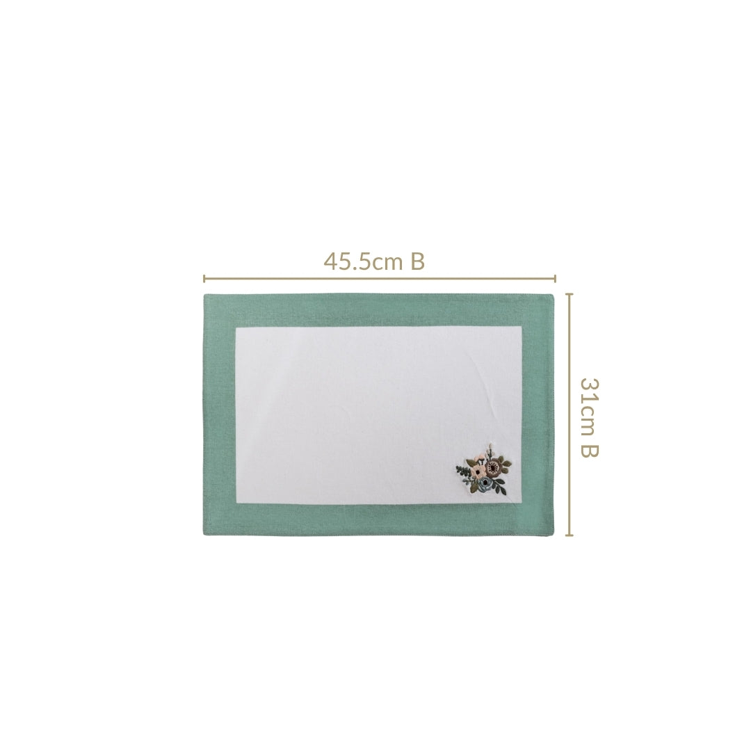 Design: Featuring a soft, sage green border and ivory white base, these placemats are designed to please people who love minimal elegance. The flower motifs with leafy accents embroidered at one corner of the mats add a dash of nature-inspired charm. The subtle contrast between white and pastel teal offers a refined look, while the muted palette of the embroidery makes them a versatile choice for both contemporary and rustic dinner settings.