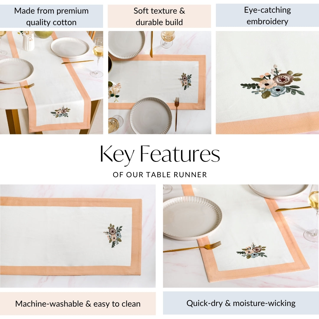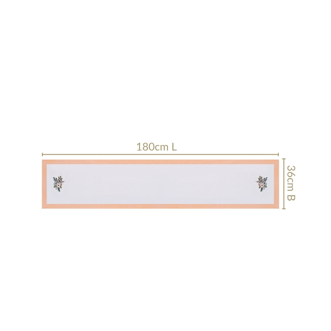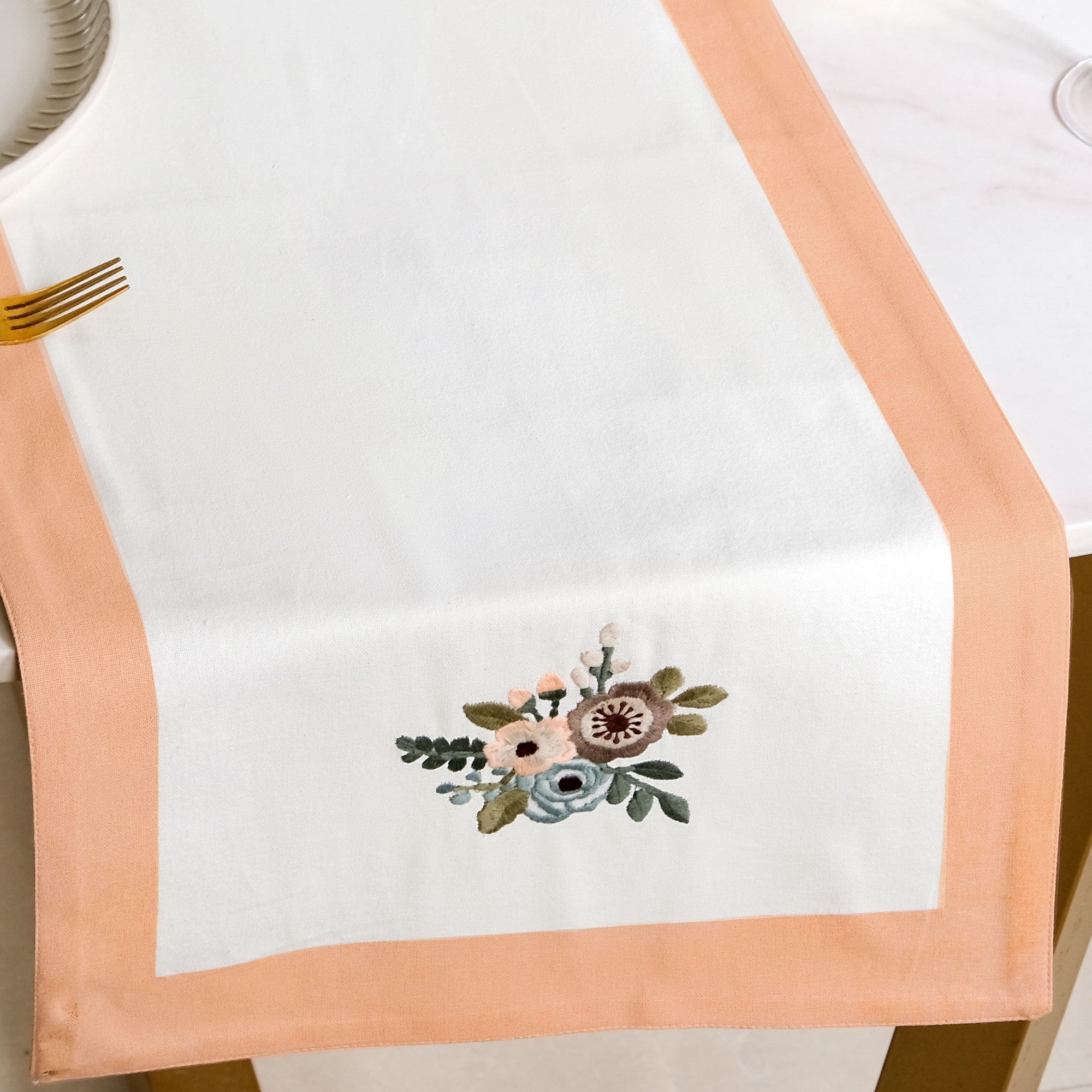 Design: This table runner features a broad peach border that frames the ivory white centre, creating an airy and fresh look. The detailed floral embroidery in soft shades of peach, green, grey, and brown on both ends adds just the right amount of detailing to this simple runner. The flower motif brings a touch of natural beauty and exudes timeless charm. The delicate yet sturdy stitches on the edges lend a refined look to this runner. Made from pure cotton, the fabric may shrink slightly after washing (around 5 to 6 percent), but a gentle press with a warm iron helps it return to its original shape and drape beautifully.