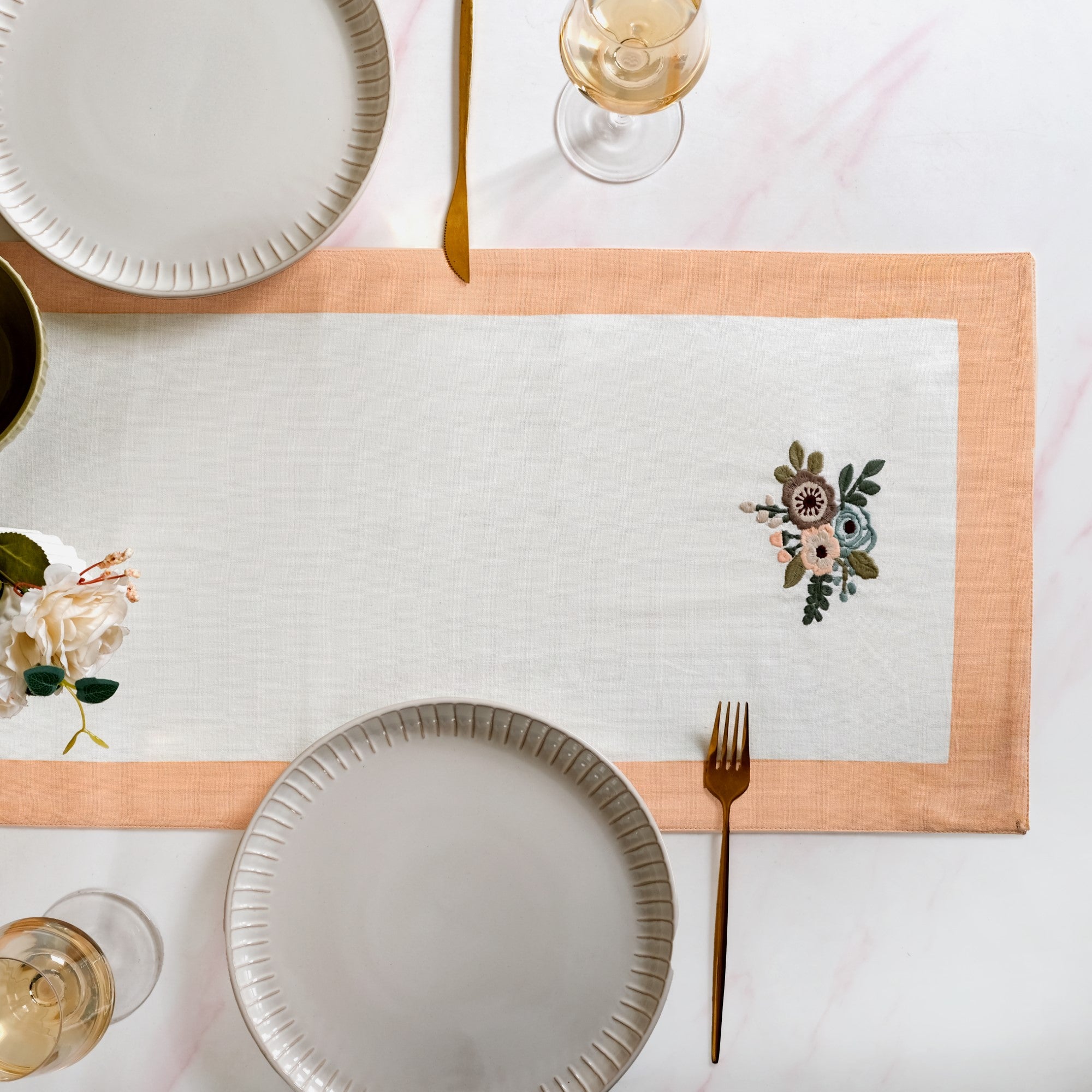 Add a touch of romance to your dining setup by laying this soft peach cotton table runner featuring stunning floral embroidery on both ends. It is a graceful choice for elegant dinners, but you can also use it to set the mood of your daily lunches with family.