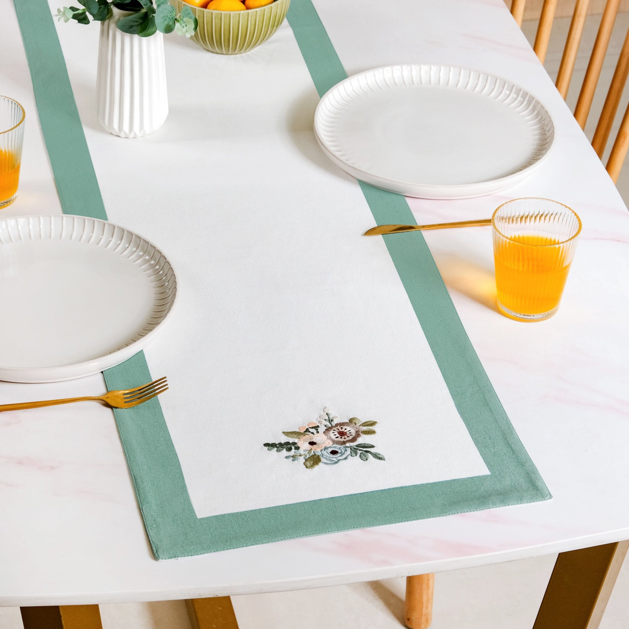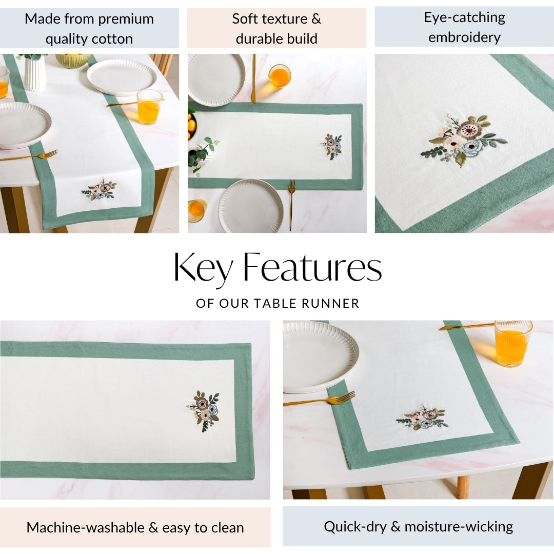Design: This cotton dining table runner features a crisp white centre bordered by muted pastel blue. Neatly embroidered floral motifs line both sides, lending a hand-crafted charm to the piece. The rectangular runner has a smooth surface with a visible weave that feels soft yet durable to the touch. Its moderate thickness keeps it draped flat and tidy on any tabletop. The contrast between the blue edges and the white middle creates a refined yet welcoming table look. Each stitch and detail is designed to make daily dining feel special without being fussy.