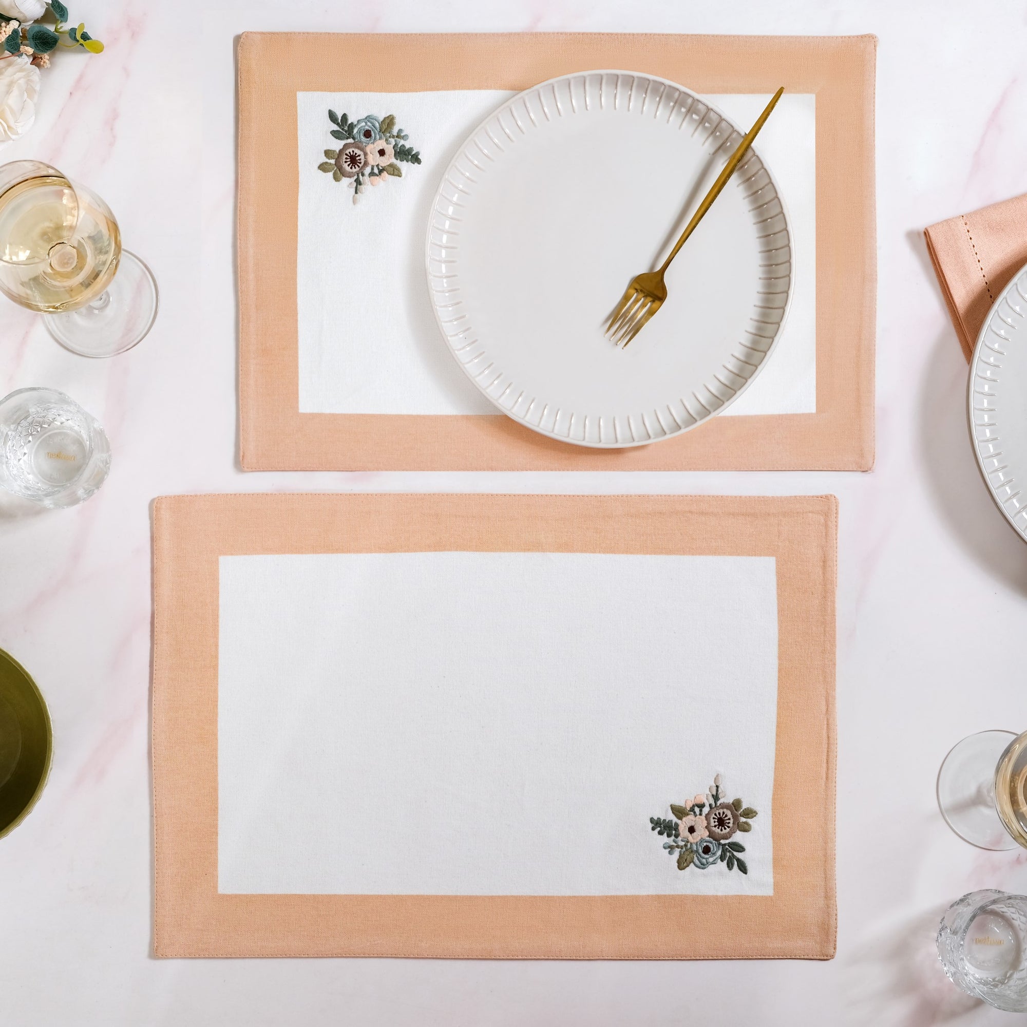 Design: This set brings effortless elegance to your table, blending a minimal aesthetic with rustic charm. Each placemat has a crisp white centre framed by peach borders and finished with delicate floral embroidery in one corner. The coordinating napkins echo the palette with a solid peach hue and fine hemstitching at the edges. The matching runner, featuring subtle embroidery on both ends, ties the entire setting together with artisanal charm.