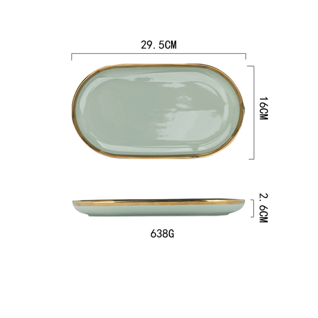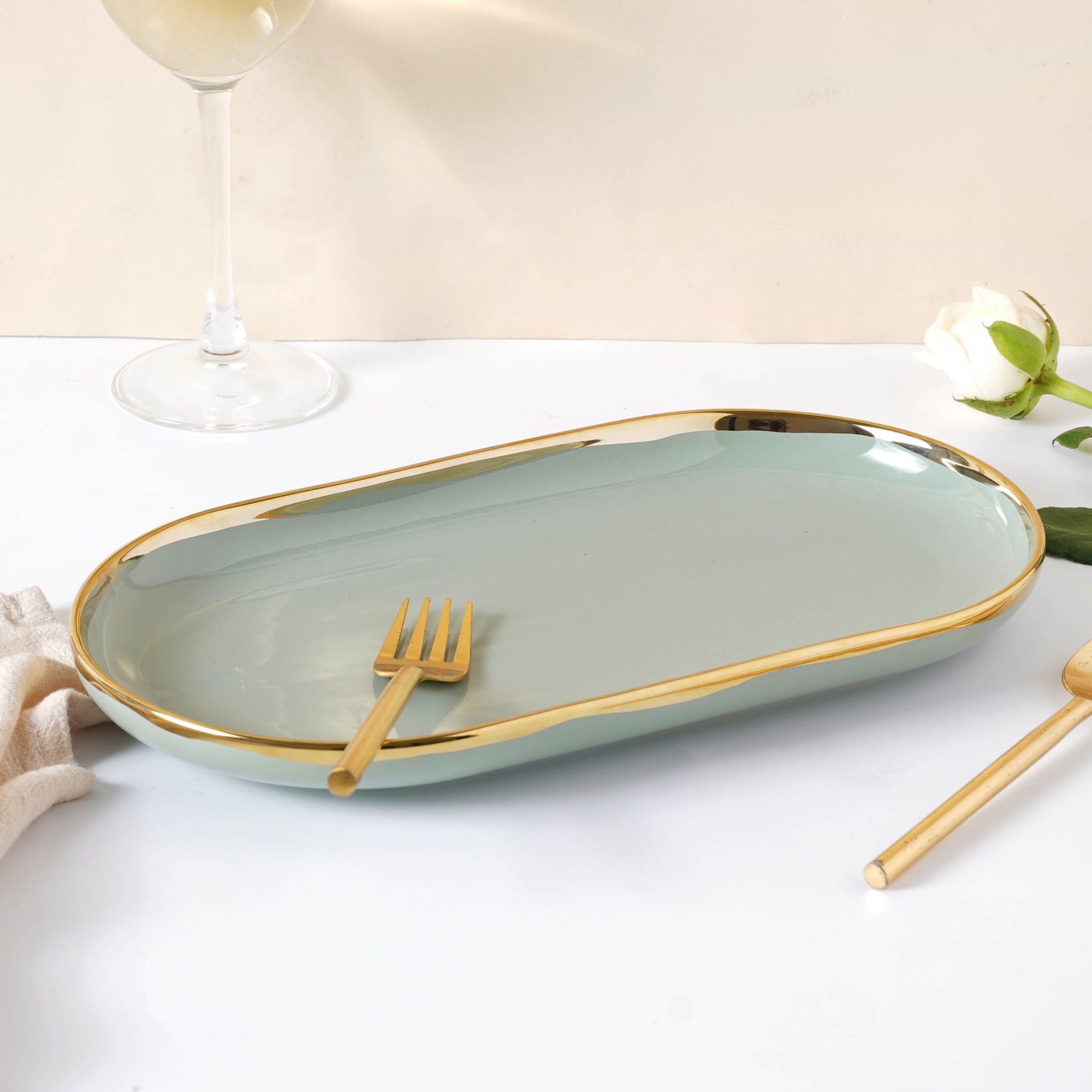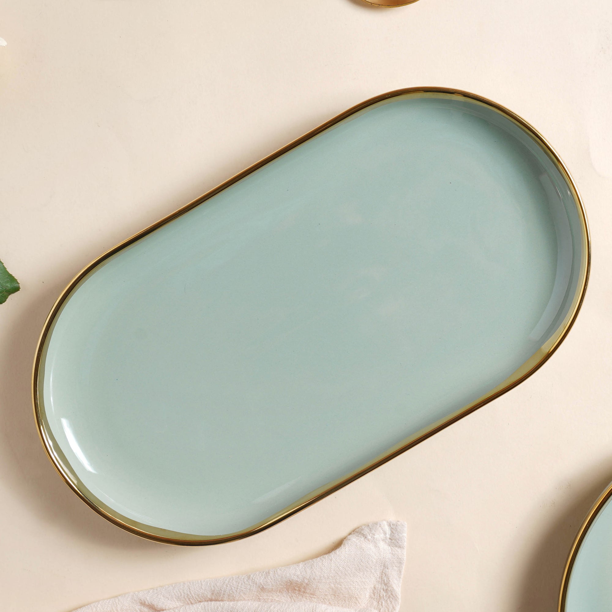 Serving plate for starters and snacks from the VERA collection in mint green. Use the serving platter with wavy gold rim as a platter for sides and snacks with the main course. The ceramic serving plate is perfect for dinner table setup as it looks sophisticated and requires minimal efforts for plating. Serve kebabs, tofu, dumplings or any starter in the long plate or use it as a plate for desserts like mud pie with ice cream and chocolate sauce. Elevate dinner parties with the VERA collection that looks elite and is not microwave safe.
