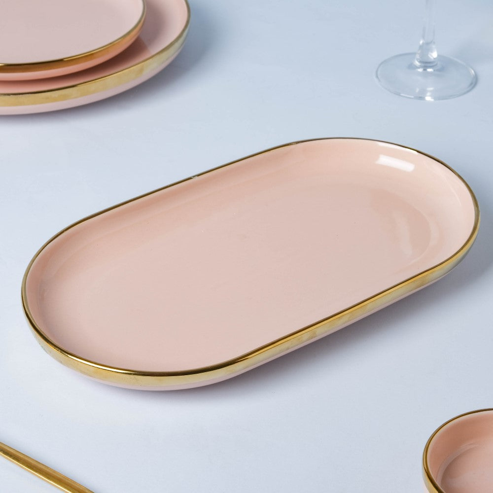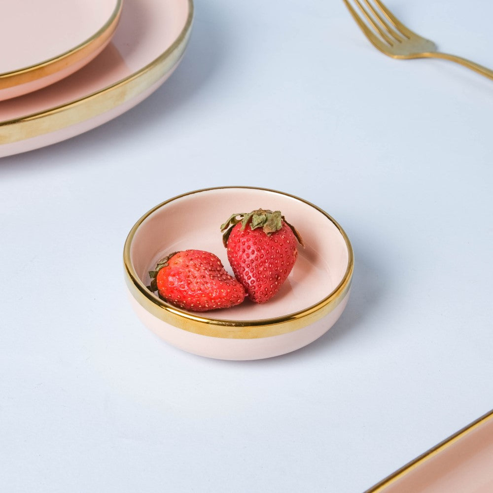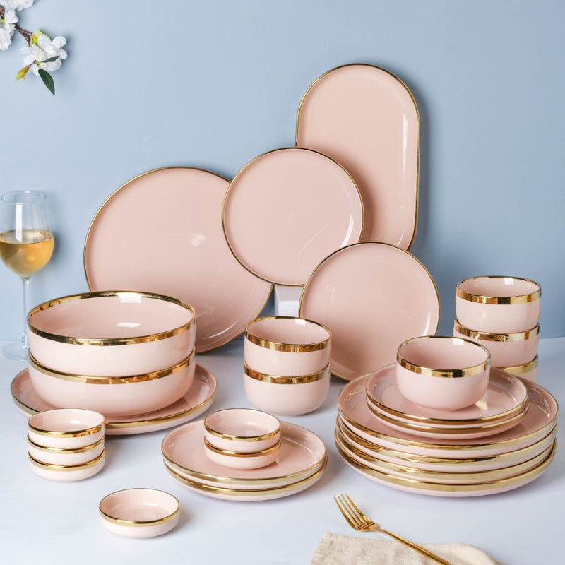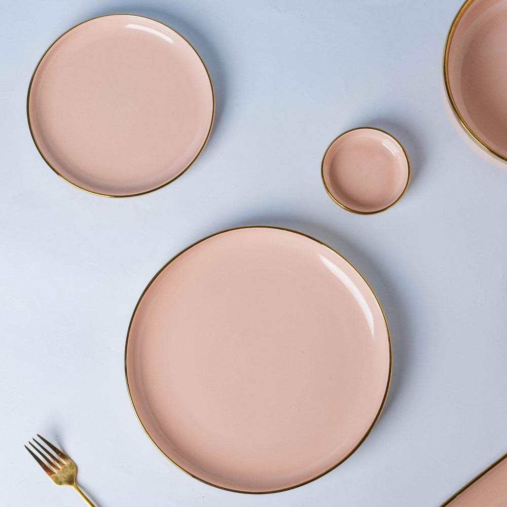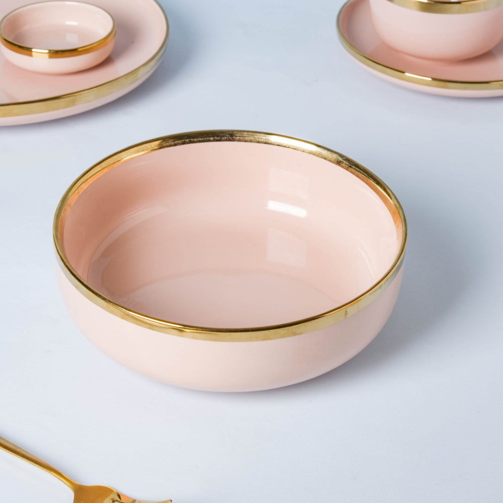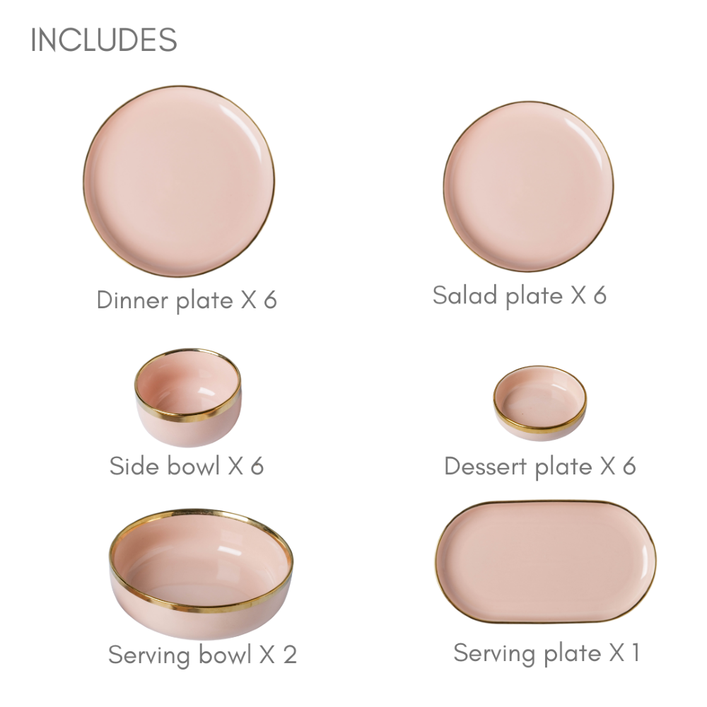 The gold-rimmed Vera Pink tableware in a subtle hue is sleek, fashionable, and attractive, and it will add elegance and glamour to dinner gatherings. With the elegance of the Vera range of crockery, one may improve the quality of one's already delicious cuisine. Presenting any cuisine of your choosing on the dining table in this collection of dinnerware can get you plenty of appreciation from visitors and family members. The set includes 6 dinner plates, 6 dessert plates, 6 side bowls, 6 side plates, 2 serving bowls, and 1 serving plate perfect for a family of six. The set can be used for a soup and pasta dinner or lunch, depending on your mood and the occasion. One could also mix and match the Vera White and Vera Pink dinnerware sets for an occasion that demands larger sets. The Vera Pink dinnerware stands synonymous with elegance.