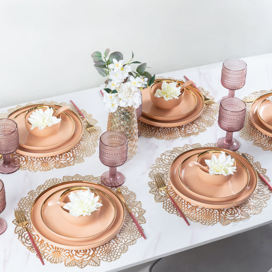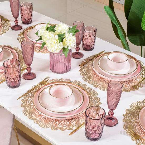 The gold-rimmed Vera Pink tableware in a subtle hue is sleek, fashionable, and attractive, and it will add elegance and glamour to dinner gatherings. With the elegance of the Vera range of crockery, one may improve the quality of one's already delicious cuisine. Presenting any cuisine of your choosing on the dining table in this collection of dinnerware can get you plenty of appreciation from visitors and family members. The set includes 6 dinner plates, 6 dessert plates, 6 side bowls, 6 side plates, 2 serving bowls, and 1 serving plate perfect for a family of six. The set can be used for a soup and pasta dinner or lunch, depending on your mood and the occasion. One could also mix and match the Vera White and Vera Pink dinnerware sets for an occasion that demands larger sets. The Vera Pink dinnerware stands synonymous with elegance.