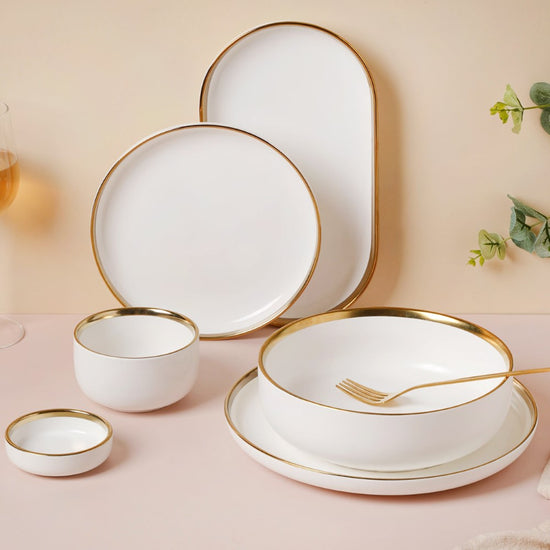 The gold-detailed Vera bowls and plates can be coupled with gold-colored cutlery set from our collection. Our cutlery collection is showcased in the 'Dining' category and gives you tons of options to choose from, be it spoons, forks, knives, pizza cutters, dumpling maker, or anything else you need.