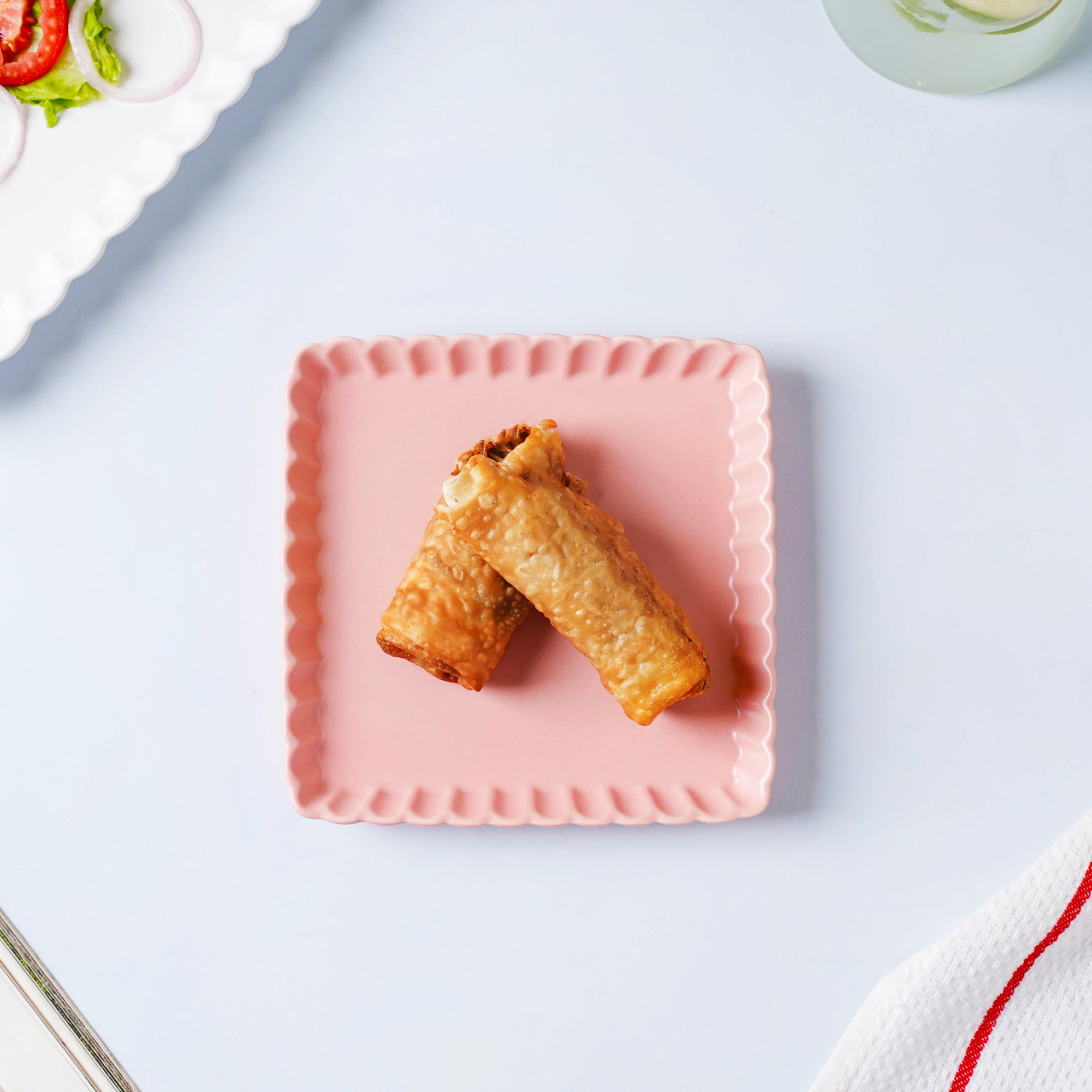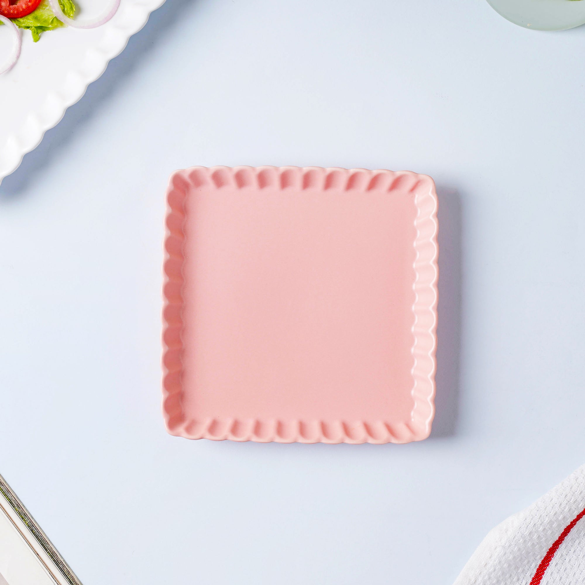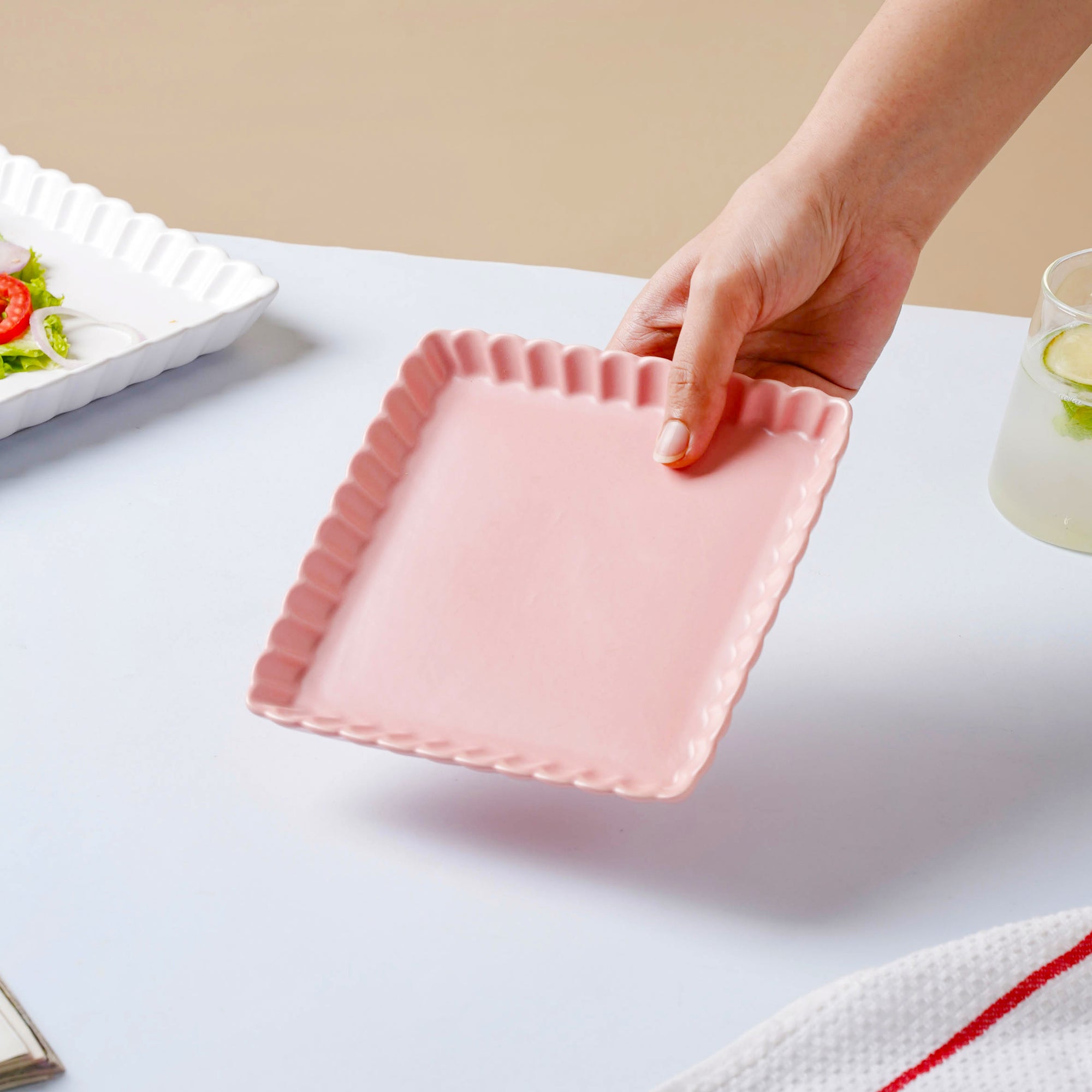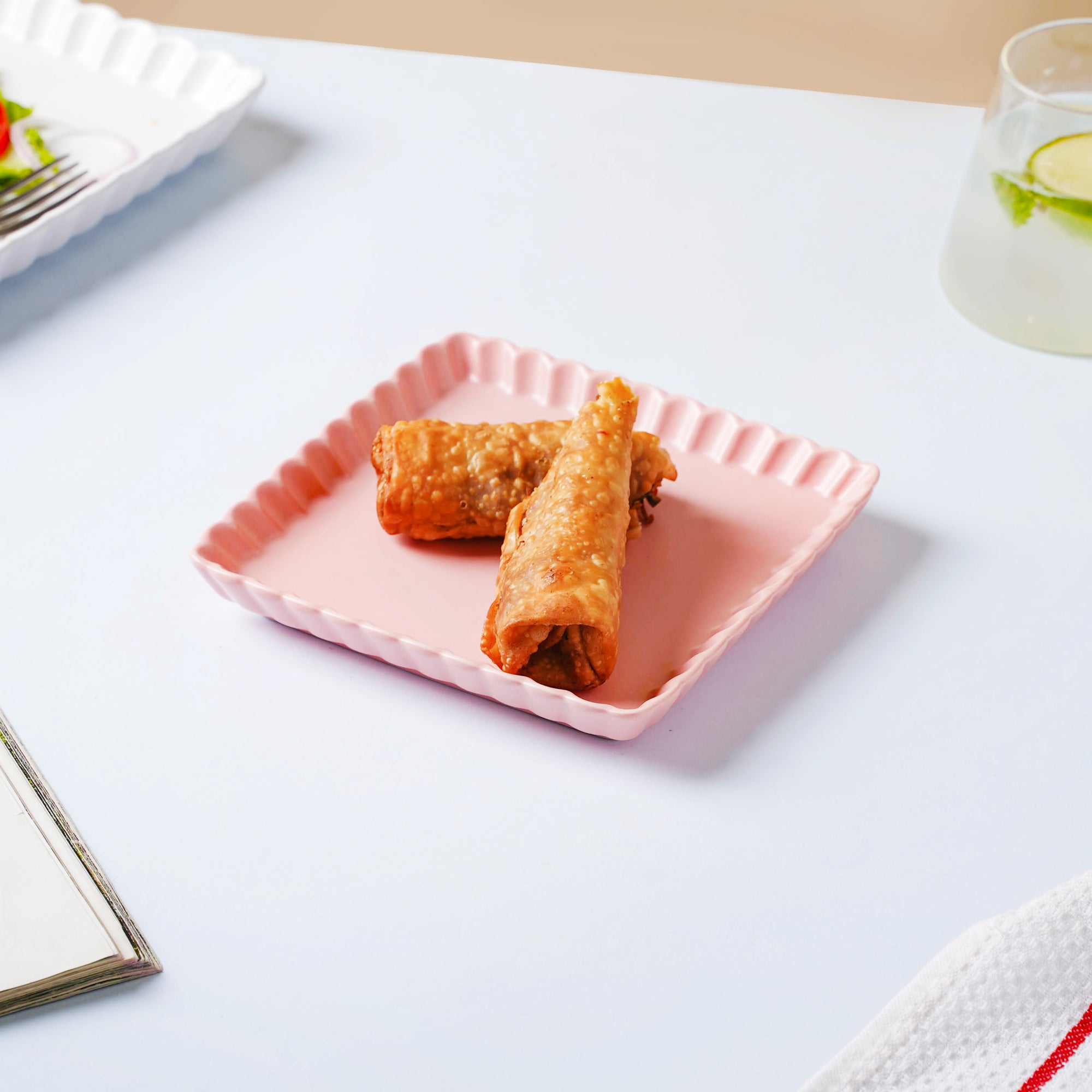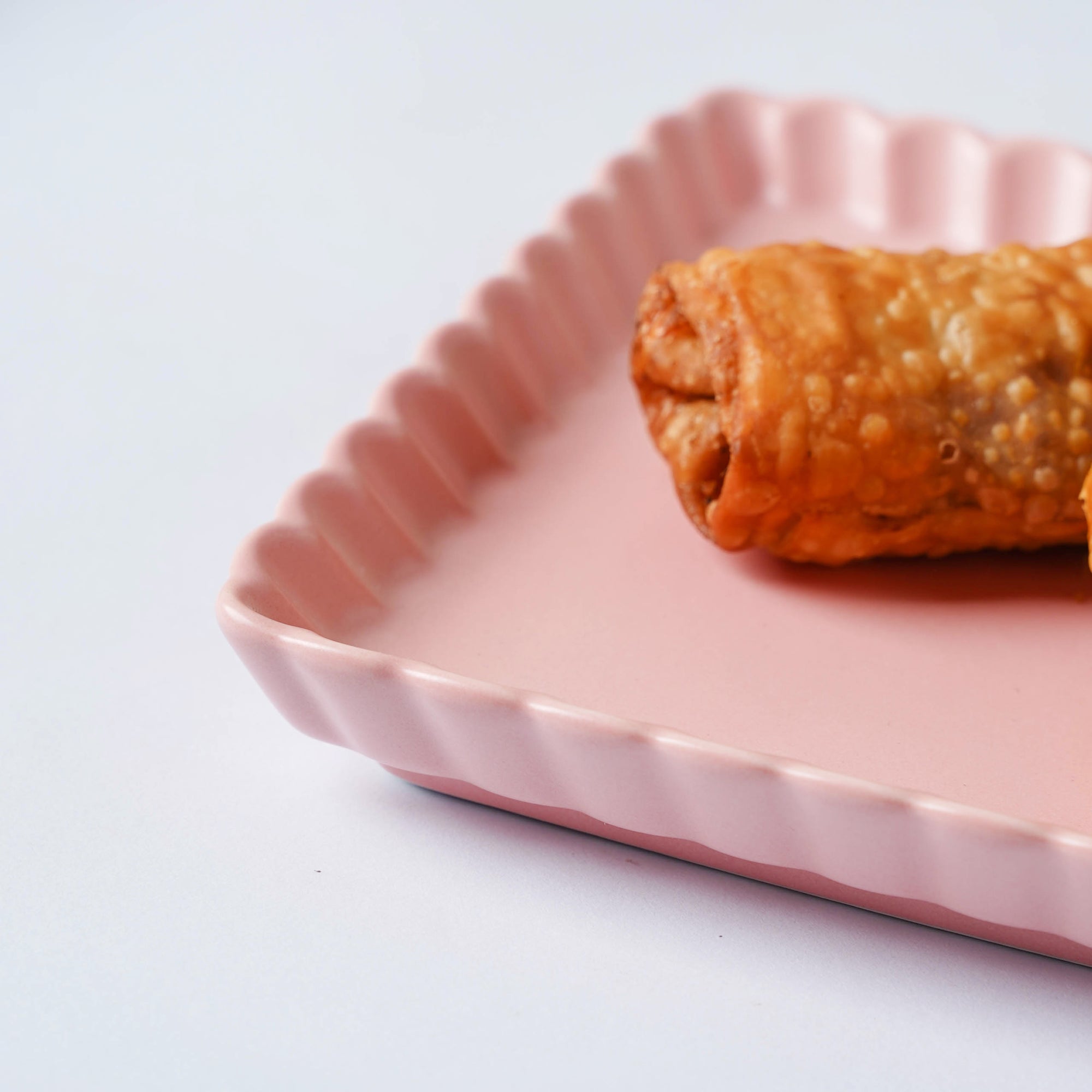 The square-shaped platter can be used as a plate or a tray. The color of the platter is a flowery pink hue, with the bonus of a raised wavy rim. Dishes like sushi and noodles can be served on the ceramic platter. Along with snacks, the platter can be paired with small bowls that can be used for dips and chutneys.