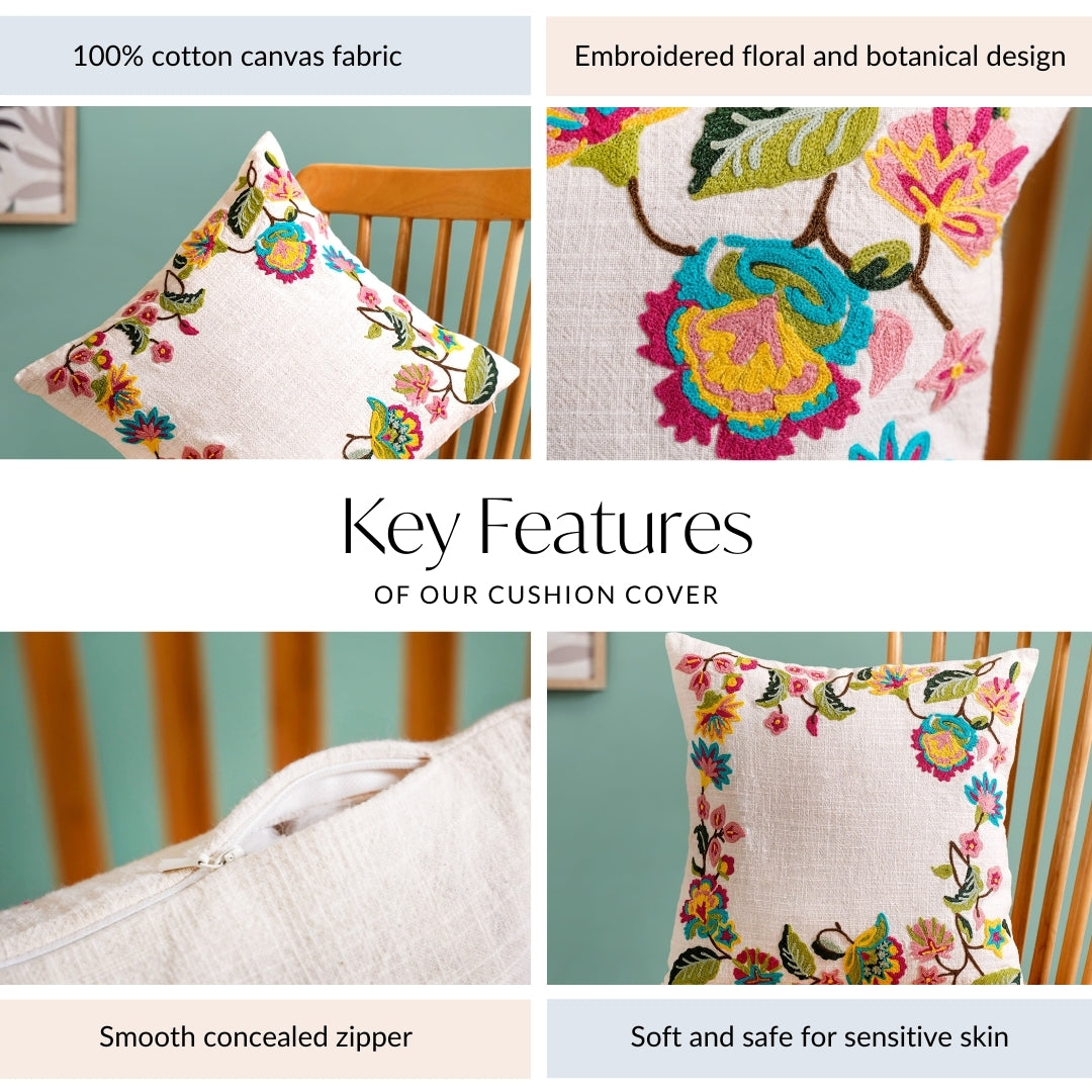 Vibrant Floral Embroidered Cotton Canvas Cushion Cover 40x40cm