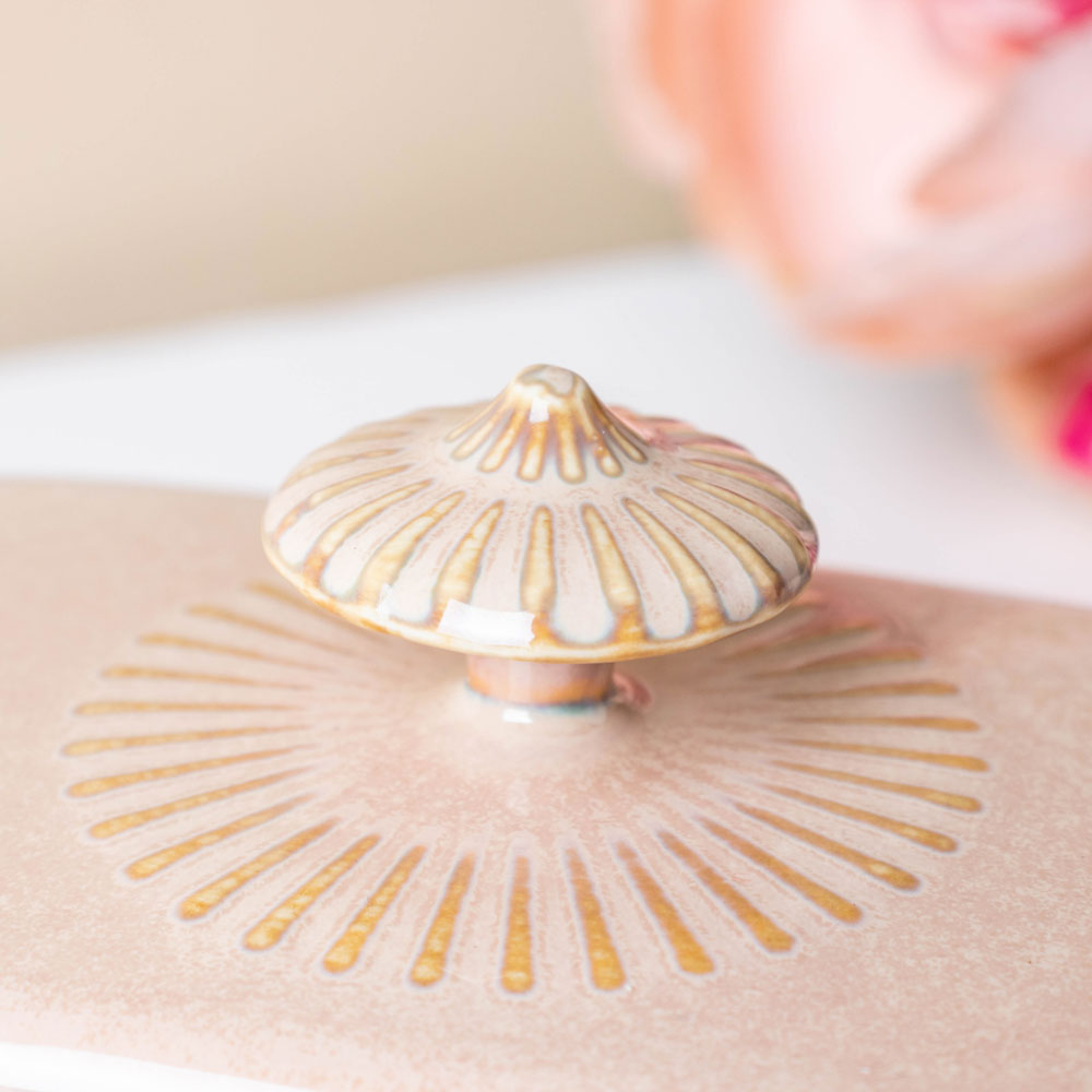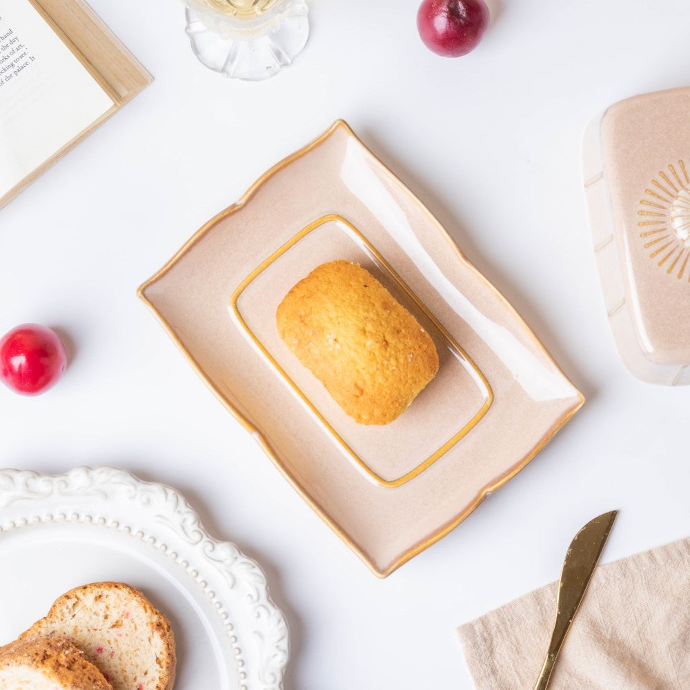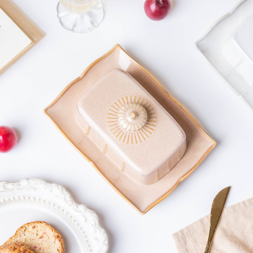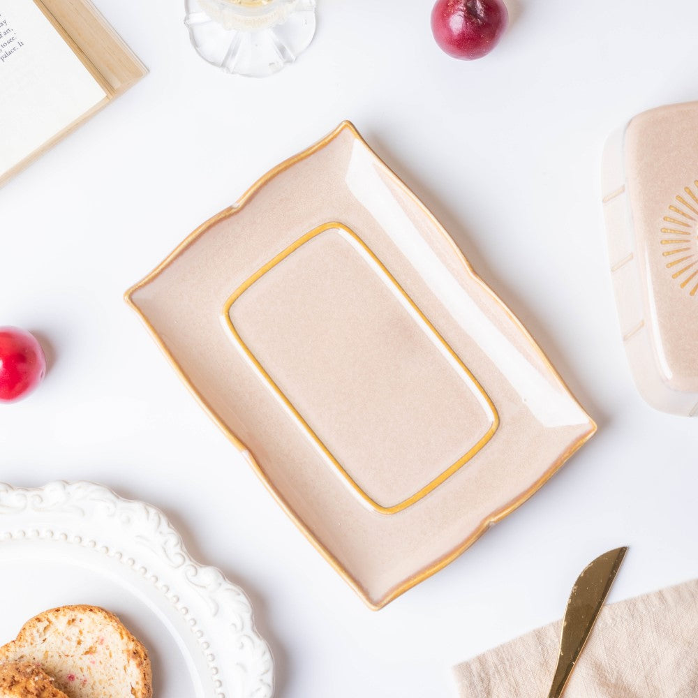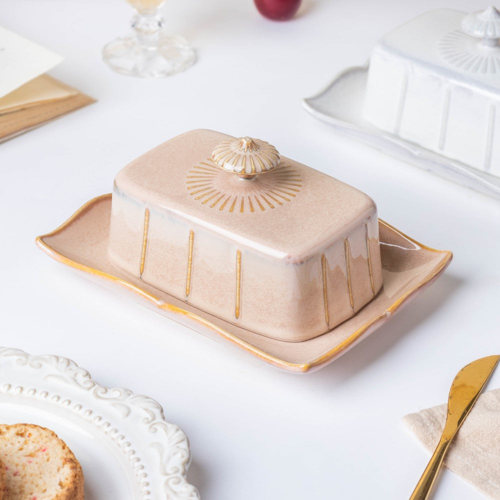 The beige-coloured butter dish with a lid is meticulously crafted in ceramic which can be used for fine dining set-ups. One can use the butter dish for refrigerating butter and other spreads for regular use. The butter plate features fluted edges and the lid with knob comes with ribbed textures; overall, it makes for a stunning combination. Nestip: The butter dish with lid can be used for serving lemon butter or blueberry jam. Size: Plate- 18cm L x 13cm B x 2.5cm H Lid- 13cm L x 8cm B x 8cm H Colour: Beige Material: Ceramic Products included: 1 butter dish Style: DBAC110T135