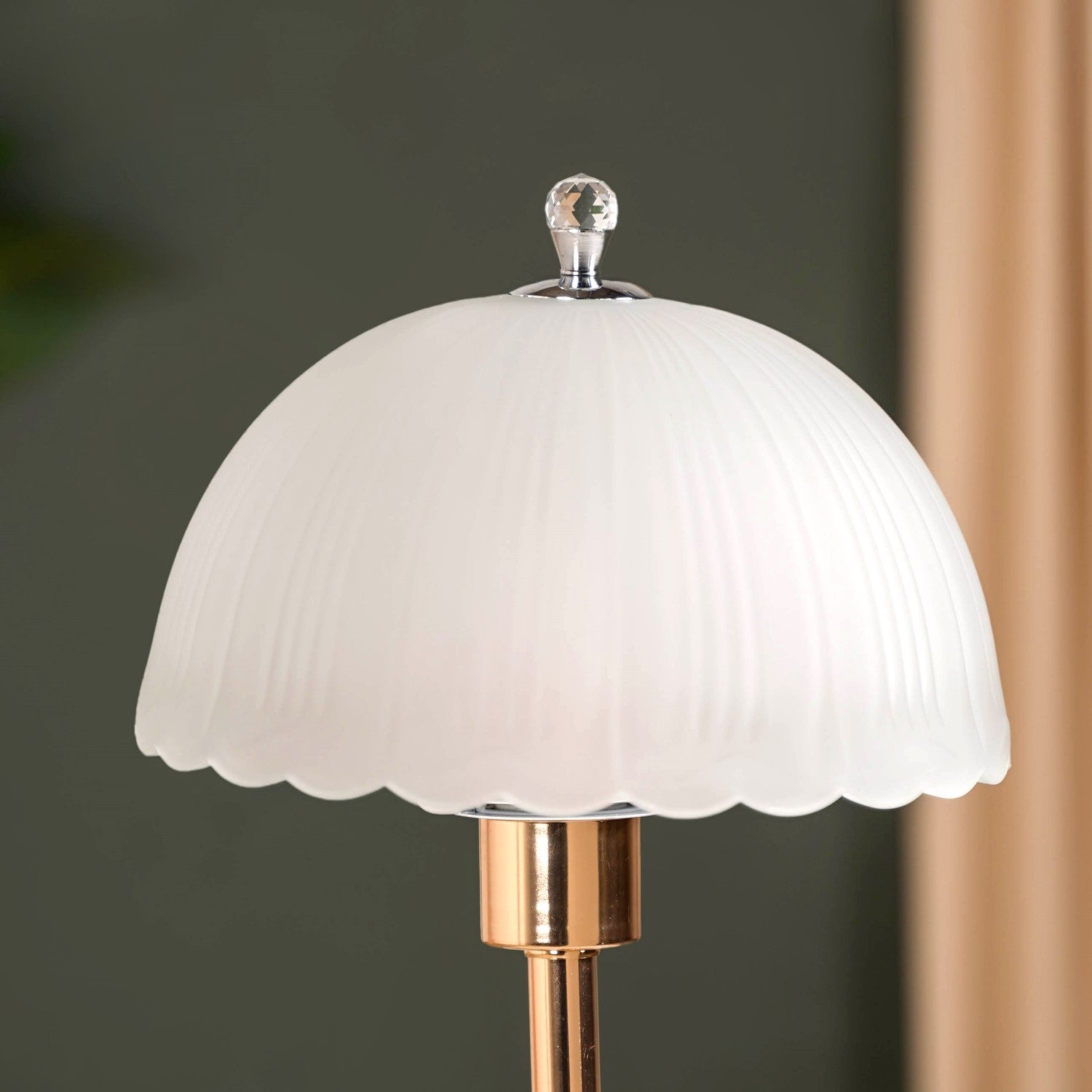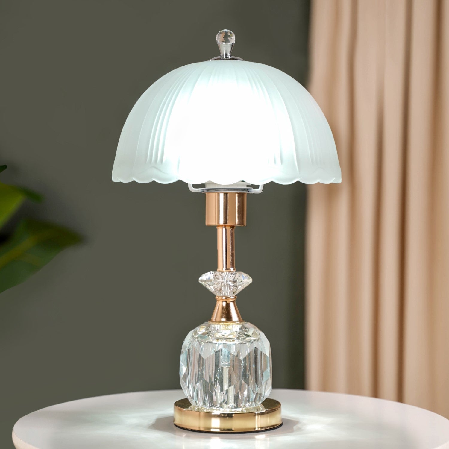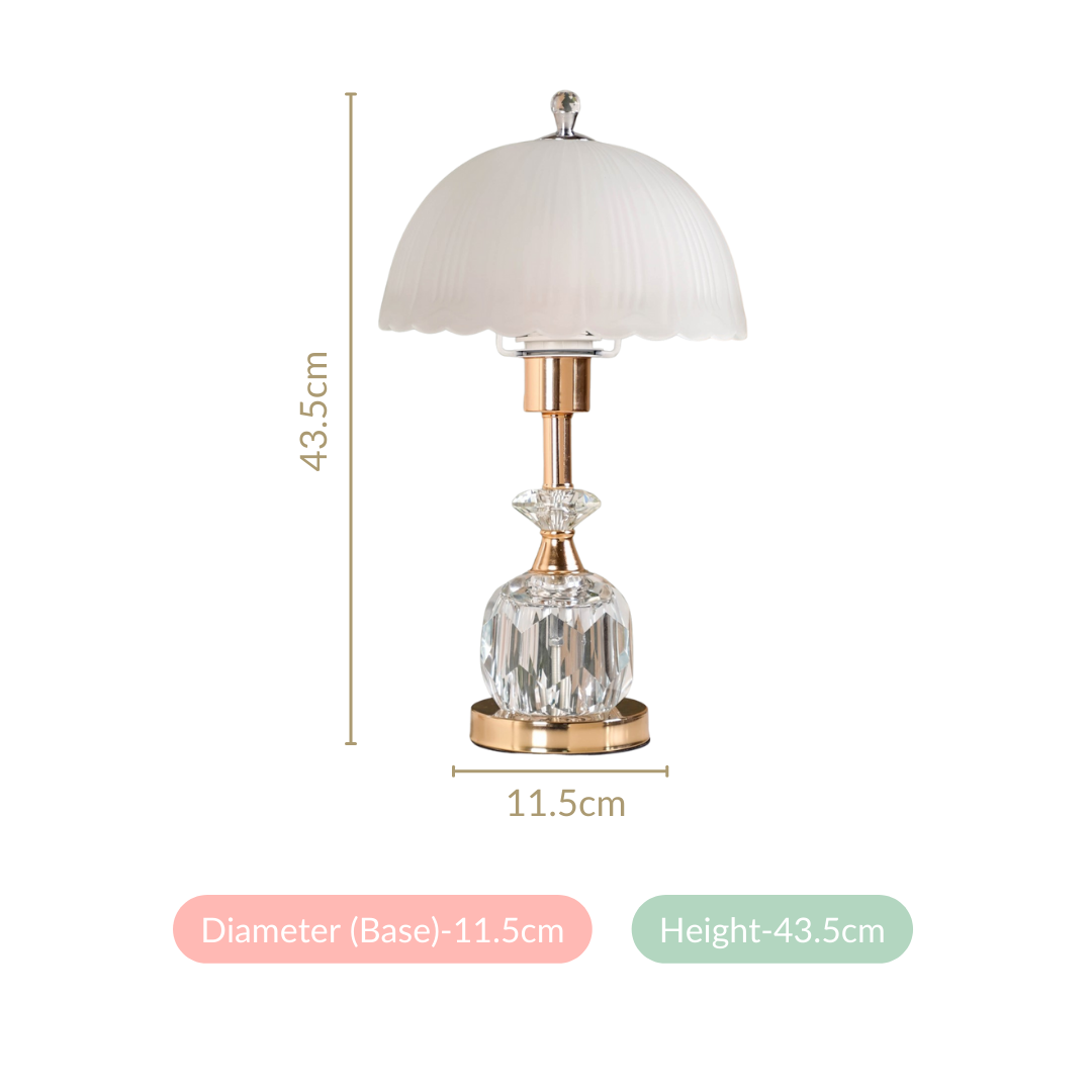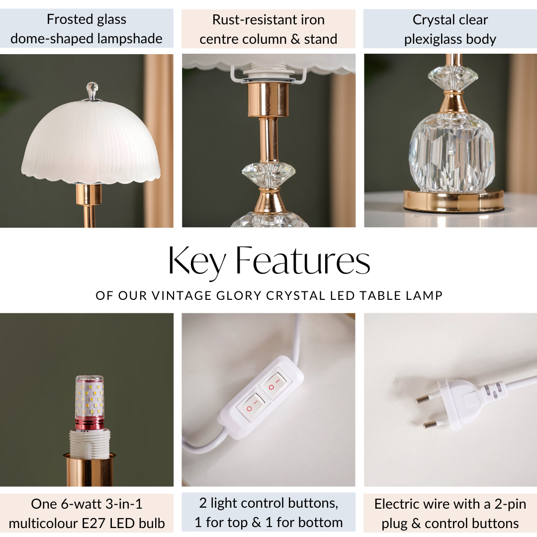 Design: The bedside lamp’s elegant frosted glass dome-shaped lampshade casts a soft, diffused glow, creating a calming ambience. Its standout feature is the crystal-clear plexiglass body with a cut-glass diamond texture, offering a striking contrast against the sleek metallic rose gold iron column. Equipped with a 3-in-1 multicolour E27 LED bulb, the table lamp for bedroom or living room can shift between cool white, warm white, and neutral white lighting, making it versatile for different moods and occasions. Separate control buttons allow you to illuminate the top lampshade and the lower plexiglass body individually for customisable lighting.