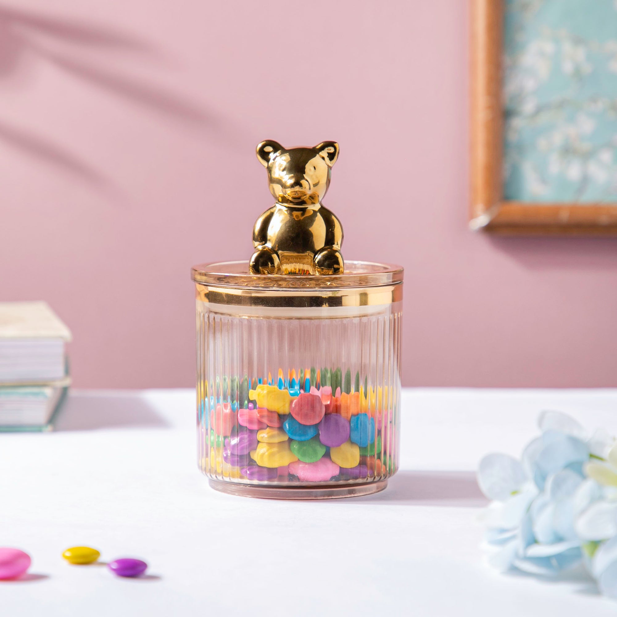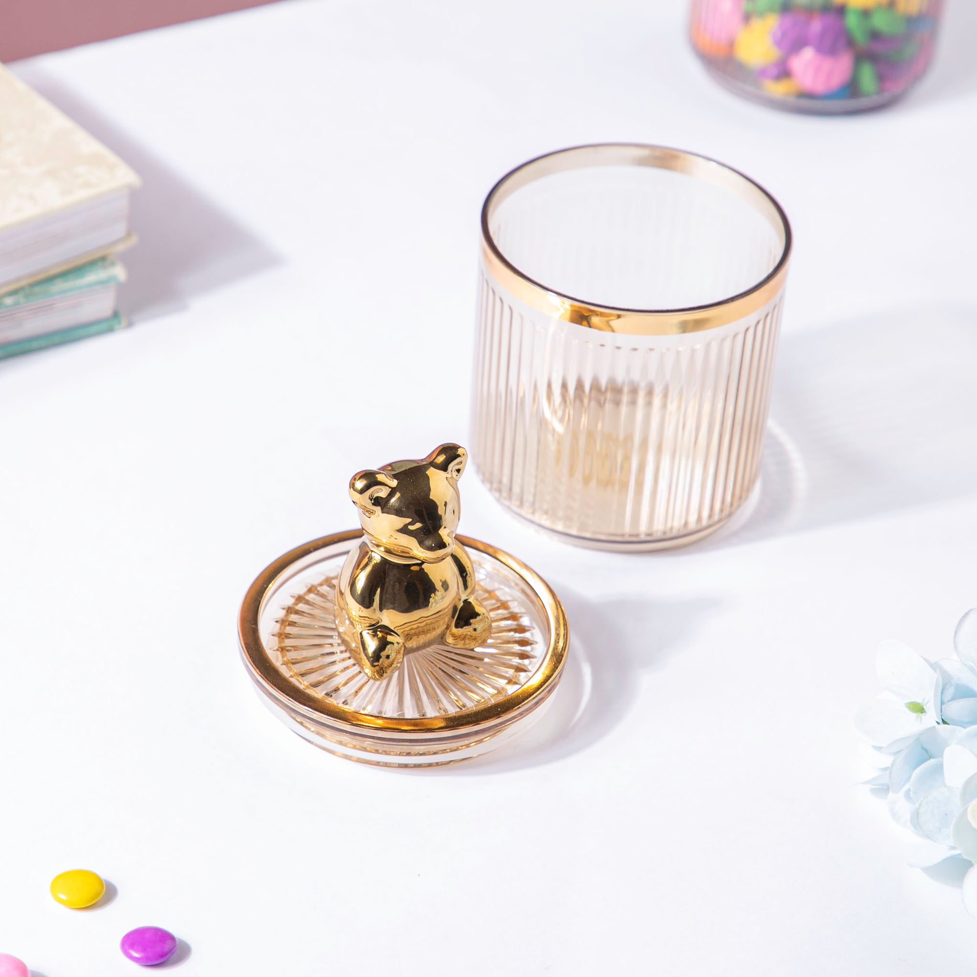 Teddy bears are adored by everyone regardless of age. They are the first idea for any Valentine's present or birthday gift. We can call them the most seamless option for gifting. Here, the jar with a lid is also adorned with a golden teddy on top of the lid. The gold detailed embellished jar radiates an antique charm and undoubtedly makes it perfect as a precious gift.