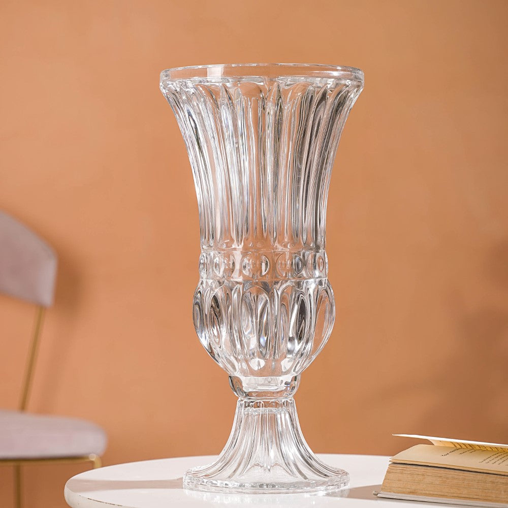 The large glass vase is the ultimate statement piece for your home decor which is sure to turn heads. Inspired by vintage aesthetics, the tall flower vase sits on an elevated base to uplift any flower arrangement. The exquisite glass vase boasts a unique design that is reminiscent of a wine glass, adding a touch of elegance and sophistication to any room. The big flower vase for living room is perfect for holding an abundance of flowers, and greenery. The intricate detailing on the clear vase creates a captivating visual that is sure to leave a lasting impression on guests. Our decorative vase is crafted from high-quality and durable material. Add this glass vase decor to your collection and have a glamorous interior.
