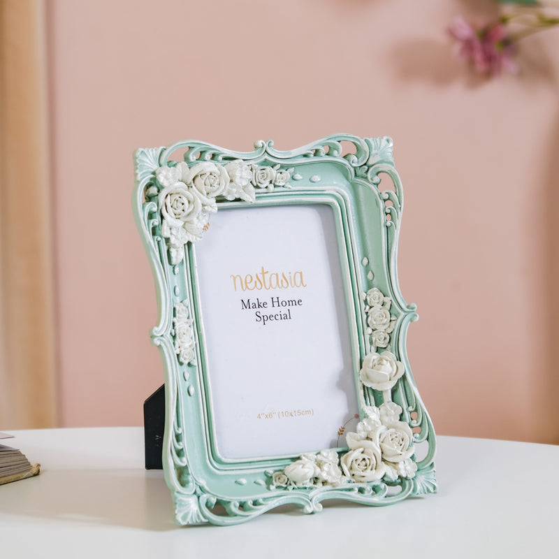 While the resin photo frame carries a vintage charm and intricate details, its subtle mint green colour can complement a minimalist decor setup. The frame's sophistication and simplicity make it a versatile choice for adding a touch of character to a minimalist space without overwhelming it.