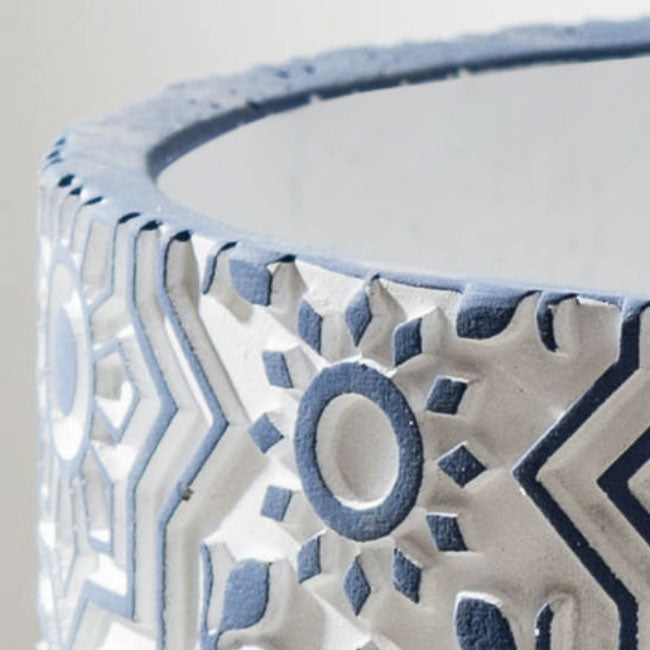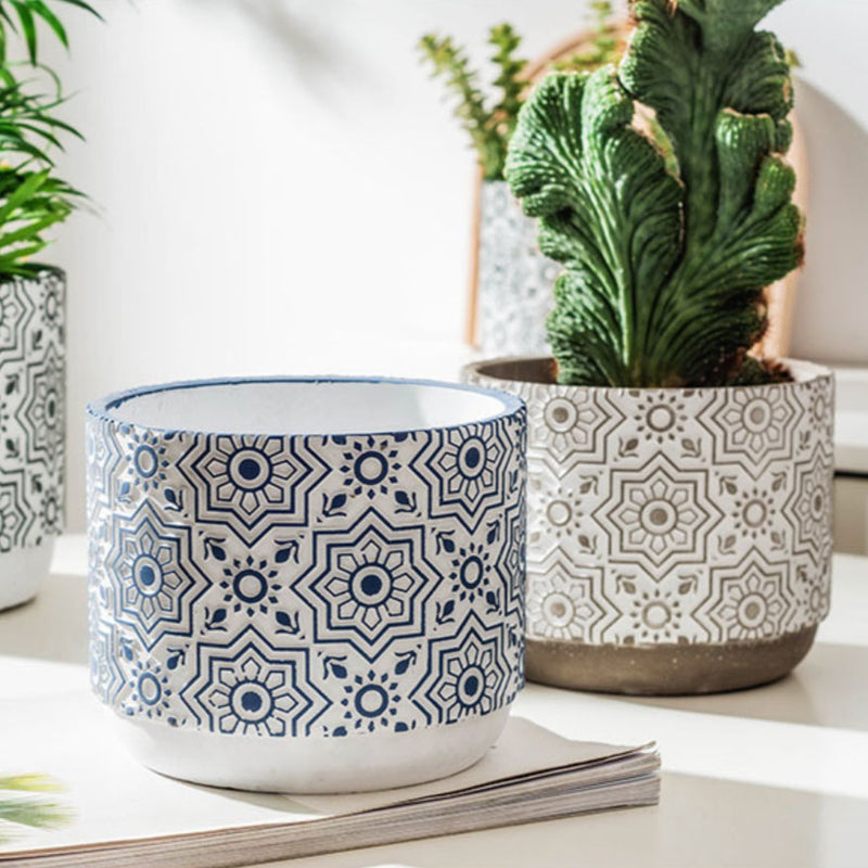 The round ceramic pots in floral geometric pattern is a brilliant piece for a contemporary house. The contrasting design in bright blue and brown against the white backdrop will create a striking pattern for an urban home. Deck up the plant pot with floral and indoor plants to enhance the overall décor of the space.