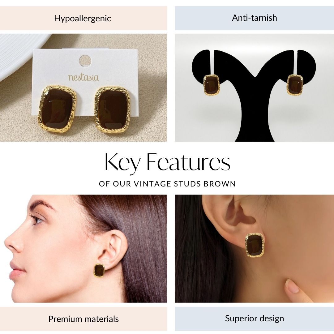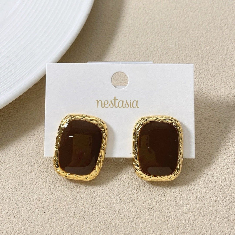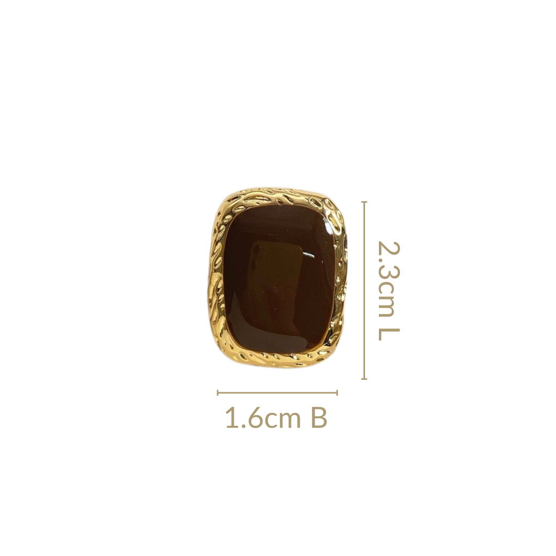 Timeless elegance meets contemporary simplicity in this exquisite pair of stud earrings. Drawing inspiration from the rich aesthetic of vintage jewellery, with its warm tones and bold yet graceful design, these earrings blend classic beauty with modern minimalism. The curved rectangular shape is framed with a textured gold border, while the dark chocolate brown centre adds a touch of sophistication. These earrings offer a perfect balance of vintage charm and modern chic, ideal for those who appreciate understated luxury.