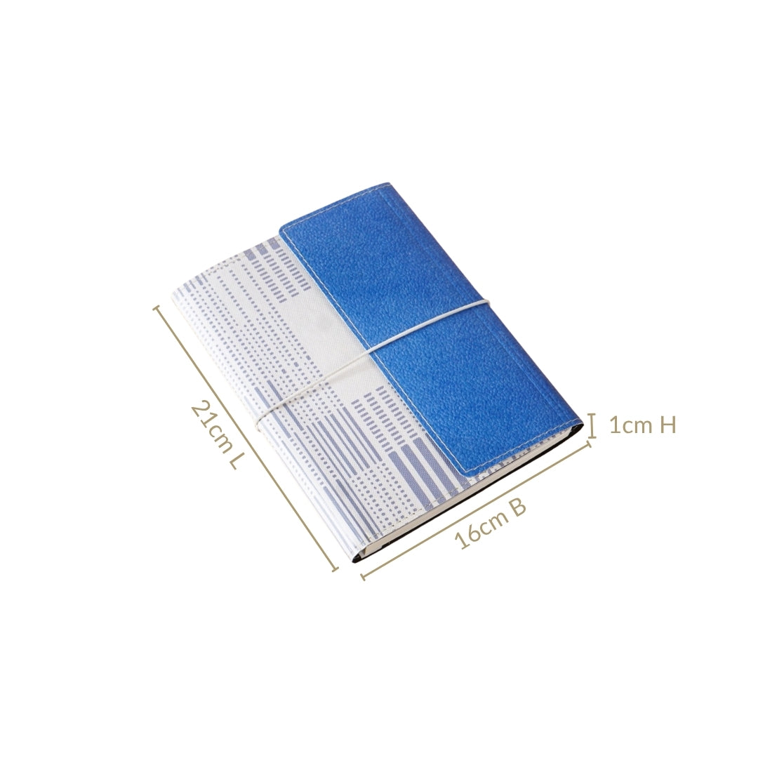 Design: The notebook features a striking half-and-half aesthetic, one side boasts a bold blue eco-leatherette spine with a textured finish, while the other showcases a contemporary white base with Morse code-like pattern in shades of grey. This contrast evokes a modern feel. Made with a durable hardbound cardboard base and soft-touch eco-leatherette wrap, it looks stylish in your hands and on your work desk. The notebook is secured with a white elastic band that loops around the middle, offering both function, keeping your notes safe. The smooth premium pages and a sleek black spiral binding ensure a seamless writing experience. It also comes with an inner flap pocket that is perfect for tucking away notes, bills, or small keepsakes. The diary includes sections for personal details, emergency contacts, monthly planning, and lined pages for notes, making it a great organiser.