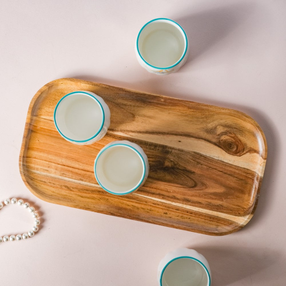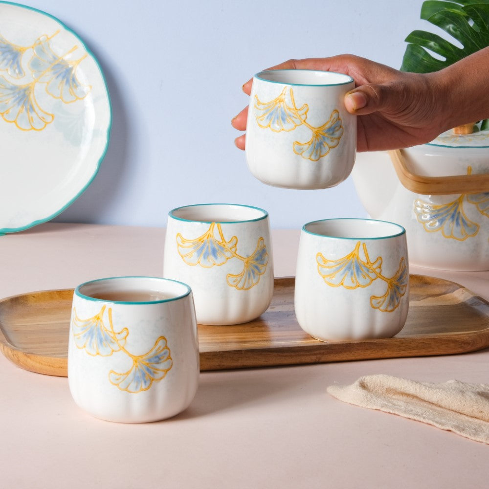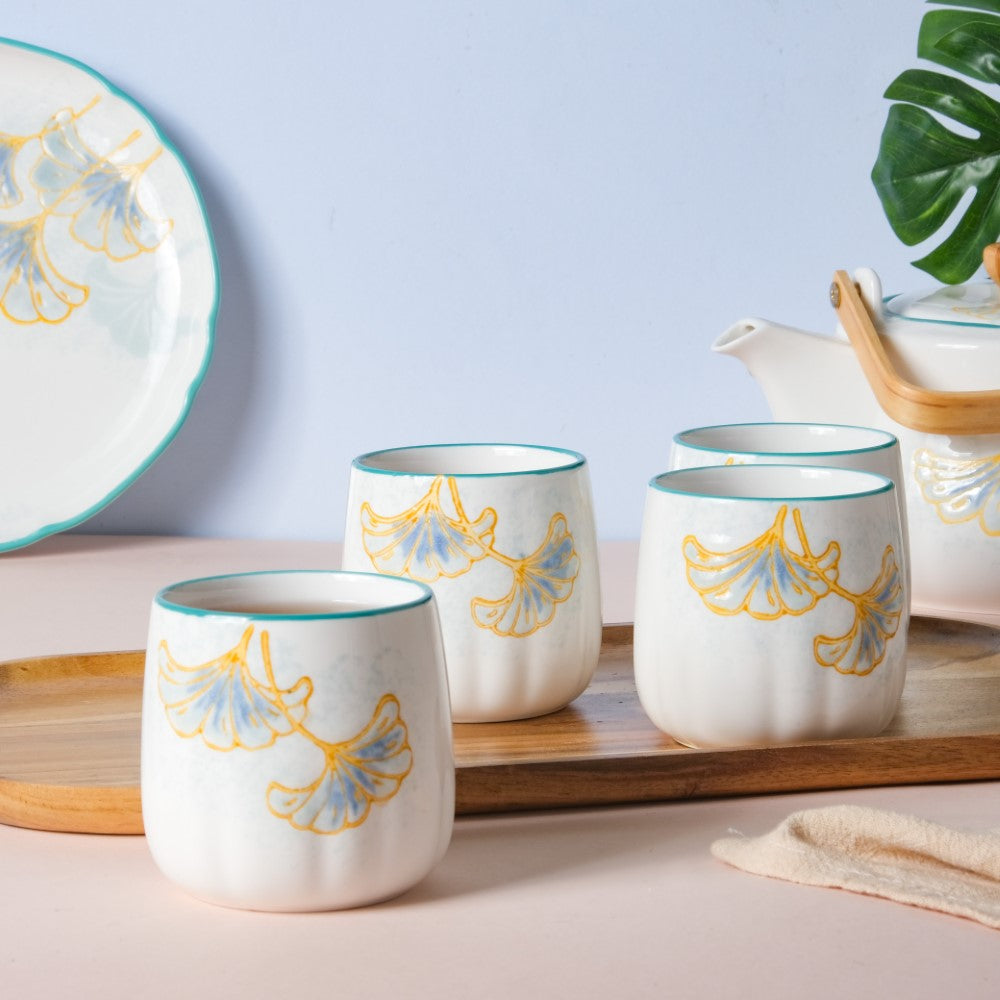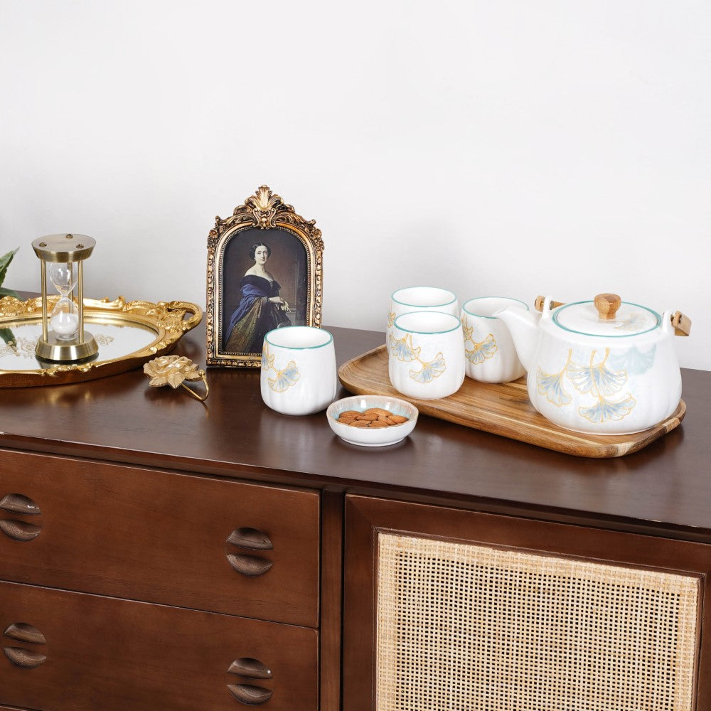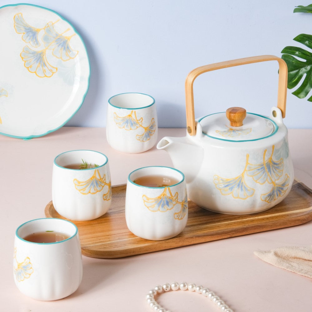 The vintage white tea serving set comes in a floral print. The tea set includes a teapot with a bamboo handle, four tumblers, and a rectangle serving tray. While the trays can be used for serving tea or coffee, they can also double up as snack platters which can elevate the sipping experience. The tea set can also be used for serving hot as well as cold beverages.