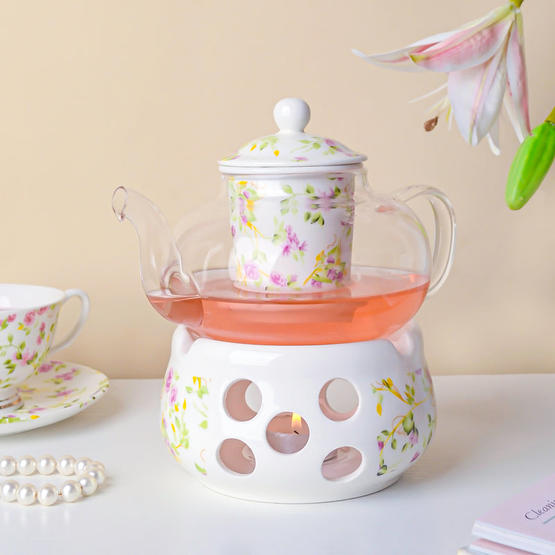 The fancy glass teapot comes with a ceramic tea warmer and infuser with a lid. The c-shaped handle of the glass kettle aids in the convenient pouring of beverages while serving. Delightful purple floral prints adorn the surface of the ceramic infuser and the tea warmer, which is placed at the base of the transparent teapot. The ceramic warmer aids in keeping one's tea warm for a longer period of time. Brew tea leaves or coffee into the glass teapot and serve it hot to guests at family get-togethers and social functions.