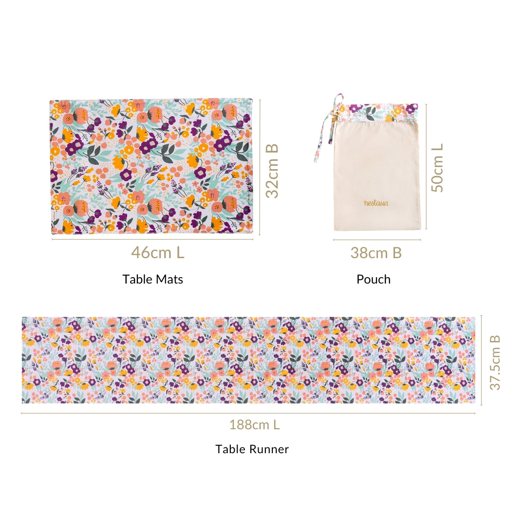 Design: Think rich purple hues, playful floral patterns, and just the right amount of sophistication. The table runner steals the show with its vibrant design, instantly upgrading your dining table from ‘meh’ to ‘marvellous.’ It’s soft, durable, and perfect for both fancy feasts and relaxed family meals. The placemats? Oh, they’re not just pretty – they’re practical too! Sturdy enough to handle hot dishes and spills while still looking effortlessly chic. And when the meal’s over, just tuck everything into the matching storage pouch – because stylish tables deserve a stylish way to stay organised!