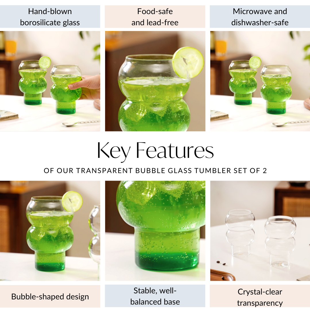 Design: These drinking glasses feature an eye-catching bubble-shaped design that adds a touch of sophistication to your beverage presentation. The stable, well-balanced base ensures security, while the crystal-clear transparency highlights the drink’s natural colours.