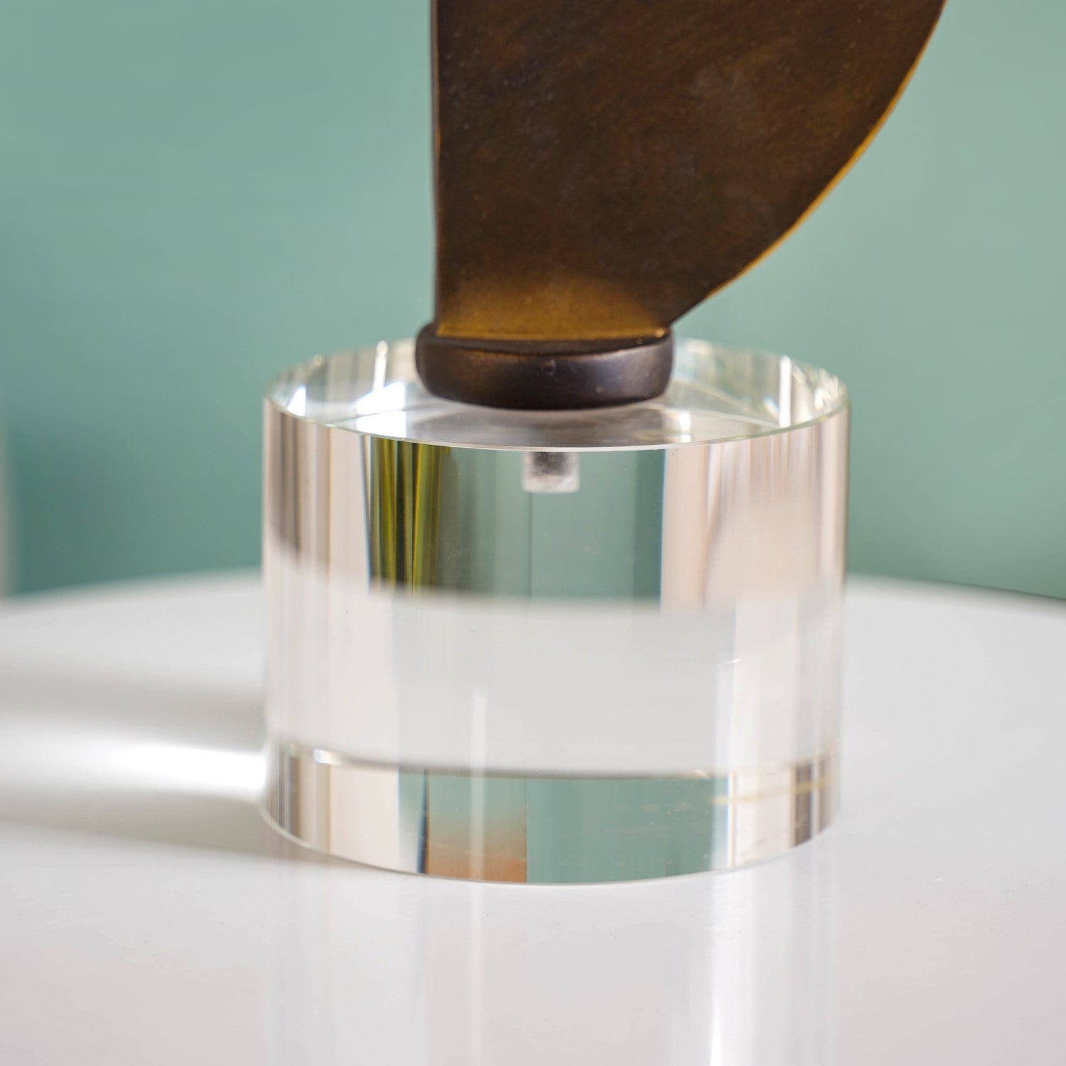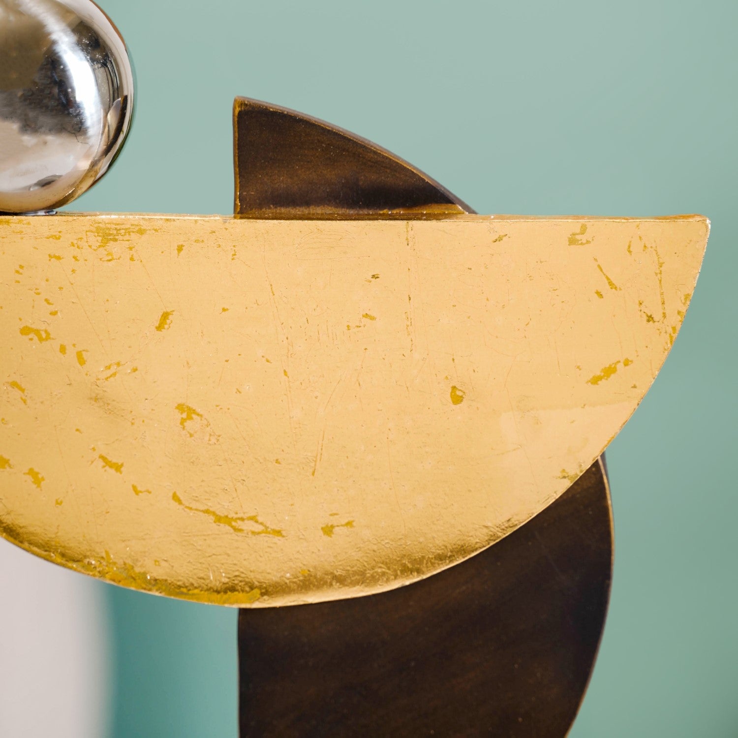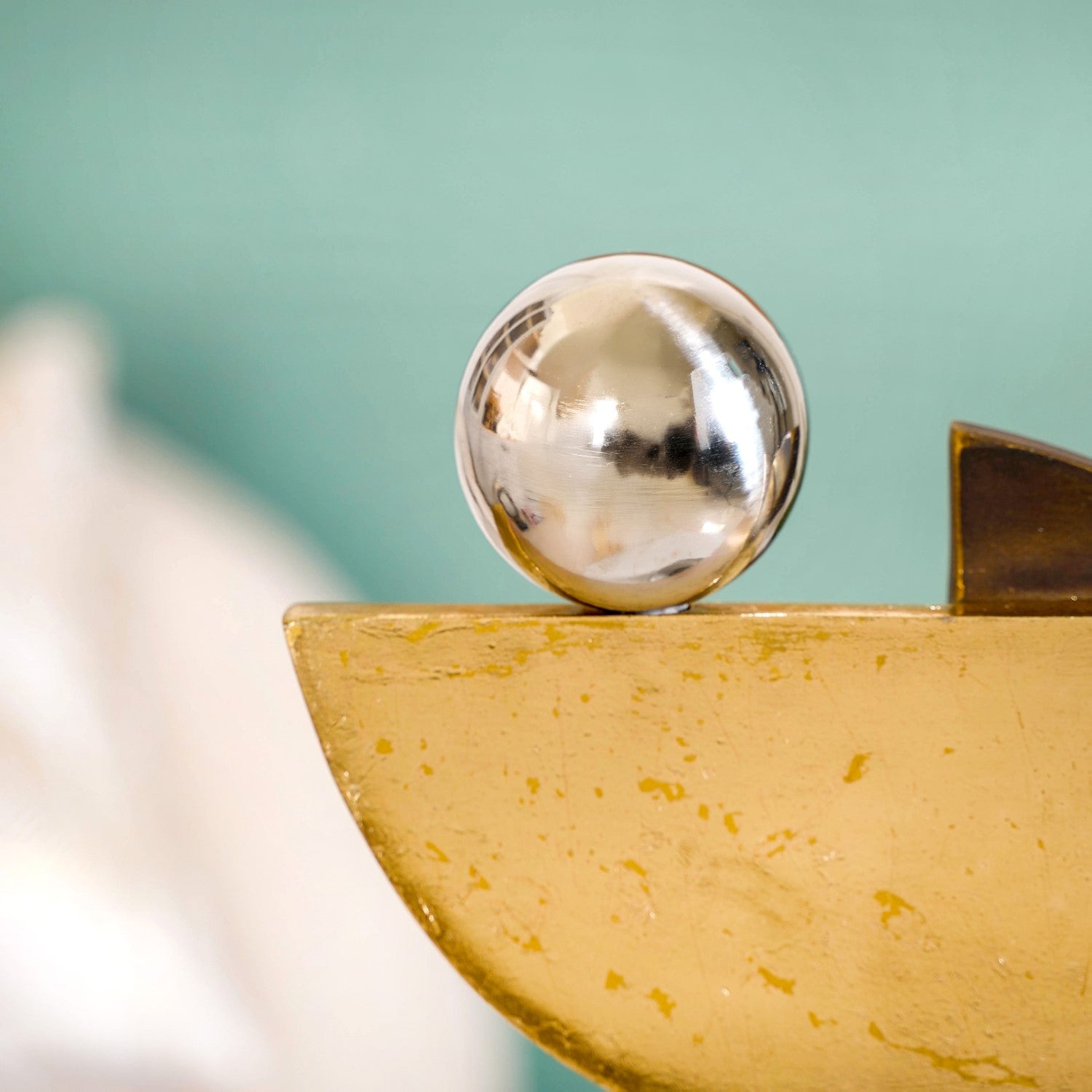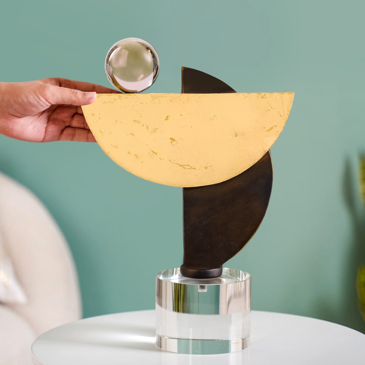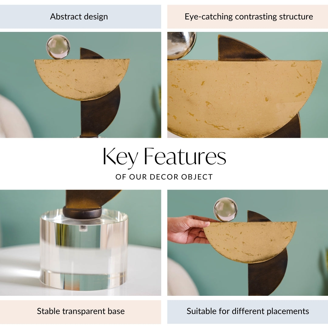 Design: This sophisticated decor object features a captivating abstract design that harmoniously balances fluid curves and sharp angles. The eye-catching contrast is achieved by juxtaposing a brilliant, mirror-finish silver sphere against a richly textured, matte gold body and solid black supports. The entire structure maintains a sturdy structure, perfectly anchored by a thick, stable transparent base that ensures both security and a unique floating visual effect.