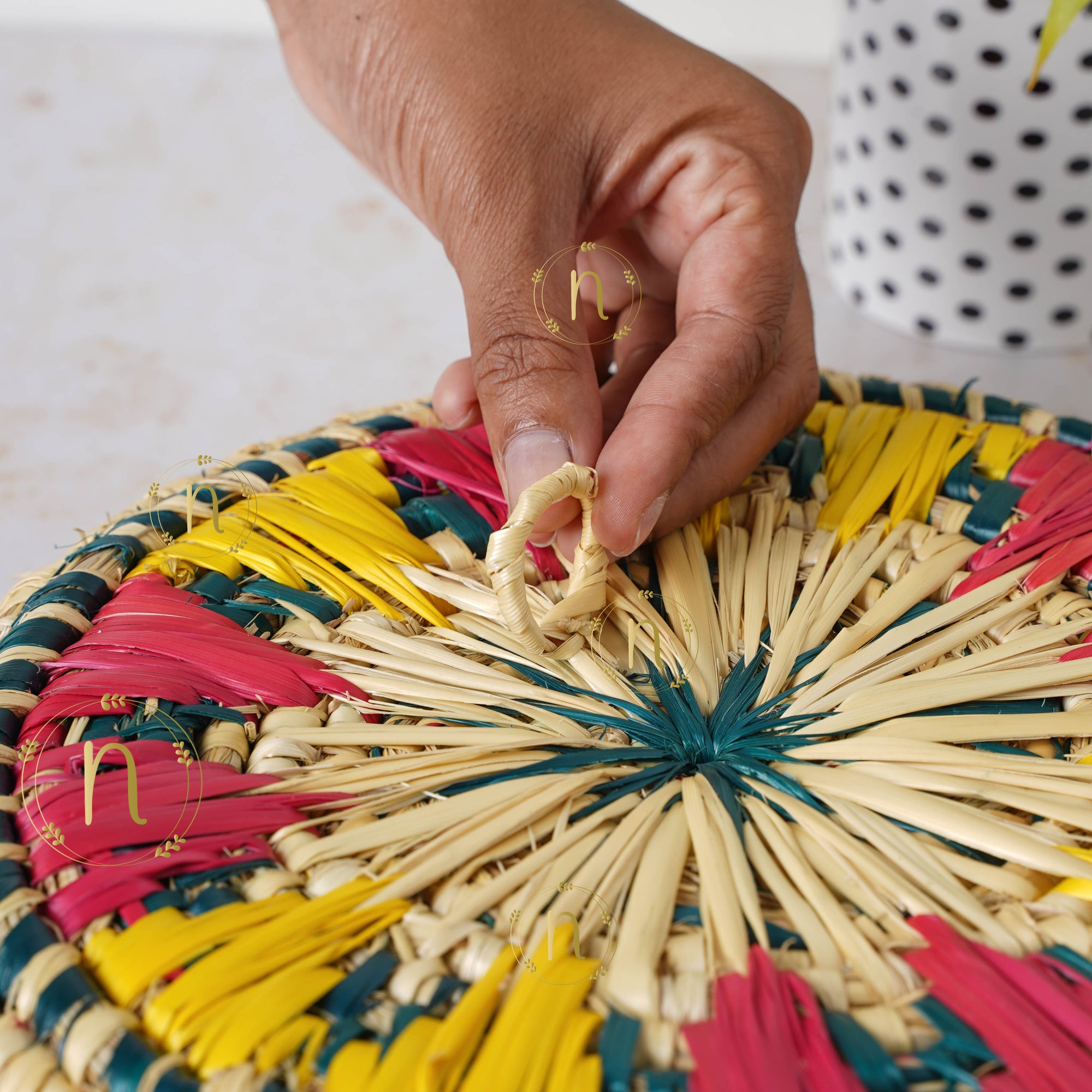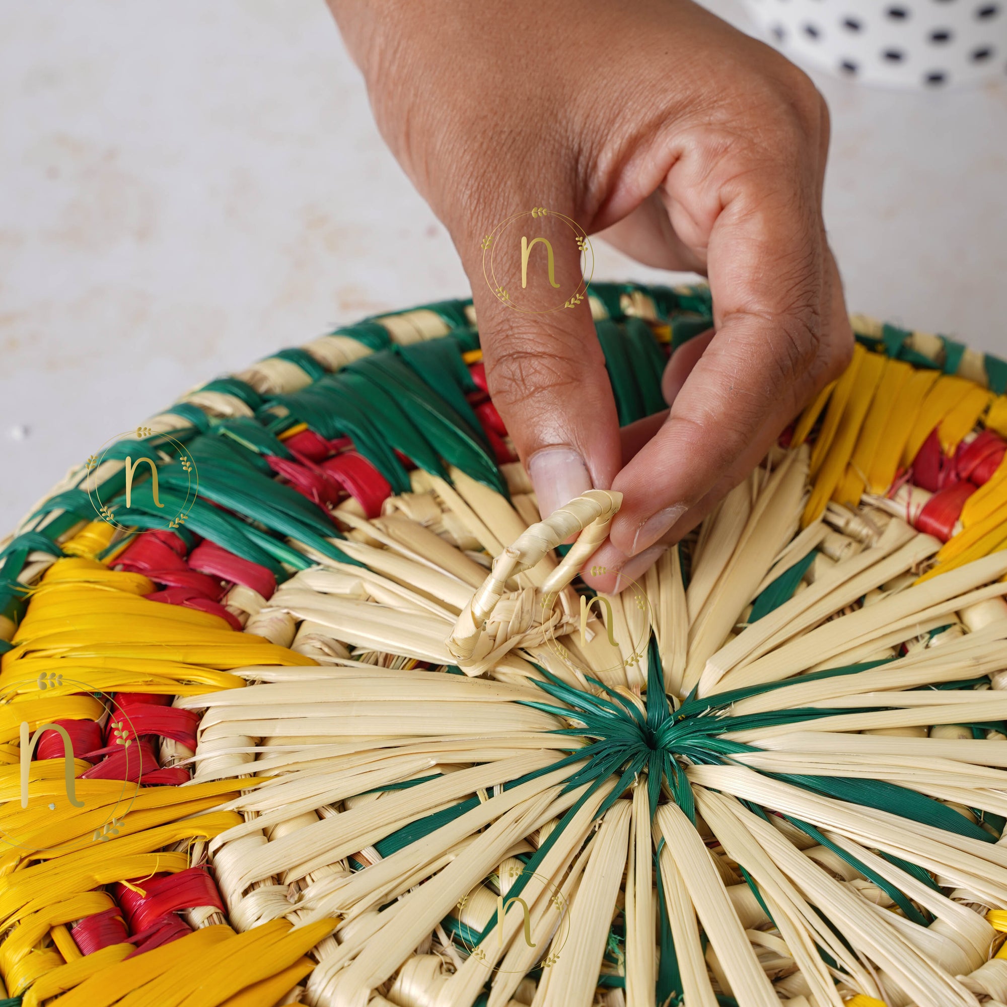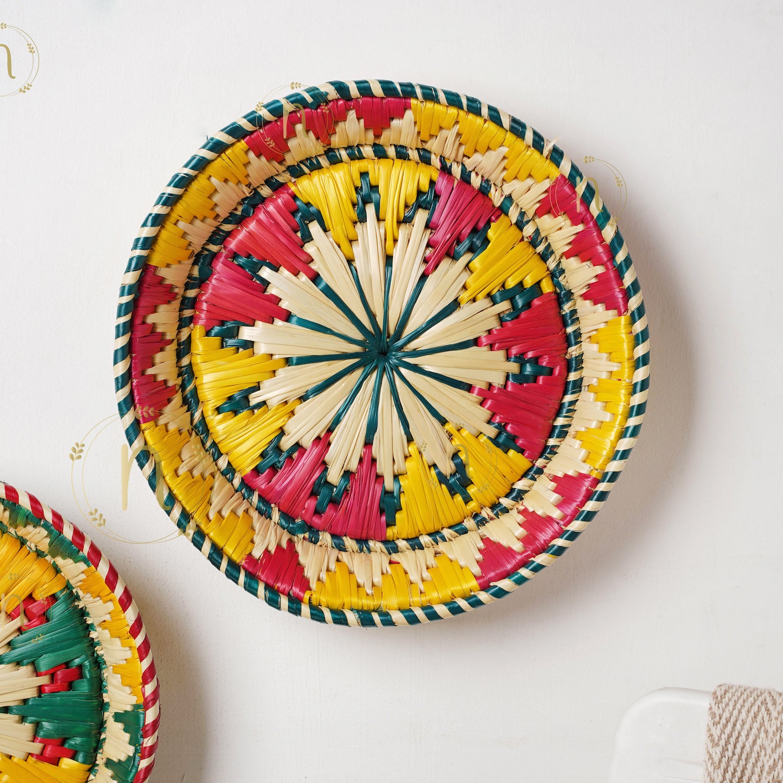 Bright and vibrant Moonj wall decor for the extra Jungalow feel to the room setting. Handmade and eco-friendly, the Moonj wall decorations come in 2 exquisite color variants. The handwoven items have attractive floral patterns weaved on them and are dyed with natural colors and made by village women with a lot of attention to detail and care. The multipurpose product can be used to protect the dining table from heated utensils by using them as trivets. The bohemian tray can also be utilised as a fruit or vegetable basket.