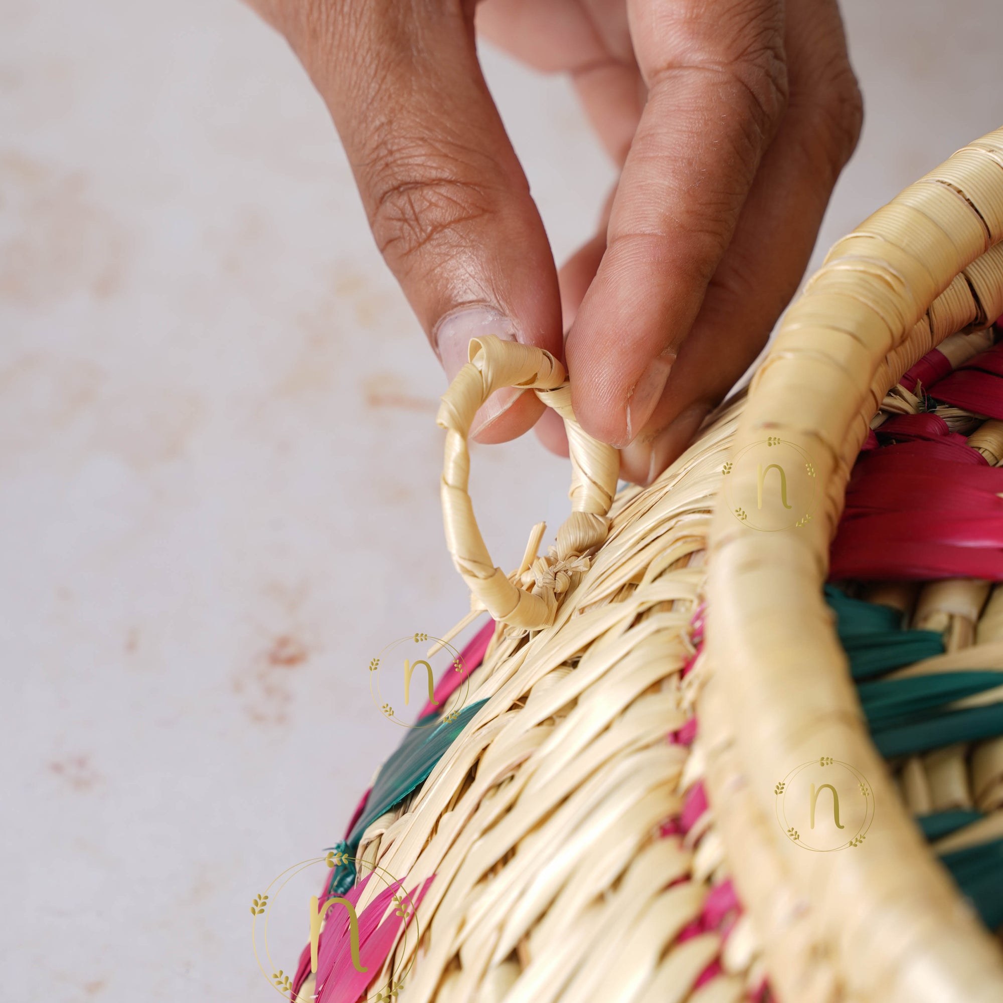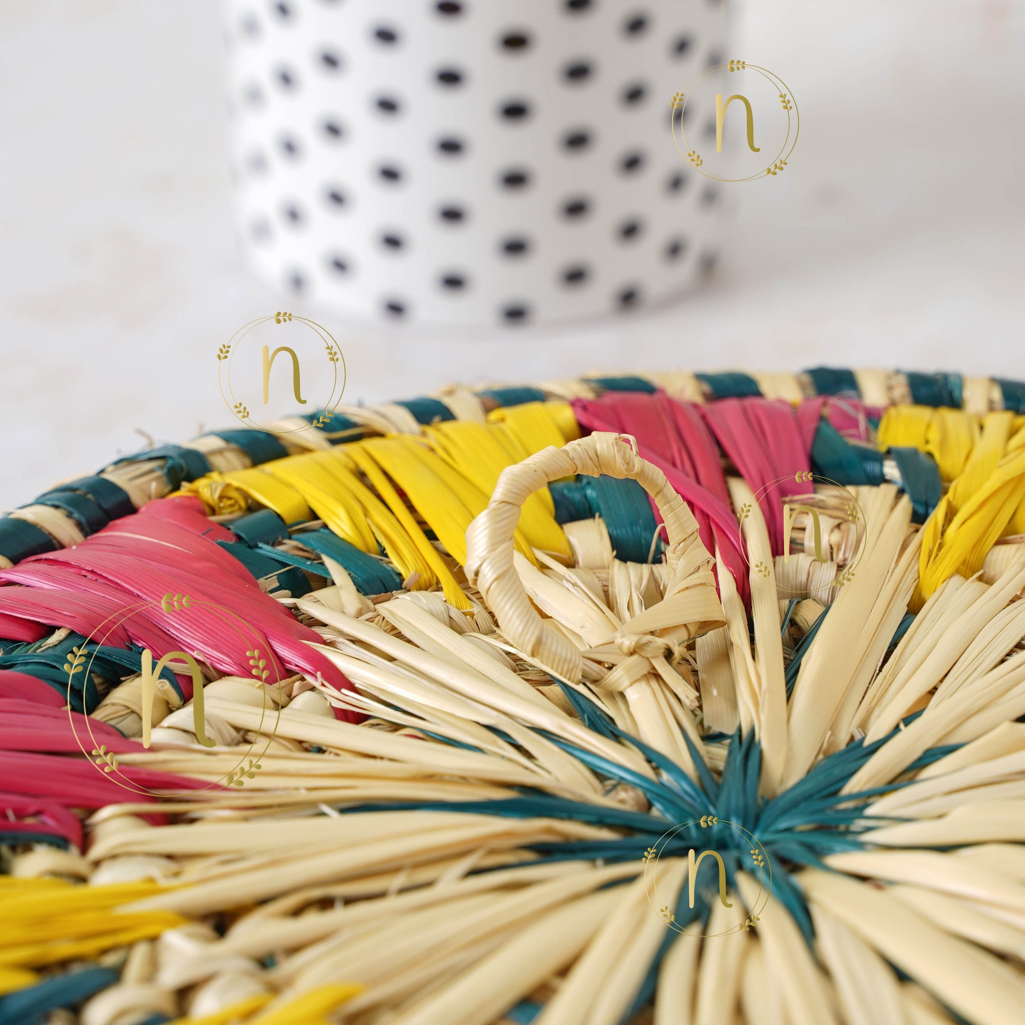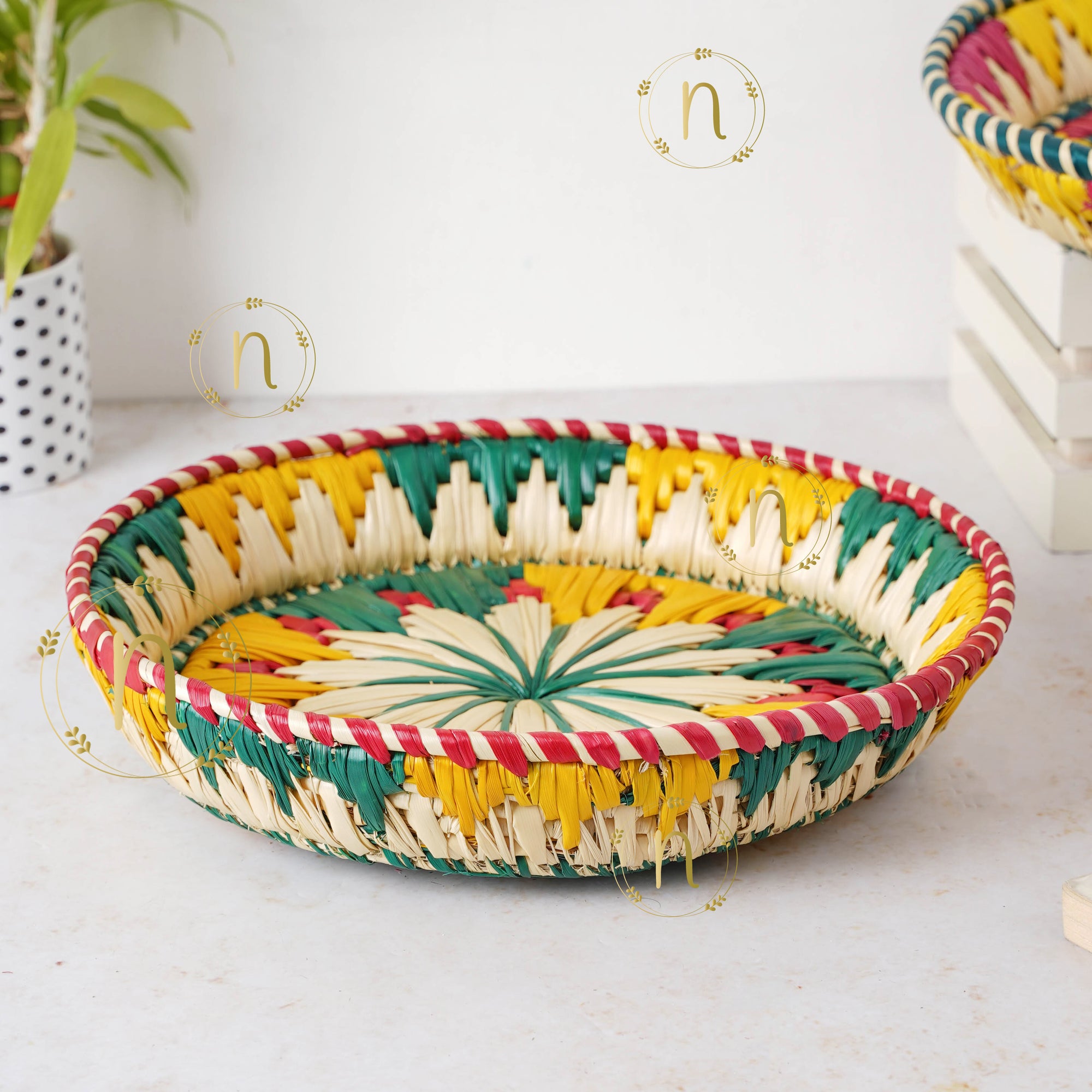 Bright and vibrant Moonj wall decor for the extra Jungalow feel to the room setting. Handmade and eco-friendly, the Moonj wall decorations come in 2 exquisite color variants. The handwoven items have attractive floral patterns weaved on them and are dyed with natural colors and made by village women with a lot of attention to detail and care. The multipurpose product can be used to protect the dining table from heated utensils by using them as trivets. The bohemian tray can also be utilised as a fruit or vegetable basket.