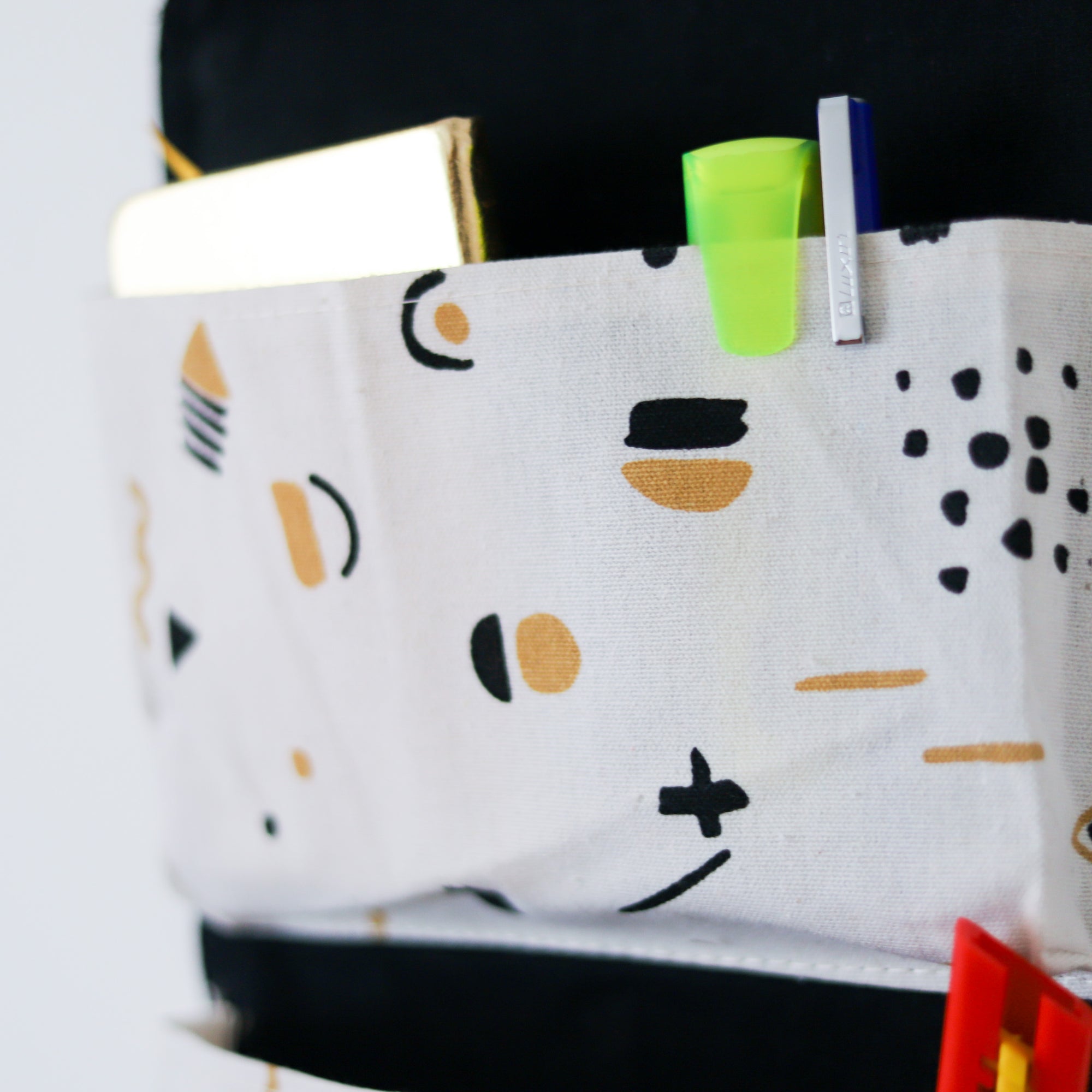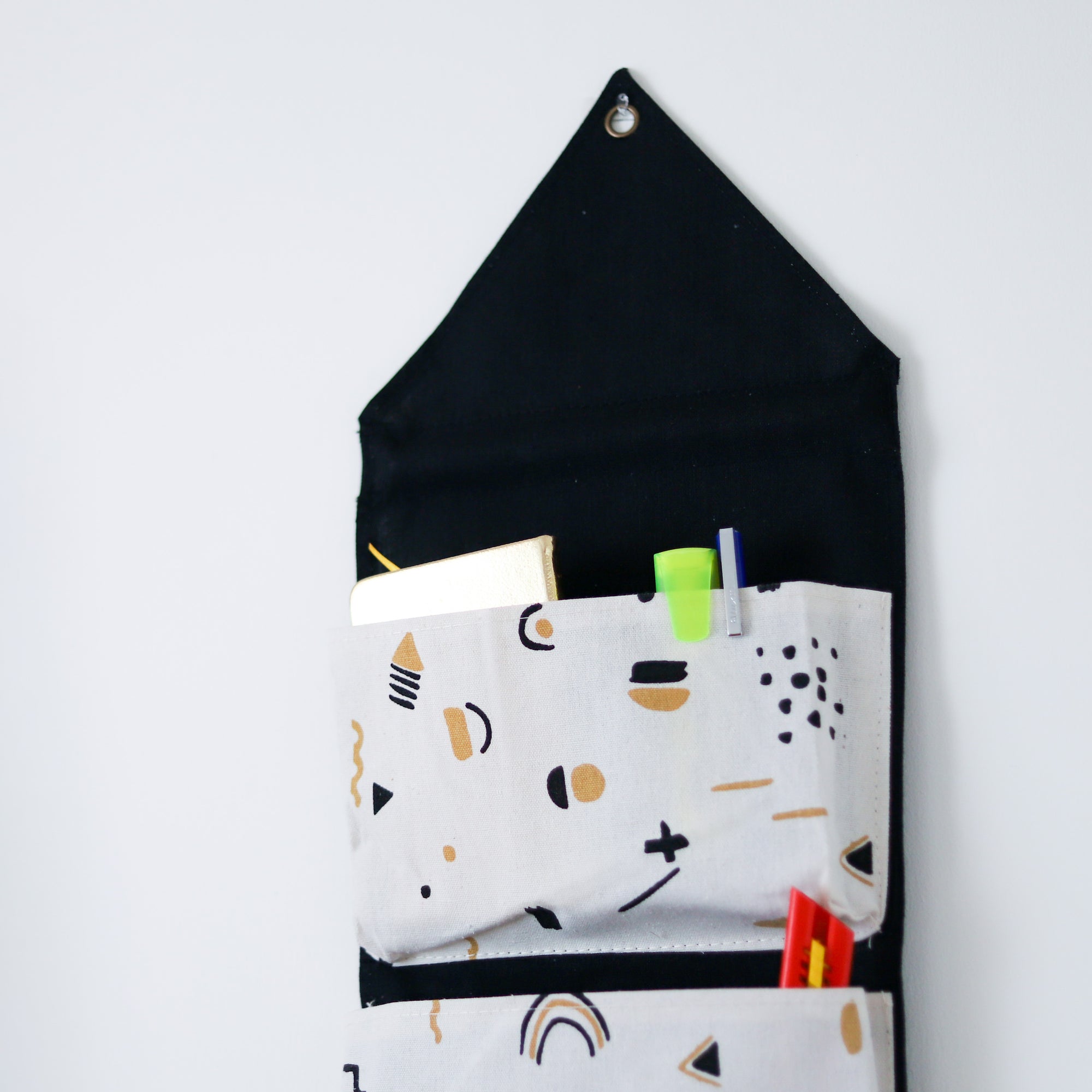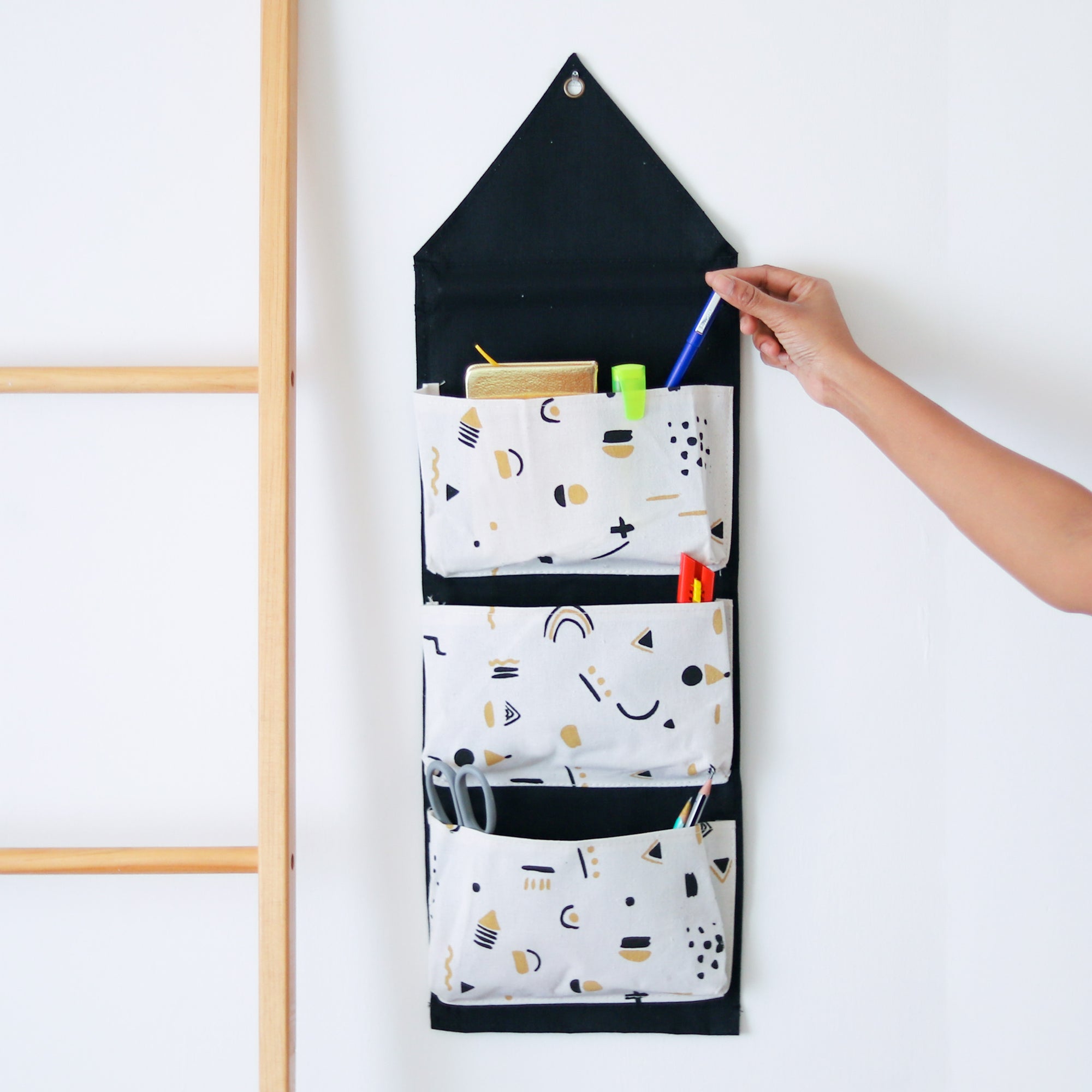Wall hanging with pockets that is a wall organizer and comes in a colour combination of black and white. The wall organizer is apt for storing small toys, papers, envelopes or can be used as a kitchen wall organiser. The wall hanging organizer can be a fit for someone who likes to keep things organised. The wall hanging can be used to keep small clothes and napkins of the little ones.