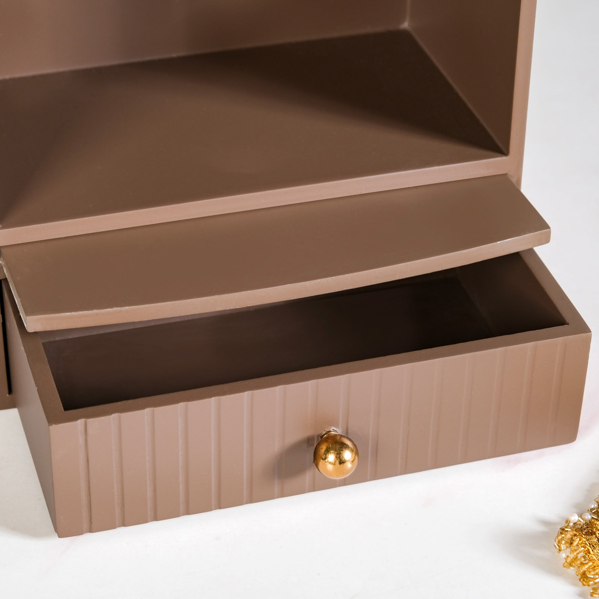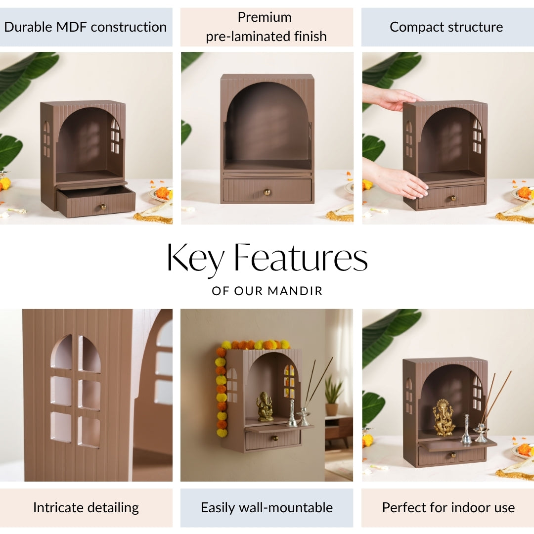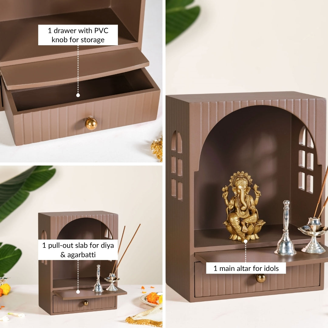 Benefits: This pooja mandir for home offers a lasting and low-maintenance solution for everyday worship. Its rich brown finish and balanced proportions make it suitable for various decor styles, from minimal to classic. Built to be easily wall-mountable, it creates a stable and secure home for your idols. The drawer provides practical storage for essentials, keeping the space clutter-free. Lightweight and portable, it can be placed on tables or shelves, serving as a serene pooja ghar for homes and offices alike.