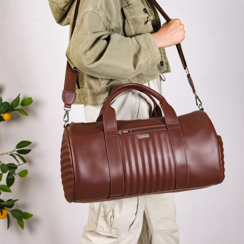 Our large brown duffel bag is a go-to choice for a traveller seeking versatility, functionality, and style. Whether you are planning a short weekend trip or you are going to the gym, the large duffle bag will be your reliable travel partner. The main compartment is ideal for carrying your clothes and other travel essentials, while the small front pocket is for keeping your charging cables, earphones, power banks, and more. The material resists tarnishing, keeping its newness for a longer time.