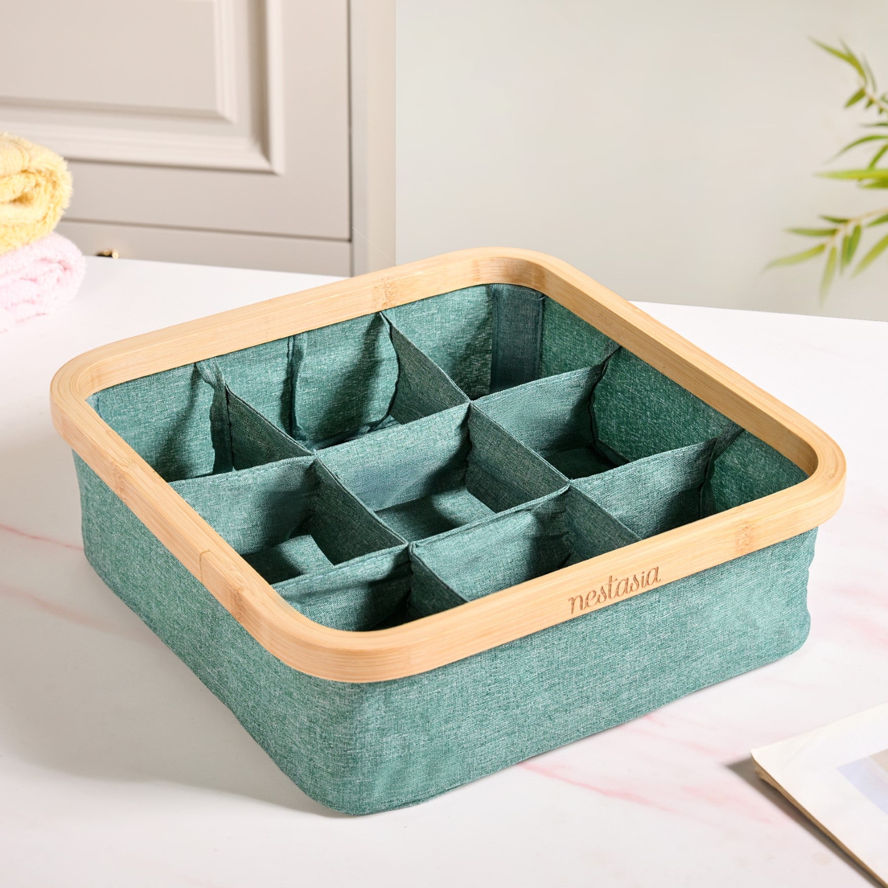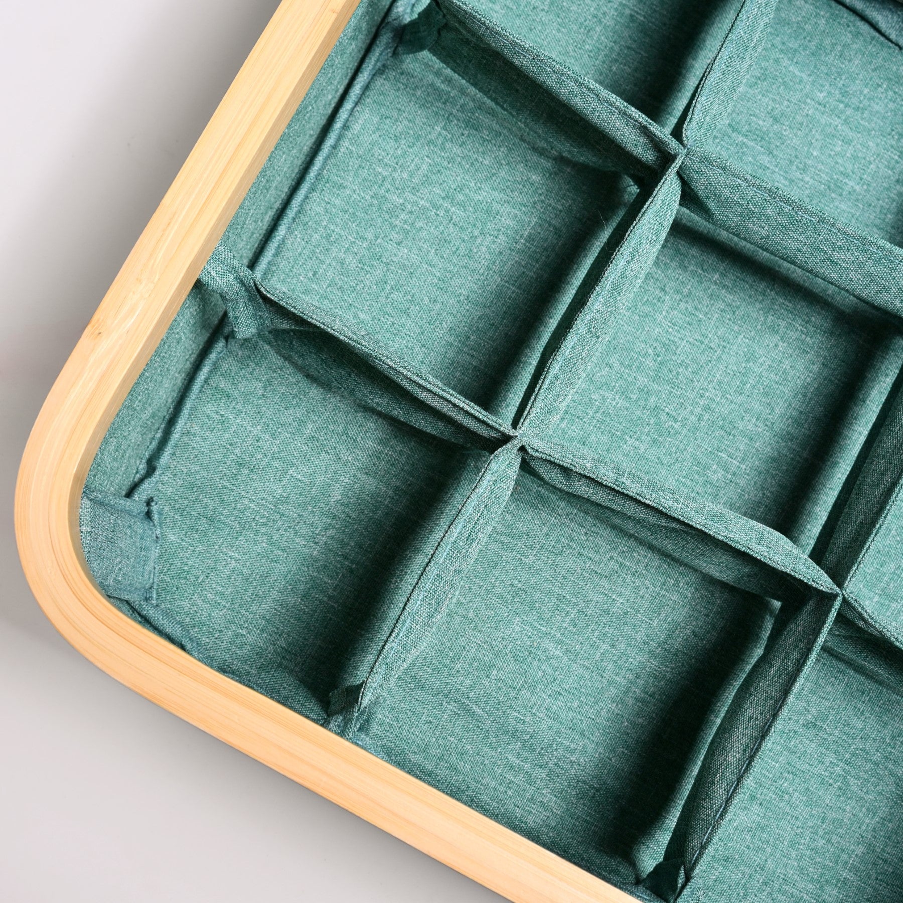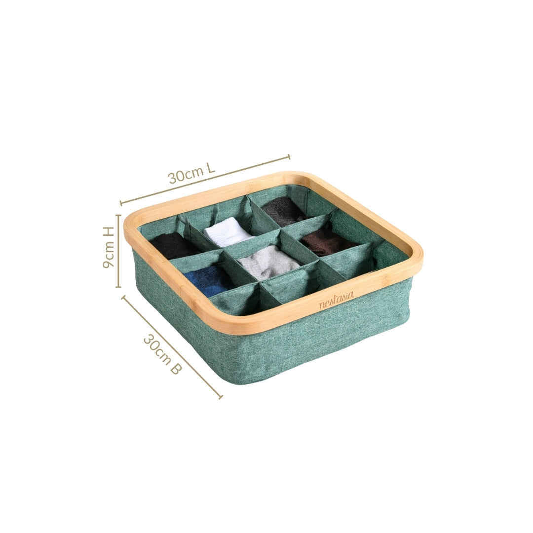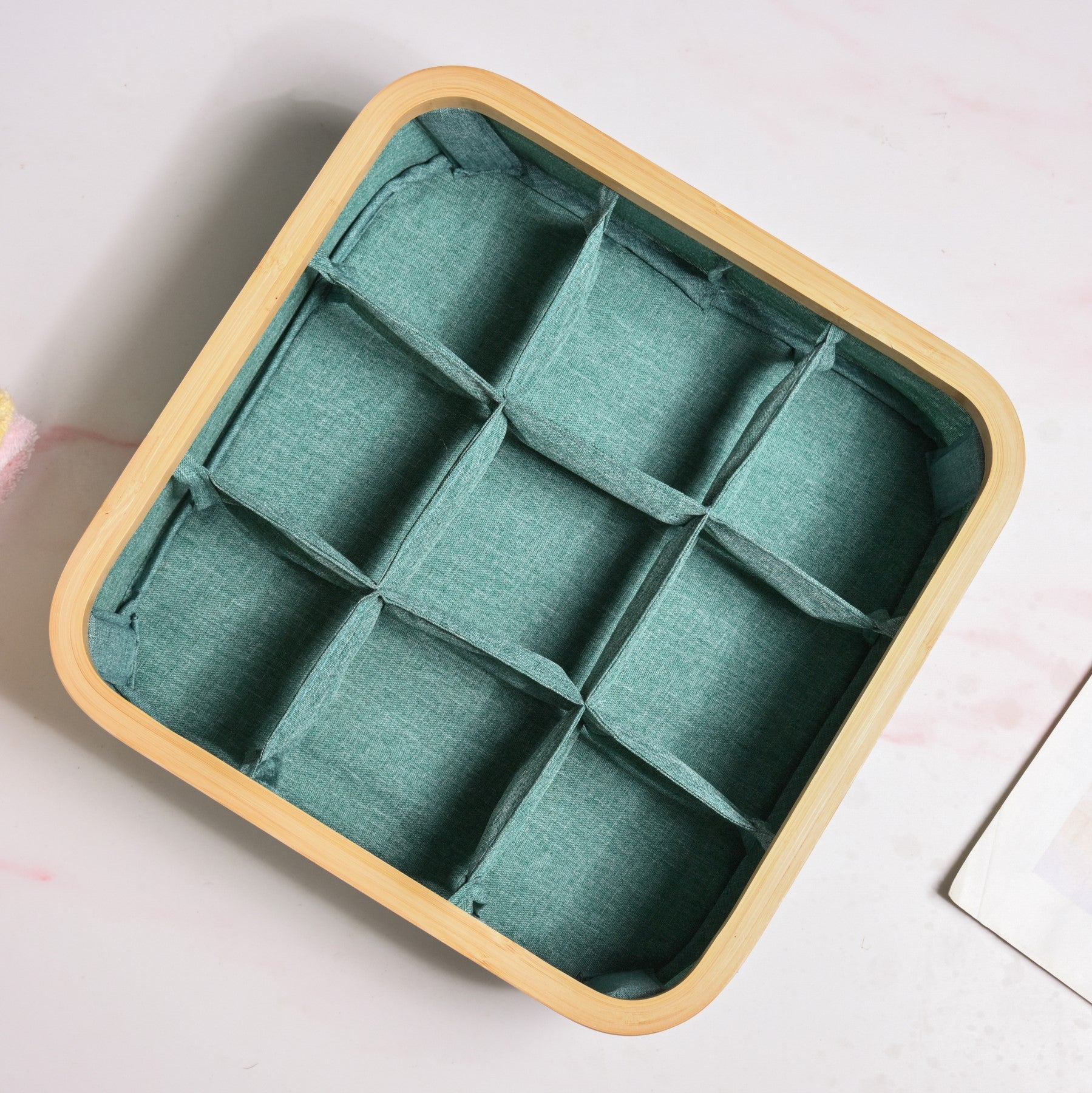 Design: Discover the thoughtful engineering behind this square-shaped storage basket, designed to fit effortlessly into your closet or dresser drawers. Crafted with a sturdy bamboo frame and smooth nylon fabric, it offers a clean, calming aesthetic that blends beautifully into any space. The basket features 9 individual compartments, perfectly sized for sorting your smaller essentials. Inside, a soft yet durable nylon lining offers a sleek finish, while internal bamboo sticks can be easily inserted and secured with velcro to give the basket its structured, upright form. A firm base ensures it stays stable, even when fully loaded.