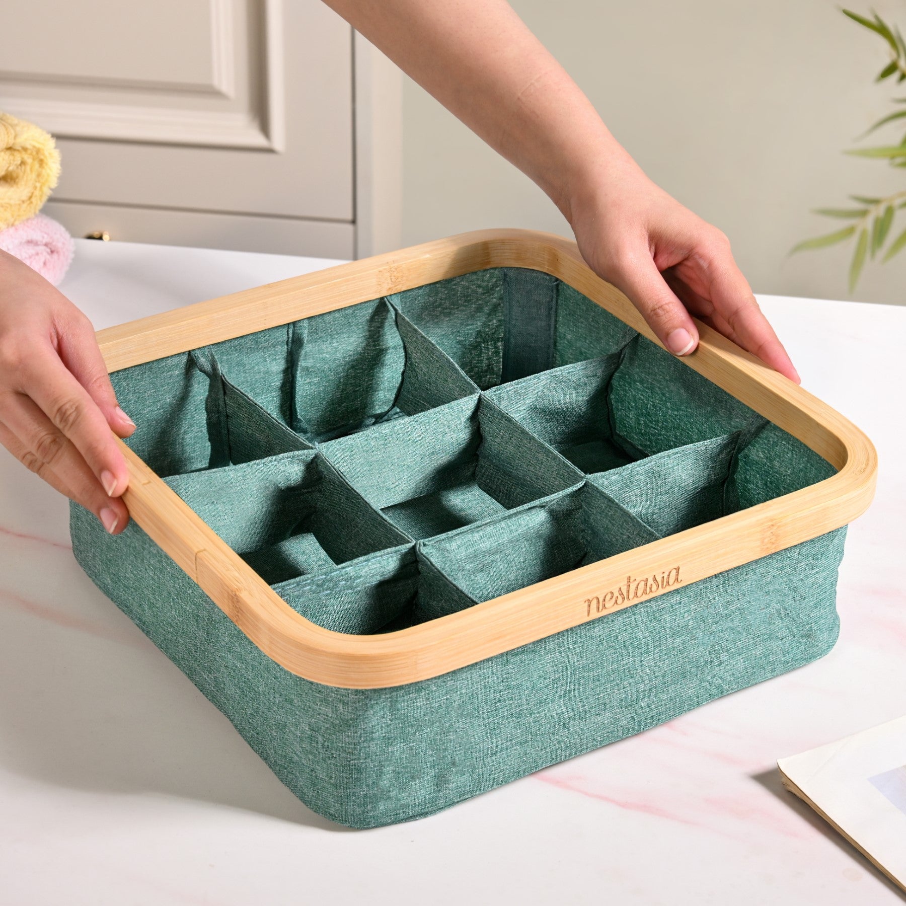 Benefits: With its lightweight build and easy-to-carry design, this organiser is made for convenience. When not in use, it folds down flat for compact storage, ideal for maximising every bit of space in your closet or drawers. Perfect for keeping socks, undergarments, ties, belts, or accessories neatly arranged and accessible. Thoughtfully made with natural bamboo and high-quality nylon, this basket brings together durability and style for everyday organisation that lasts.