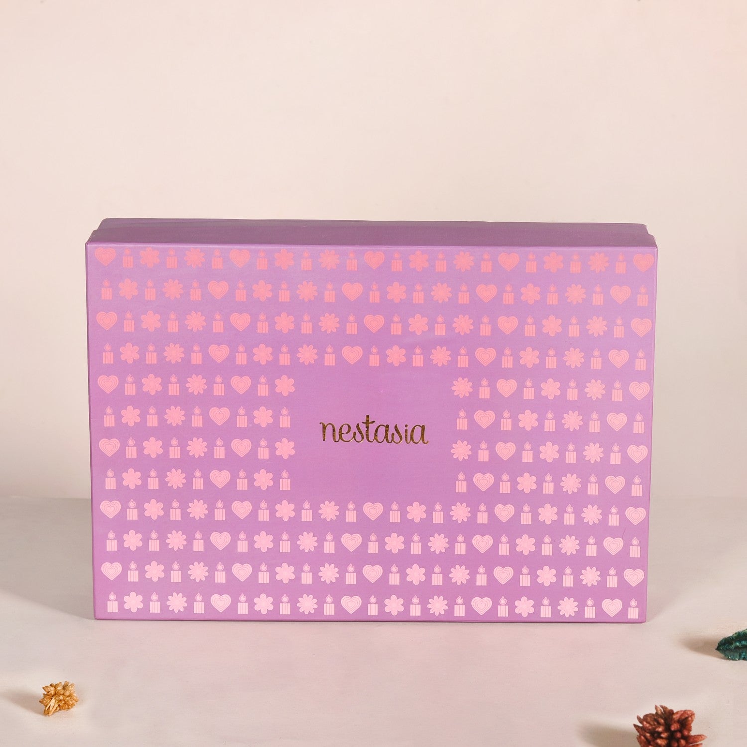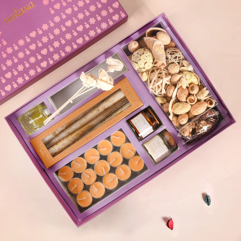 Indulge in the perfect blend of fragrance, light, and elegance with our candle gift hamper. This thoughtfully curated hamper is designed to turn any space into a haven of relaxation and beauty. Wrapped in a stunning purple gift box adorned with charming red motifs, it's a gift that speaks volumes even before it's unwrapped.
