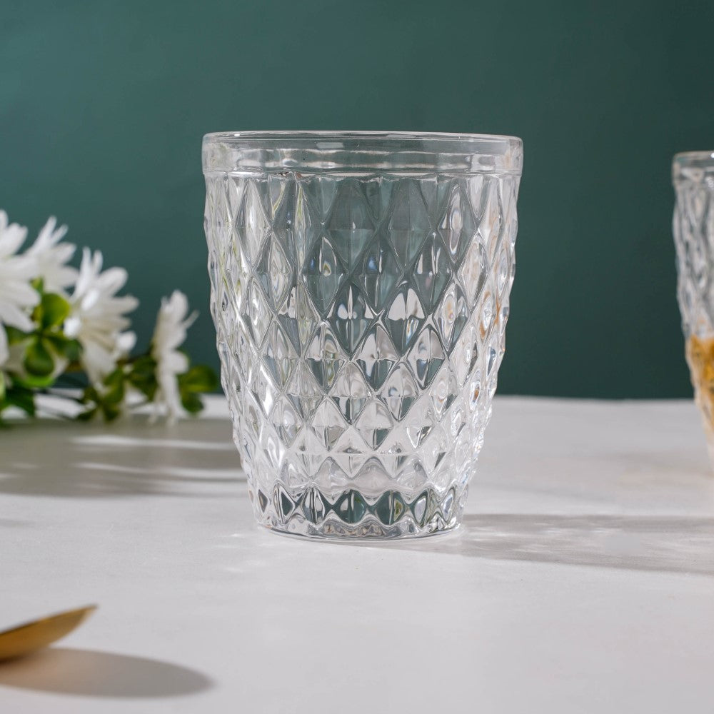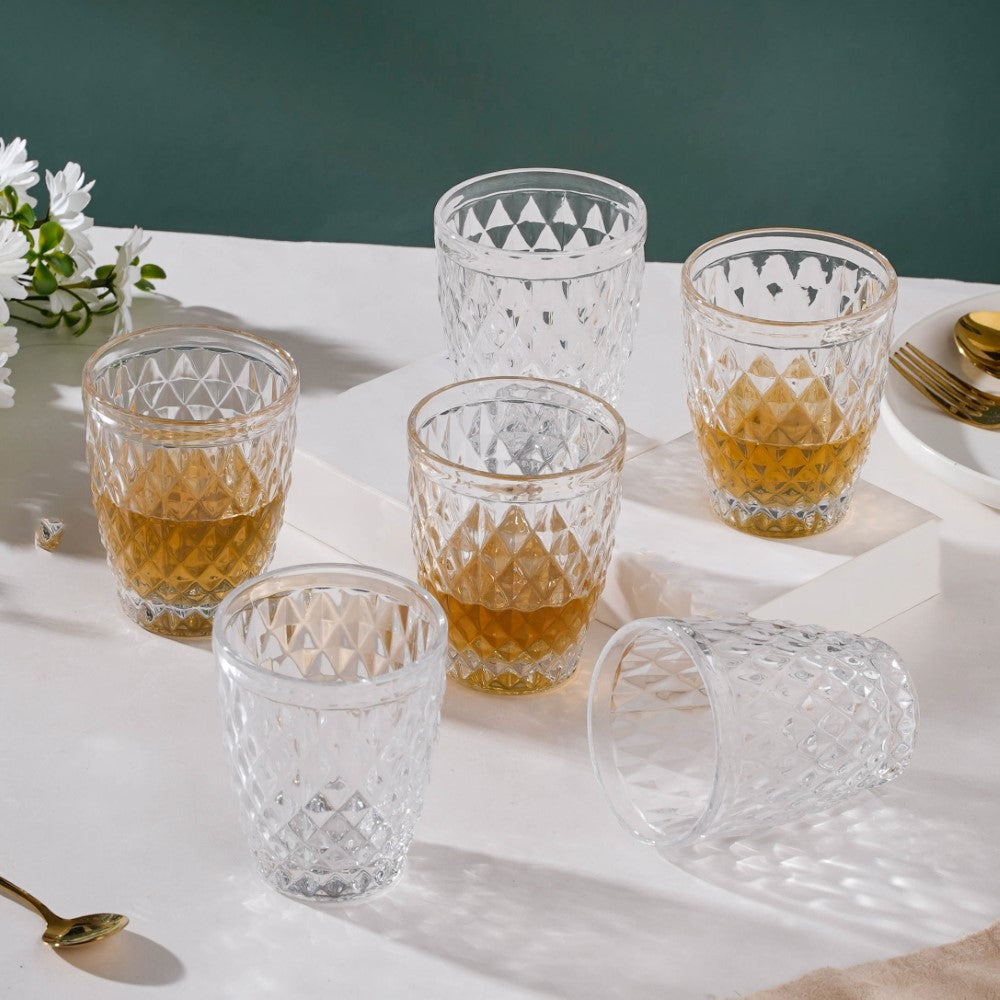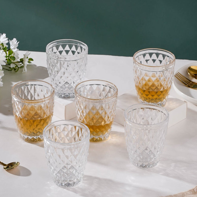 The set of 6 glass tumblers are translucent and feature diamond textures that lend a crystalised look to the glasses. The thick, sturdy, chip-resistant, tempered glass built of the drinkware offers more durability and unparalleled sophistication with its textured surface. The set of 6 glasses will always remain in easy reach whether one is planning to have a smoothie, iced tea, a glass of whiskey on rocks, or water. The glass tumblers work well in both formal and informal setups.