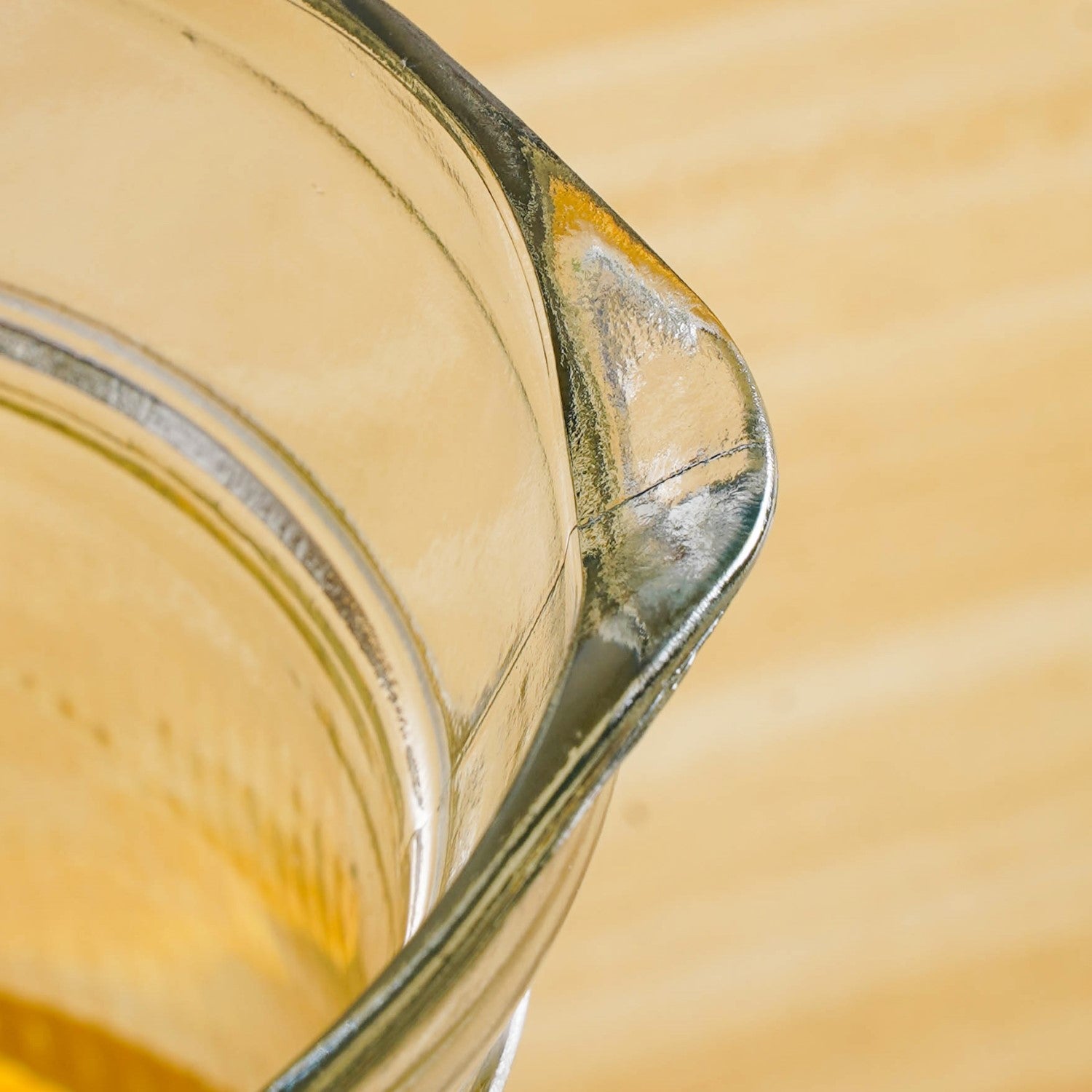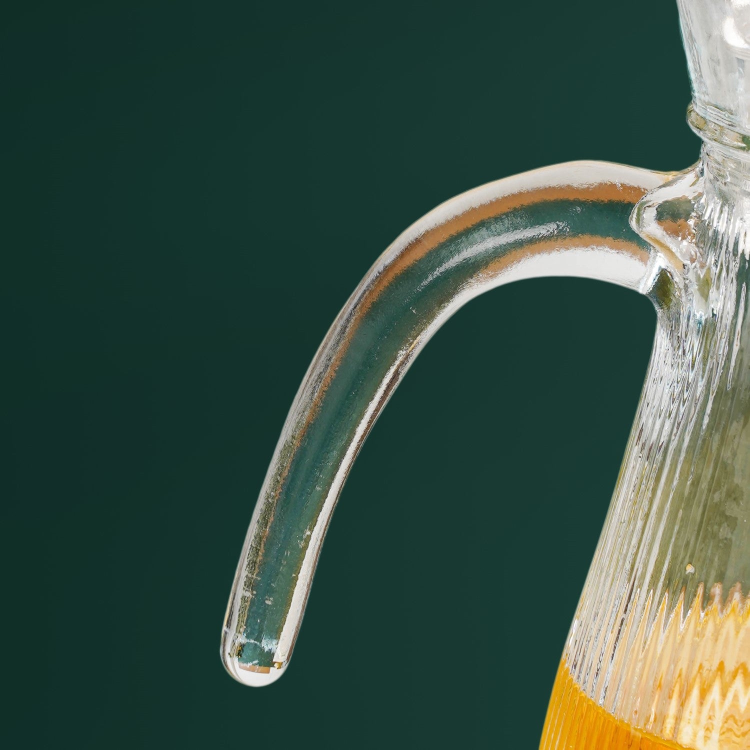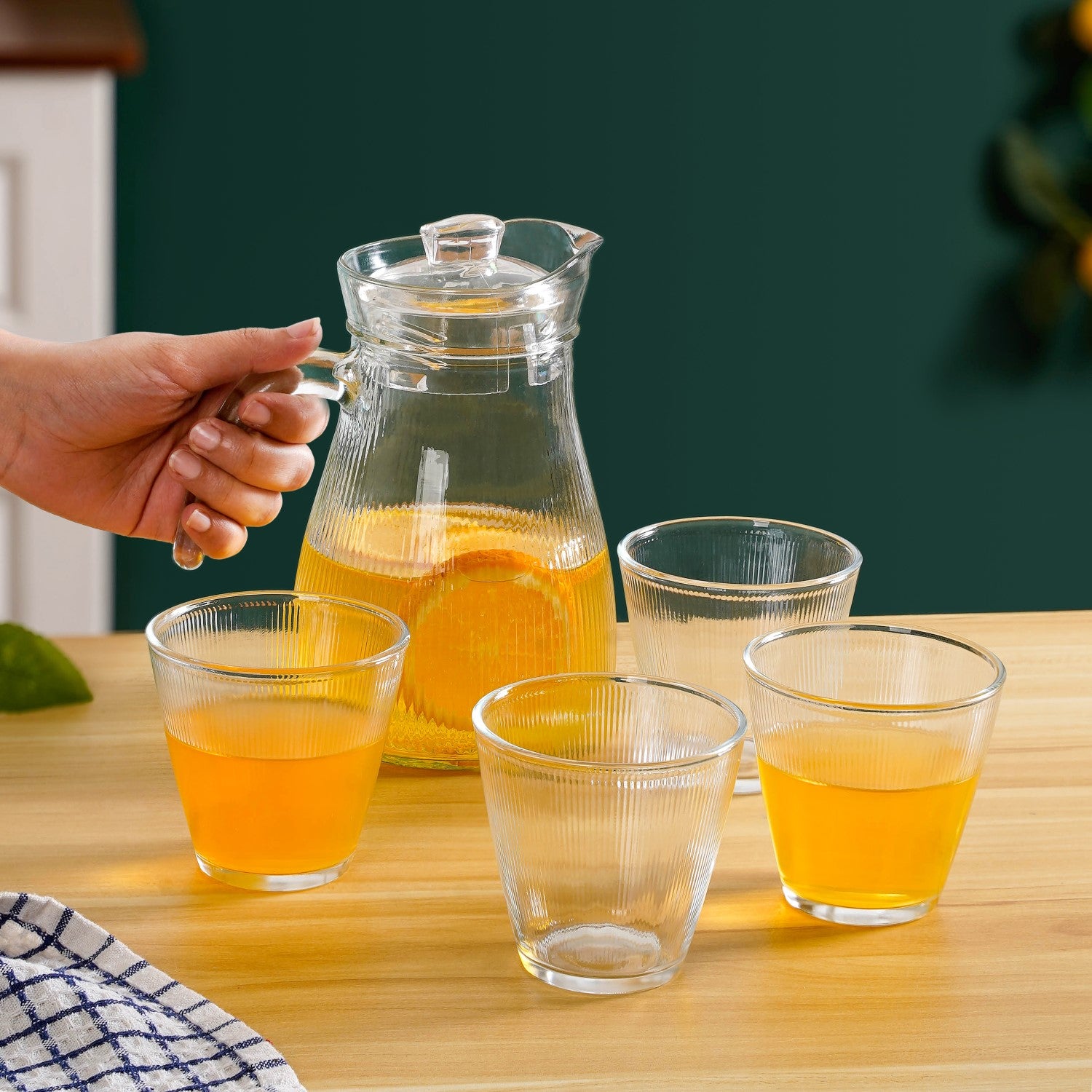 Design: Crafted from premium-quality soda lime glass, this elegant jug set includes a vertically ribbed-textured jug paired with four matching cone-shaped glasses, ideal for serving both hot and cold beverages with flair. The jug features a wide, stable base that tapers smoothly toward the top, complemented by a clear, ergonomic handle that ensures a comfortable grip. While the jug displays its ribbed texture on the outside, the soda lime glasses feature the same design on the inner surface, offering a distinct yet coordinated aesthetic. The crystal-clear finish allows drinks like iced tea, fruit water, or fresh juice to shine through with vivid clarity.