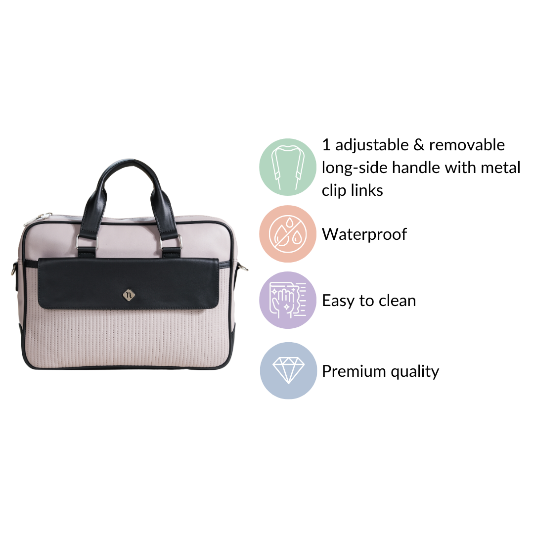 Cleaning this laptop bag is a hassle-free process due to its easy-to-clean, vegan leather build. You can use a soft, dry cloth or a brush with gentle bristles to do this. For more stubborn stains or dirt, dampen a clean, soft cloth with water. Wipe the affected area gently until the stain or dirt is removed. Avoid using harsh chemicals or excessive water, as this may damage the vegan leather. After cleaning, make sure to dry the bag thoroughly. Allow it to air dry at room temperature, away from direct sunlight or heat sources. Avoid using a hairdryer or heater to speed up the drying process, as it can affect the material.