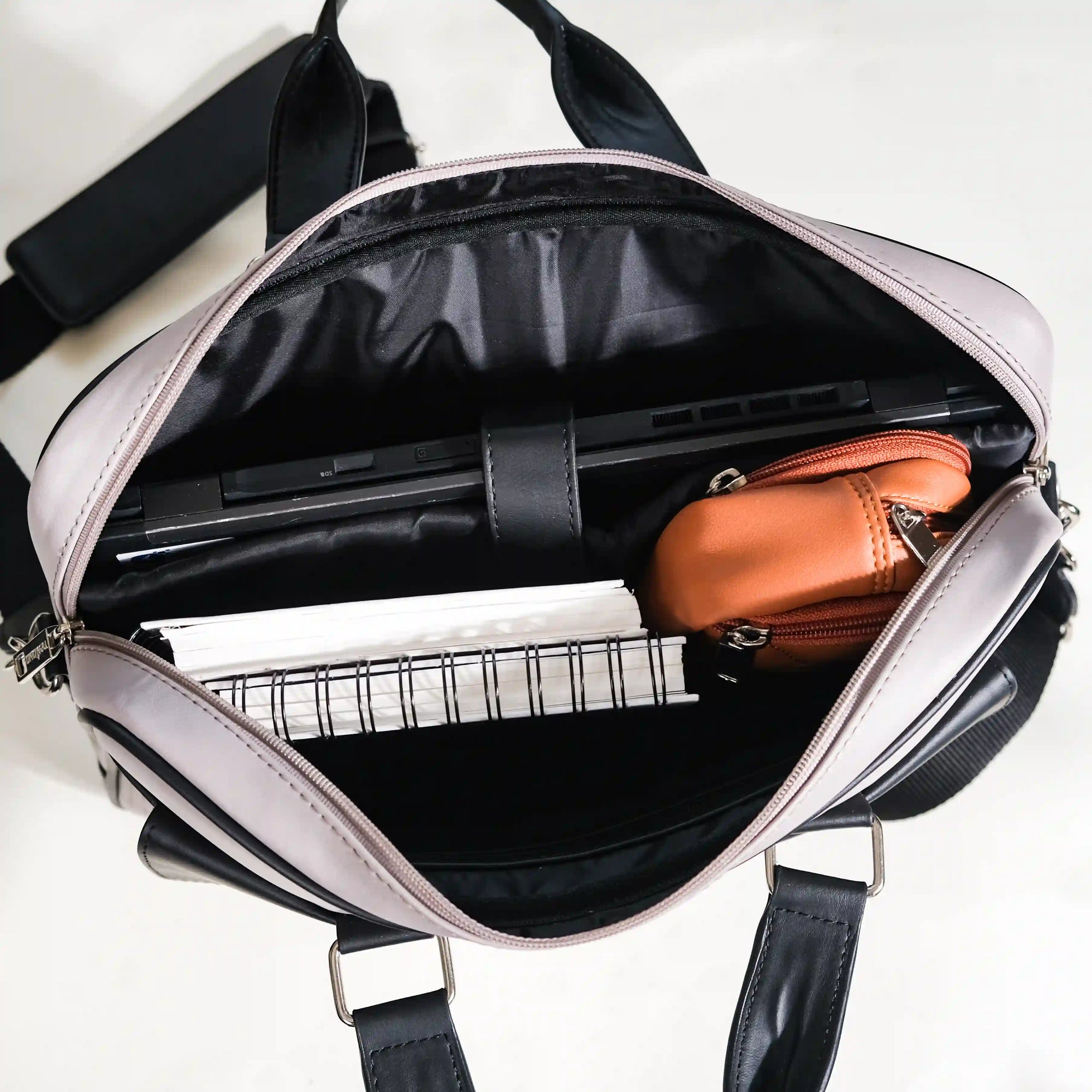 Yes, this laptop bag is designed with your organisation needs in mind. It features several interior pockets for efficient organization. The small interior pockets are perfect for storing smaller items such as your smartphone, keys, pens, or accessories. They help keep these essentials readily accessible and prevent them from getting lost in the larger compartments. Whereas the spacious big interior pocket is ideal for carrying notebooks, documents, folders, or other larger items you may need for work or use daily. It ensures that your important papers remain organized and protected.