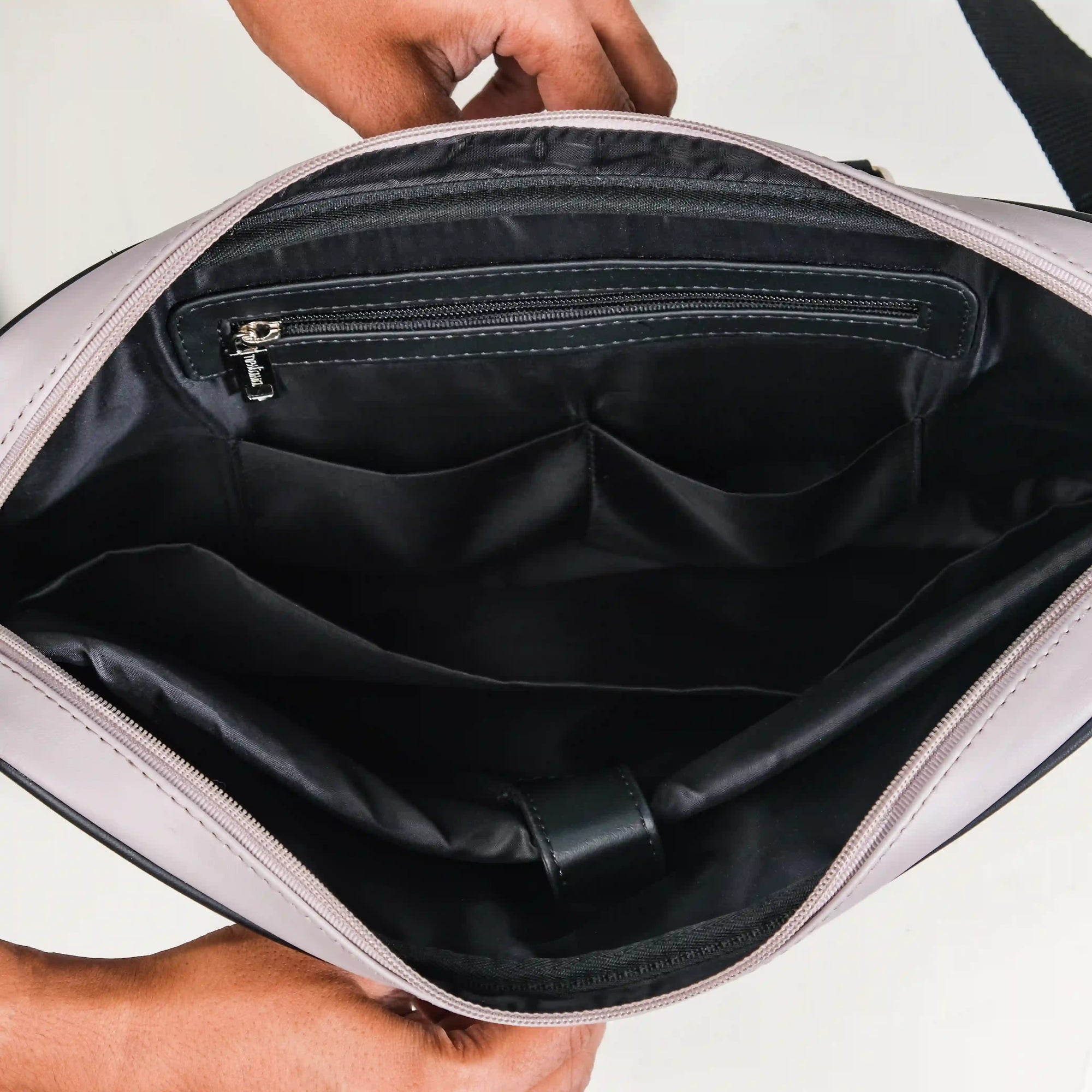 Our vegan laptop bag is more than just an accessory; it's a statement of your commitment to sustainable fashion. Crafted from luxurious vegan leather, it offers a smooth and reliable zipper enclosure, ensuring your belongings are secure while radiating an aura of modern elegance. Practicality meets style with a cushioned front pocket equipped with a magnetic closure, granting quick access to your essentials. Inside, the bag boasts two small interior pockets, a spacious main compartment, and a small zipper interior pocket, allowing you to stay organized during your busy day.