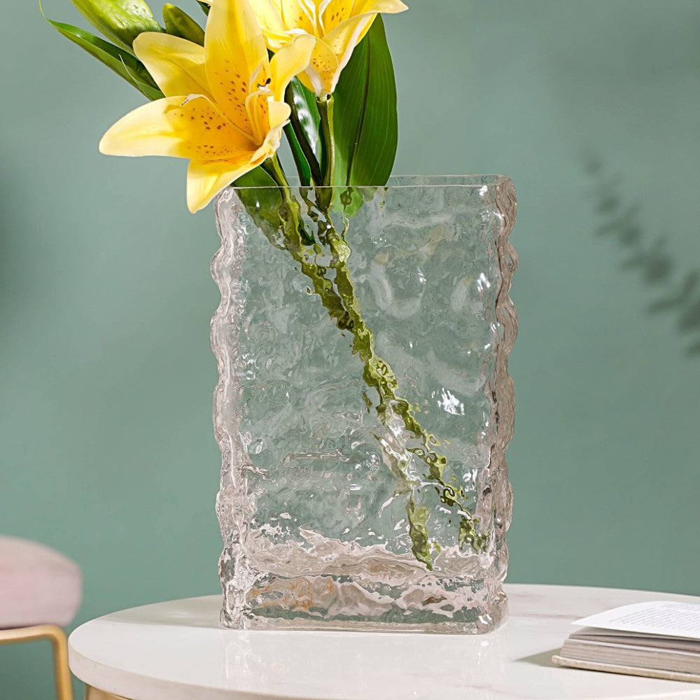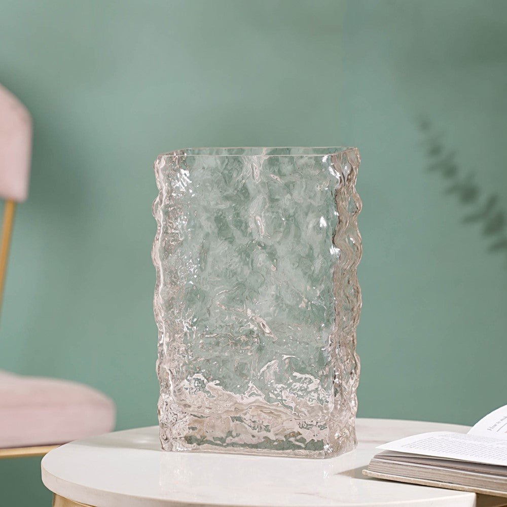 The contemporary textured glass vase is an exquisite decor accent that embodies the essence of modern design while adding a touch of elegance and sophistication to any space. The glass vase features a uniquely glacial frost/running water textured surface at the top that is eye-catching and nature-inspired. The vase's surface has been masterfully crafted giving it a pattern that cascades down the sides in a mesmerizing display of organic movement. Whether used as a standalone piece or with a beautiful arrangement of fresh flowers, the frosted glass vase is an excellent choice to grace a formal dinner table setup or an informal get-together with friends.