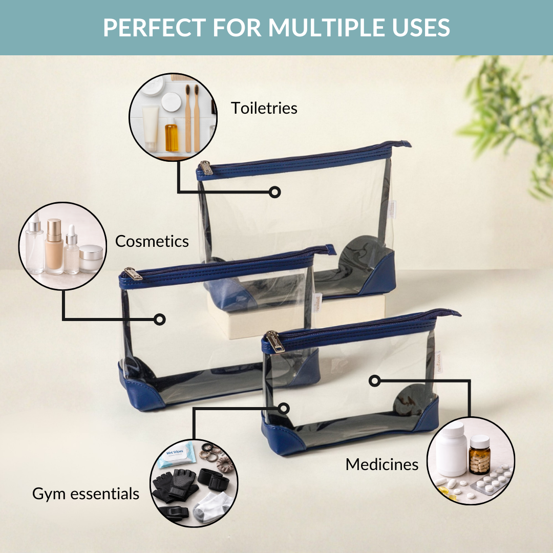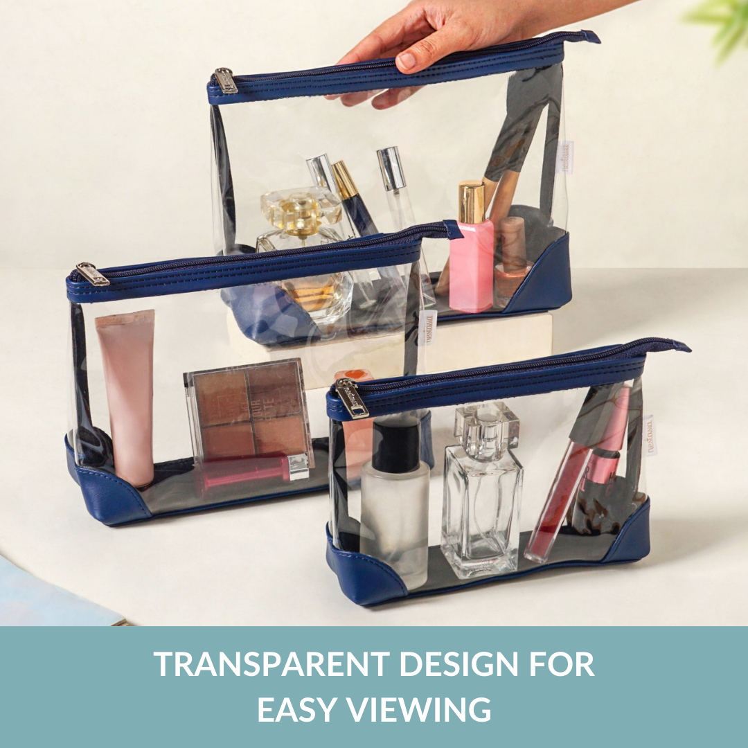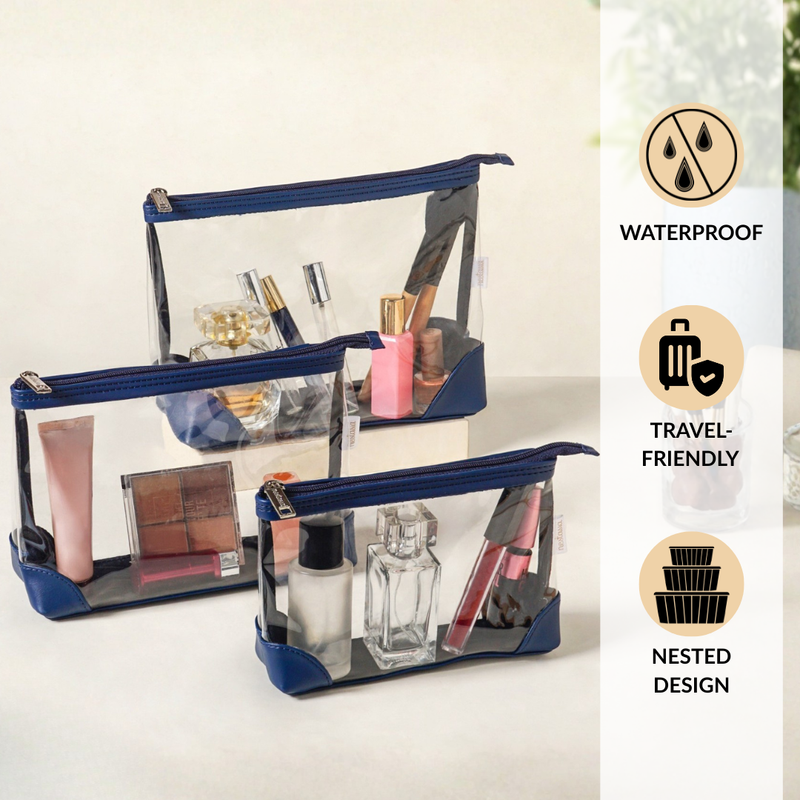 Design: Crafted from premium vegan leather and clear PVC, this nested travel pouch set comes in three practical sizes with smooth zipper closures. The transparent body paired with blue details allows quick visibility while adding a clean, modern look.
