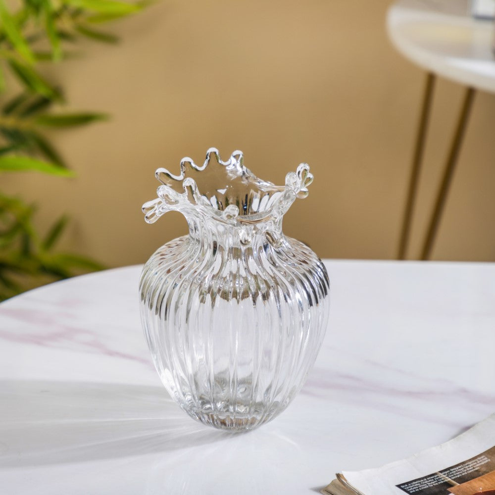 Adorn the home with understated elegance using the glass vase. The vase has a ribbed textured bulbous form, while the mouth has a unique 'water splash' design inspired by the crashing of waves by the seaside. The translucent glass vase combines eclectic and contemporary elements to help present flowers beautifully. The decorative vase inspired by natural elements also makes for a great gifting option for housewarming and birthdays. Whether placed as a centrepiece with flowers or at the corner table to brighten up the space, the vase sits atop elegantly with the ribbed vase's sturdy form.