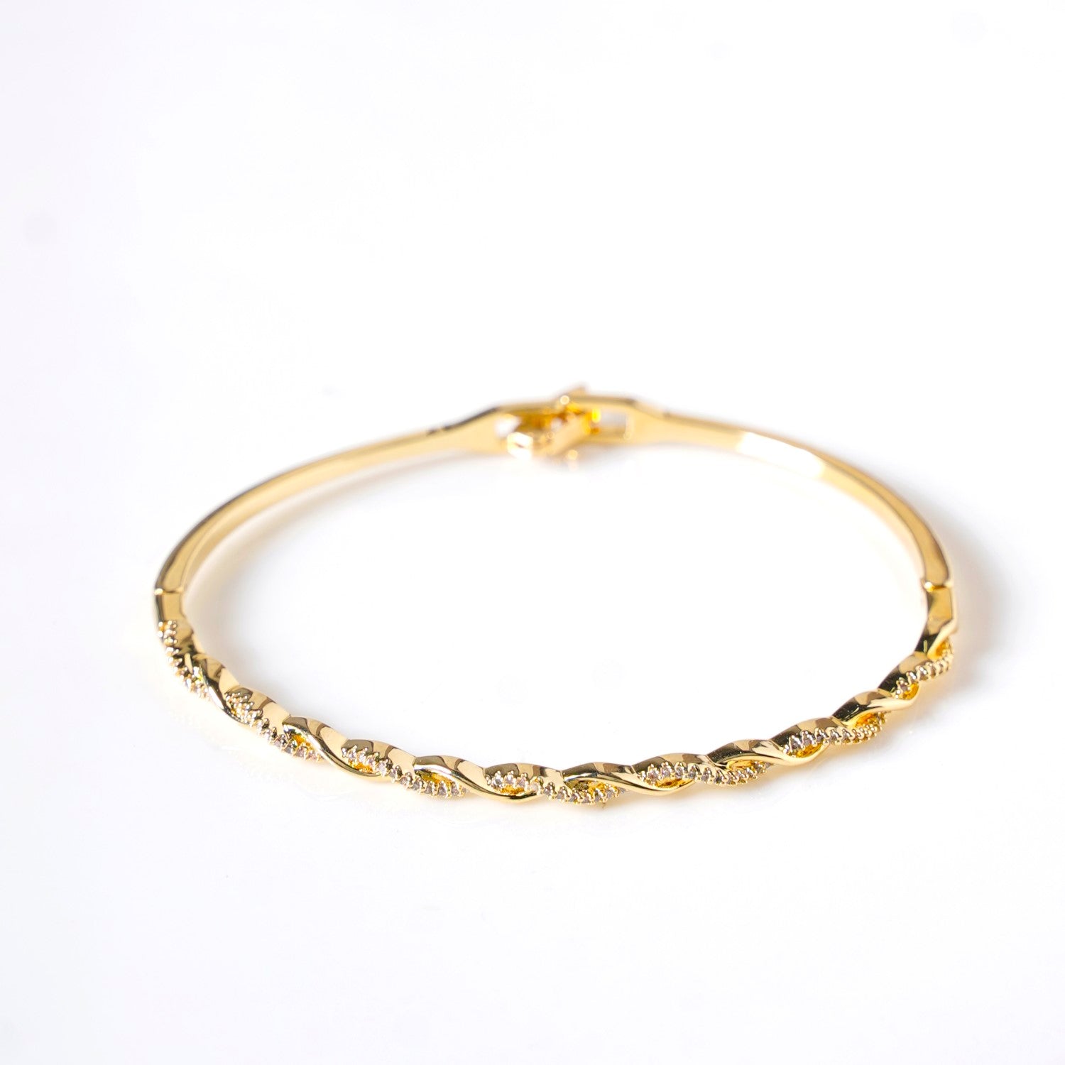 This swirl of elegance in the gold bracelet is a stunning testament to the beauty of movement and detail. Its front features a graceful interplay of two layers - one a polished, radiant gold, and the other adorned with delicate stone studs, adding a touch of sparkle with every turn. The swirling design flows with fluidity, capturing light and attention in equal measure.
